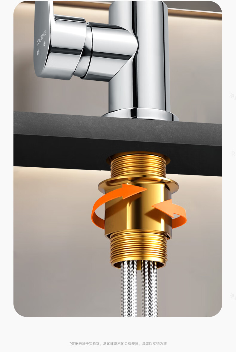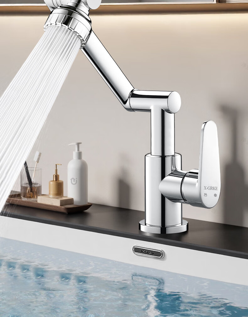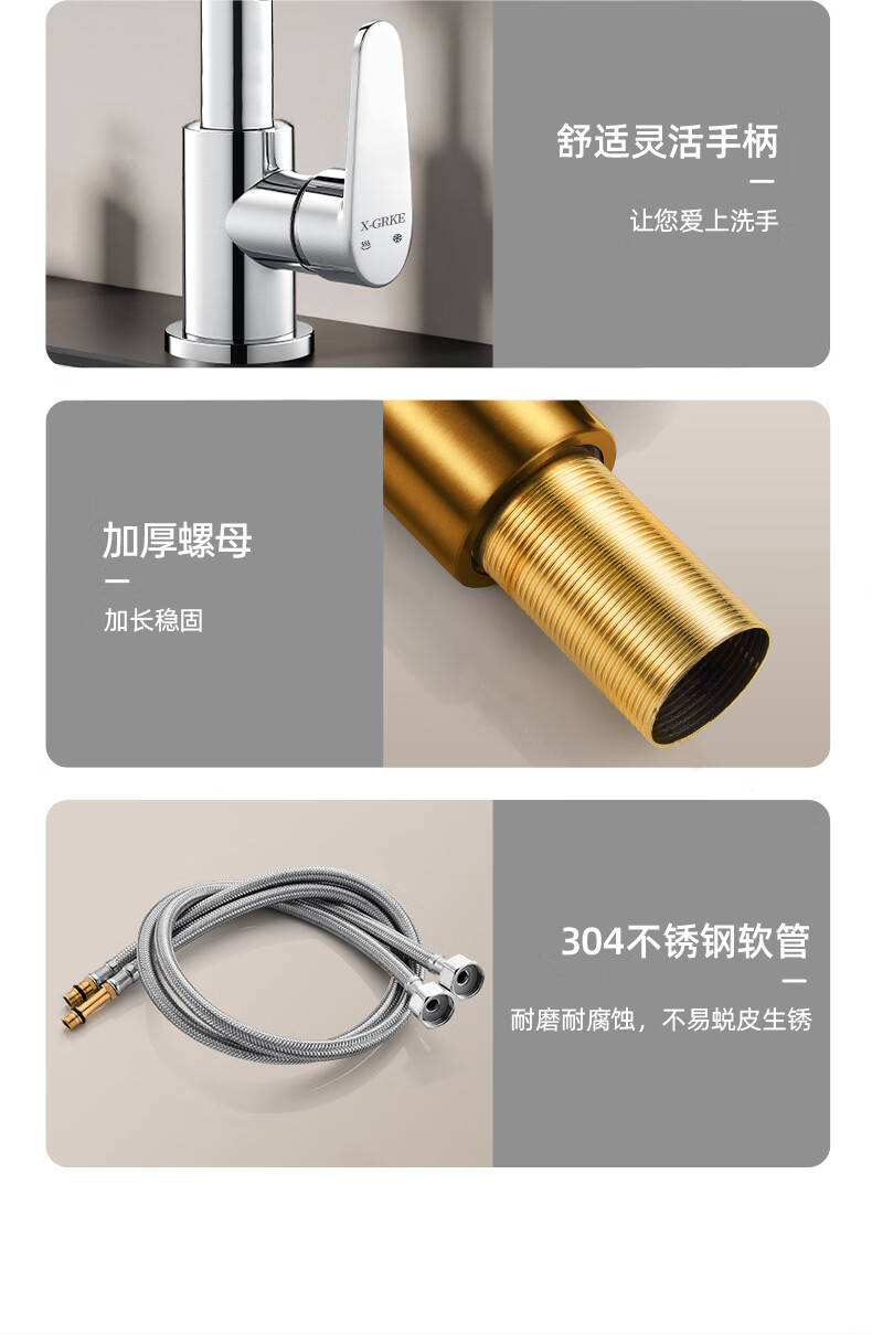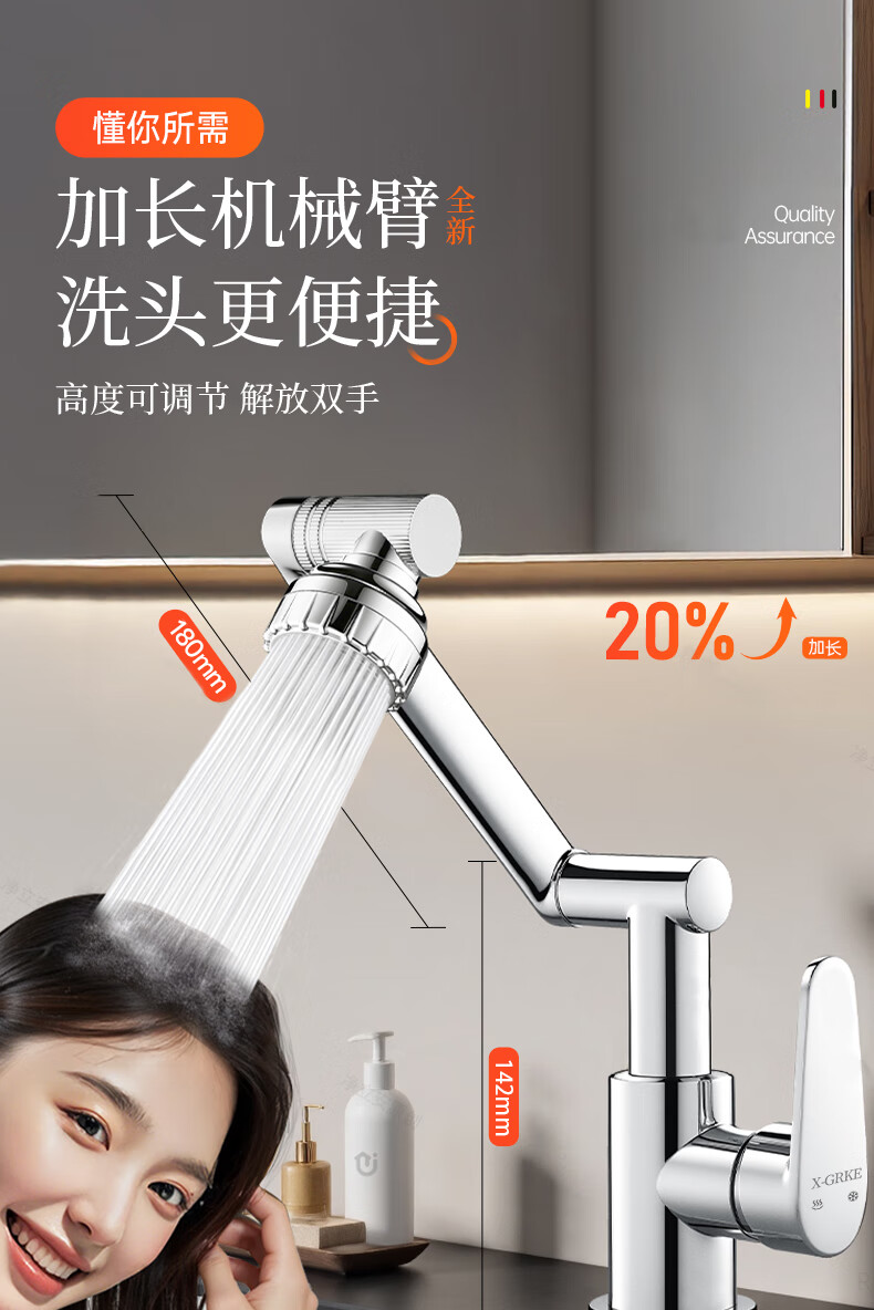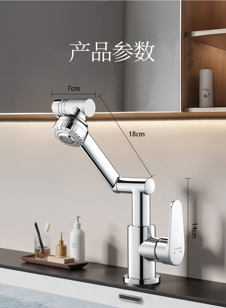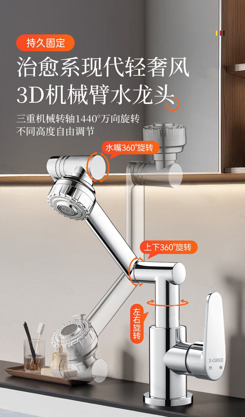 X-GRKE【德国】全铜主体水龙头洗脸盆面盆洗手盆池台盆机械臂冷热龙头 电镀银【全铜主体】万向机械臂龙头 配80CM304不锈钢管丨漏水包退换