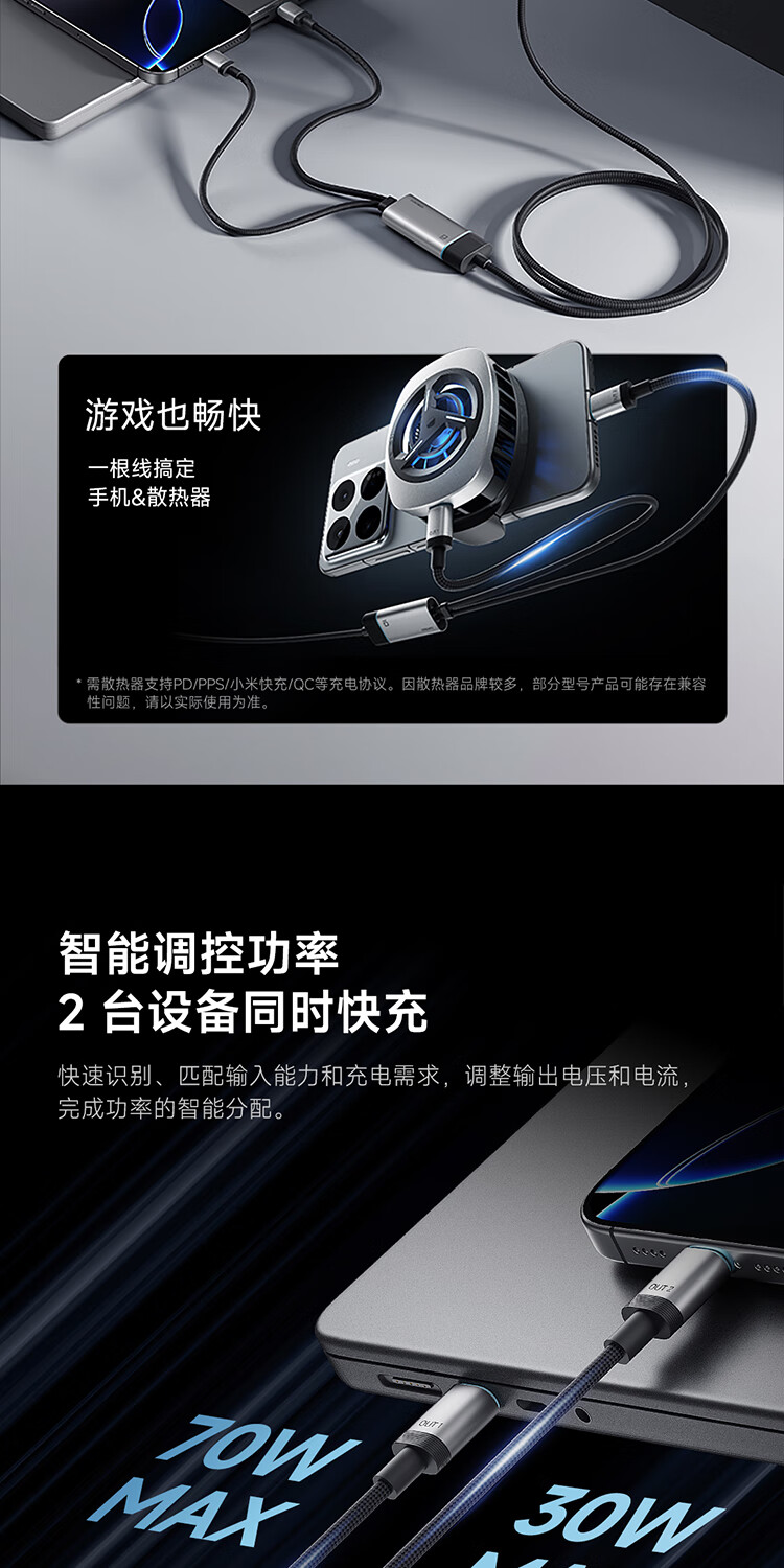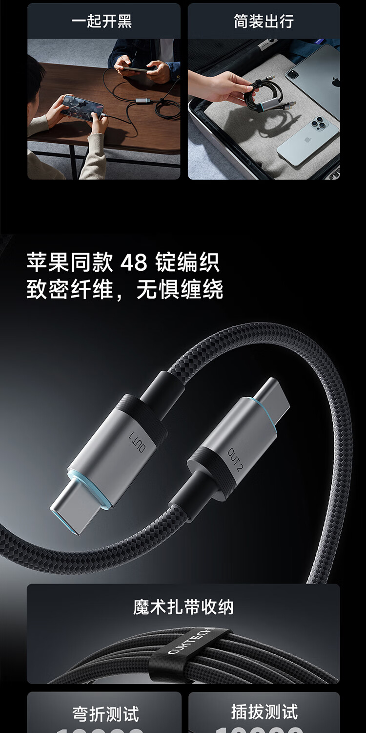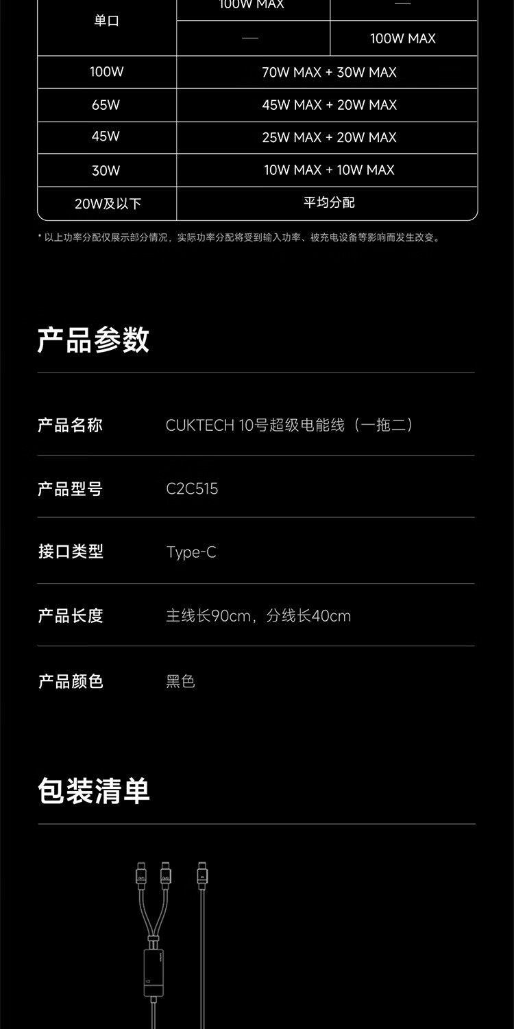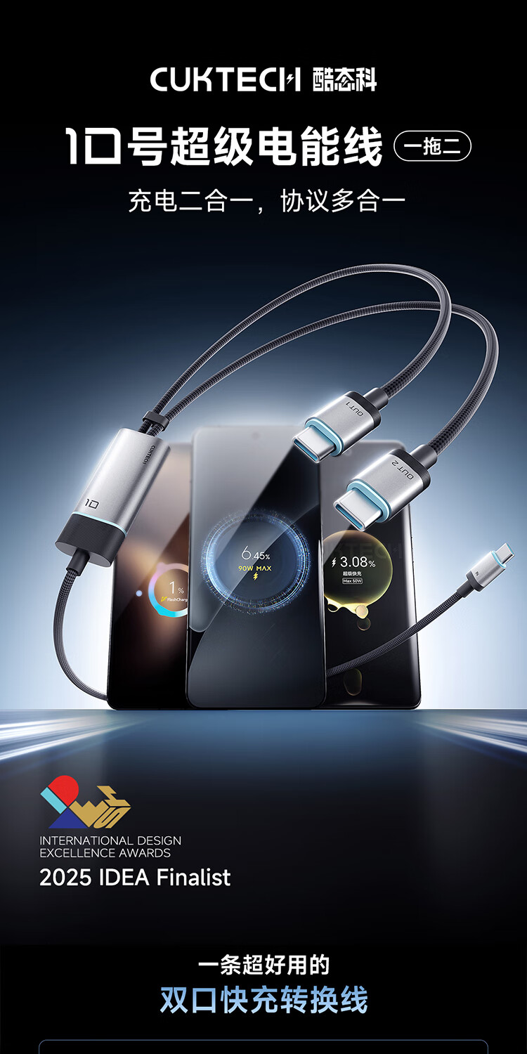 CUKTECH酷态科10号超级电能线type-c数据线一拖二快充100W充电线cto2c适用小米/三星/苹果17/16手机笔记本