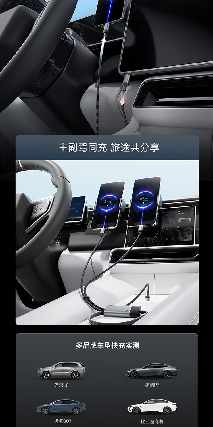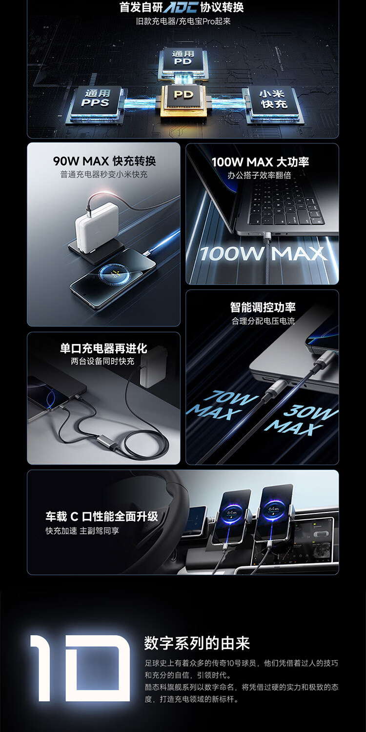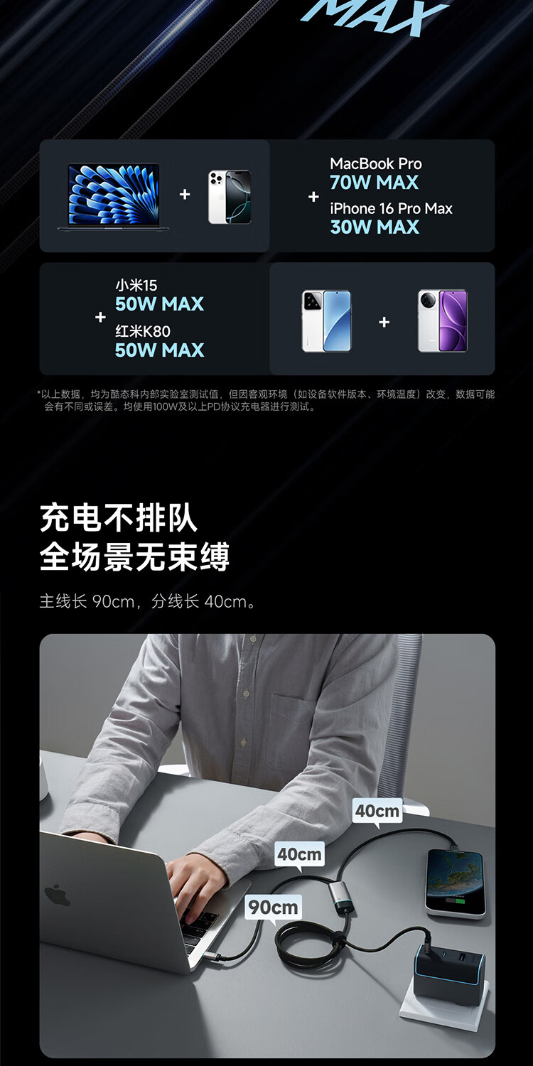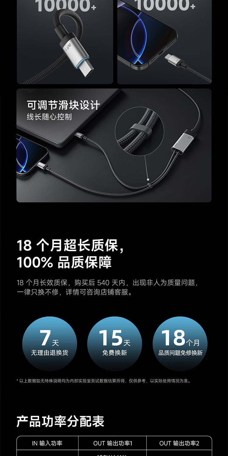 CUKTECH酷态科10号超级电能线type-c数据线一拖二快充100W充电线cto2c适用小米/三星/苹果17/16手机笔记本