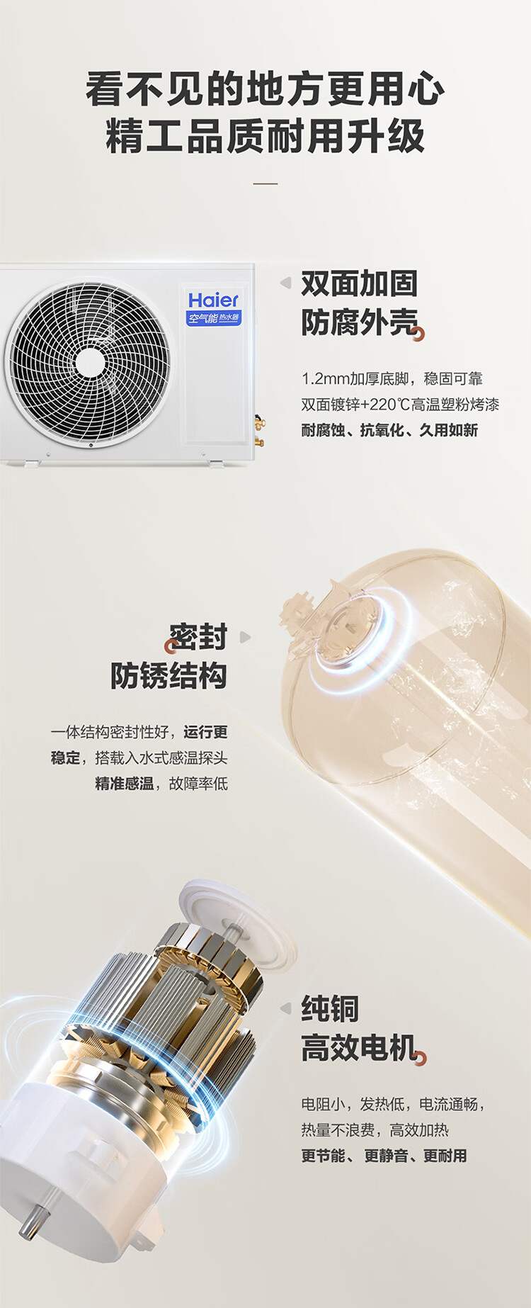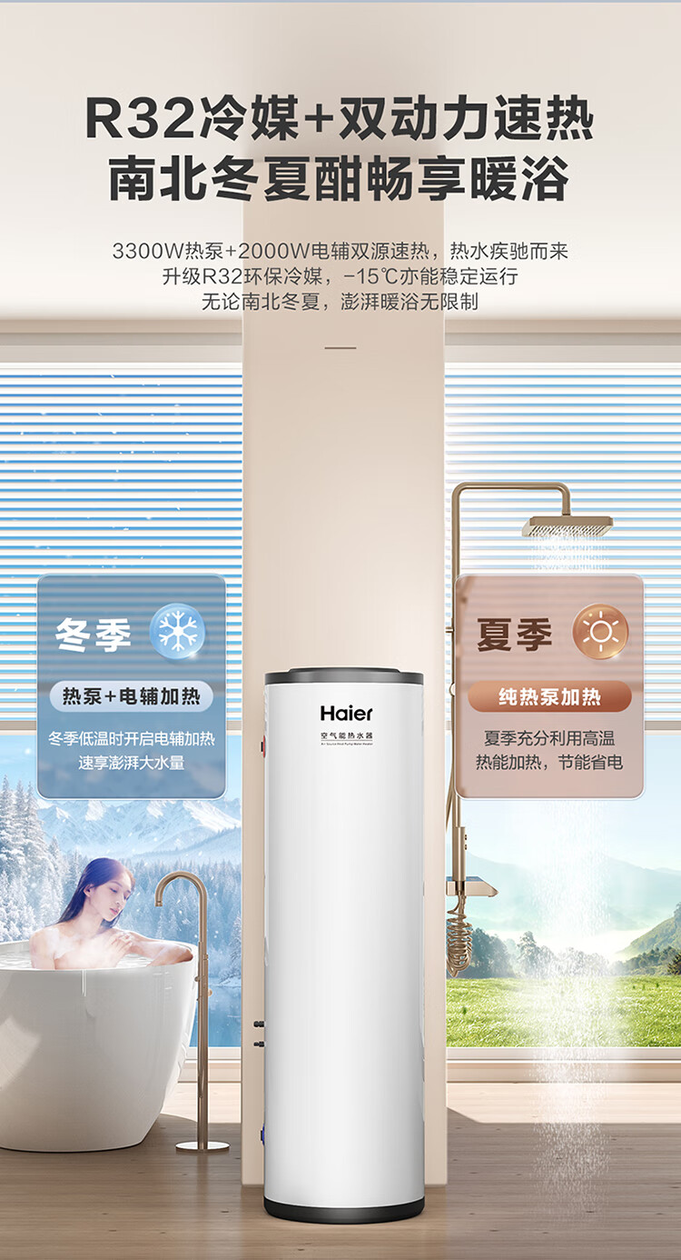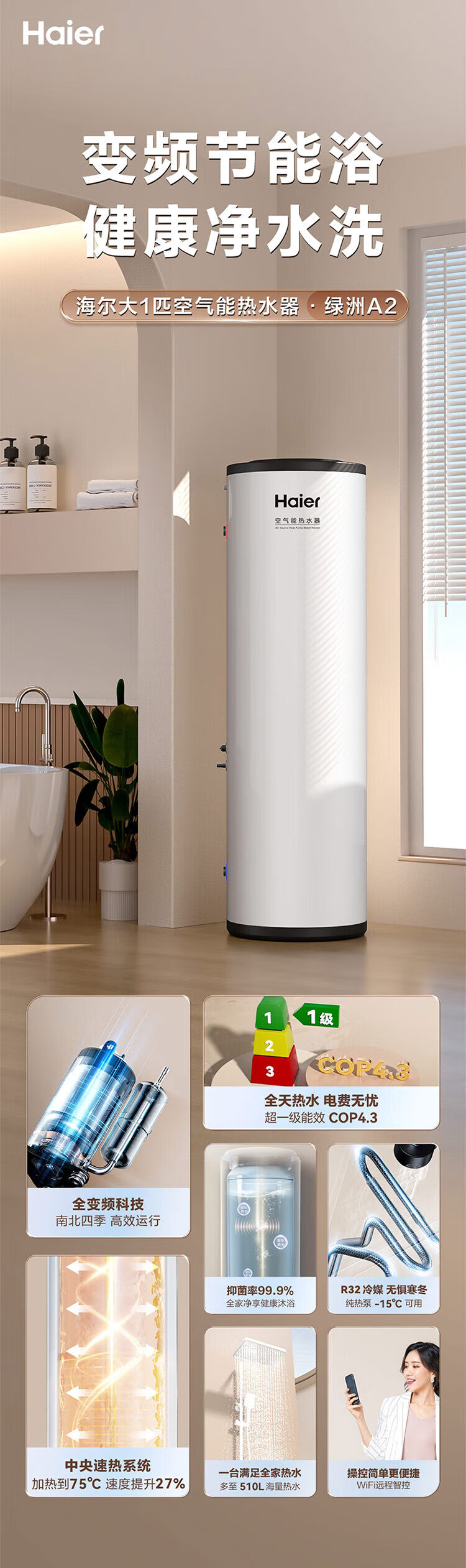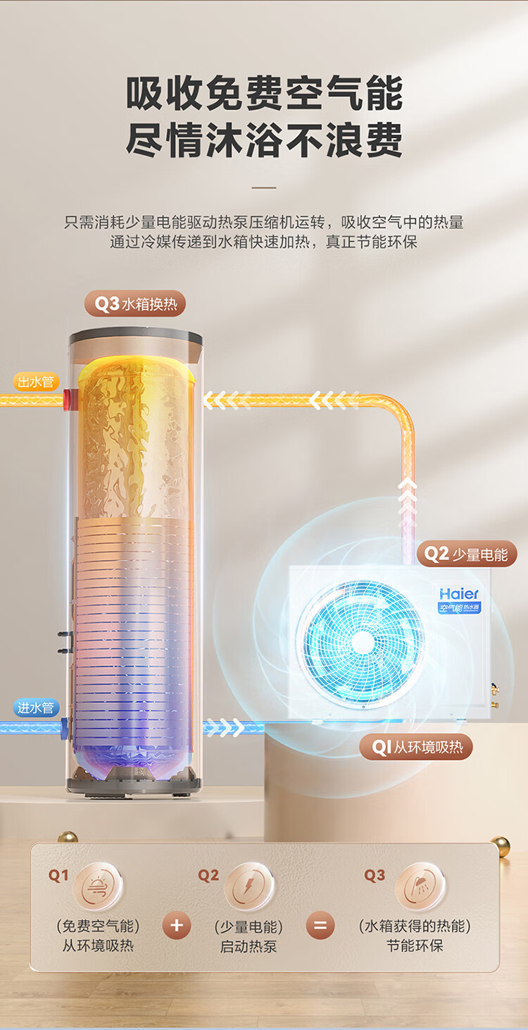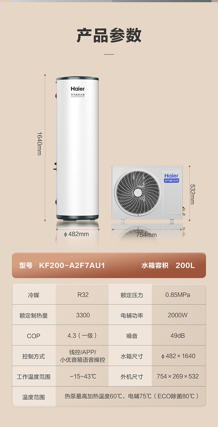 海尔(Haier)空气能热水器200升热泵超一级能效变频省电高效速热1.5匹电辅80℃高水温R32冷媒 KF200-A2F7AU1
