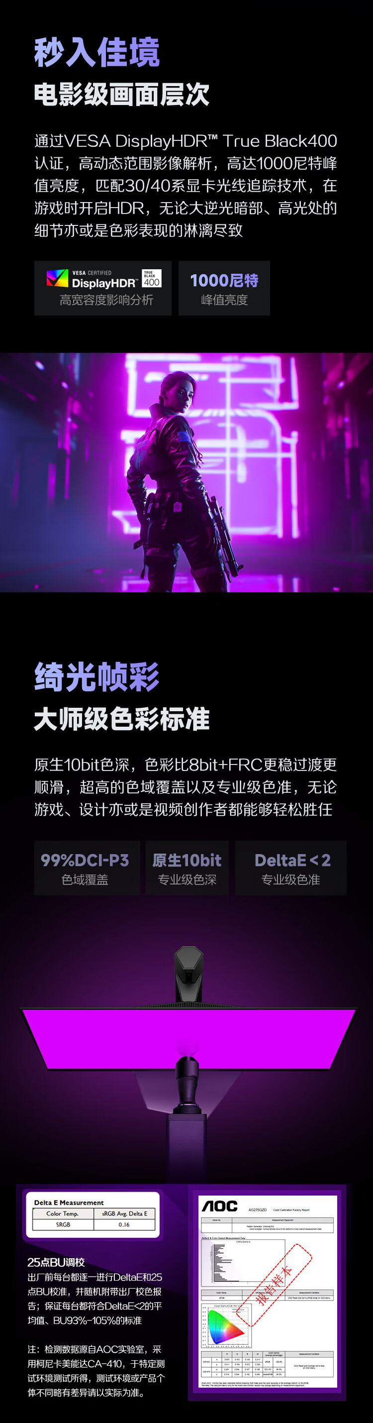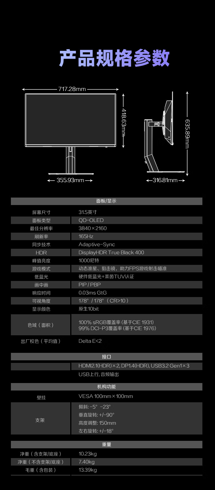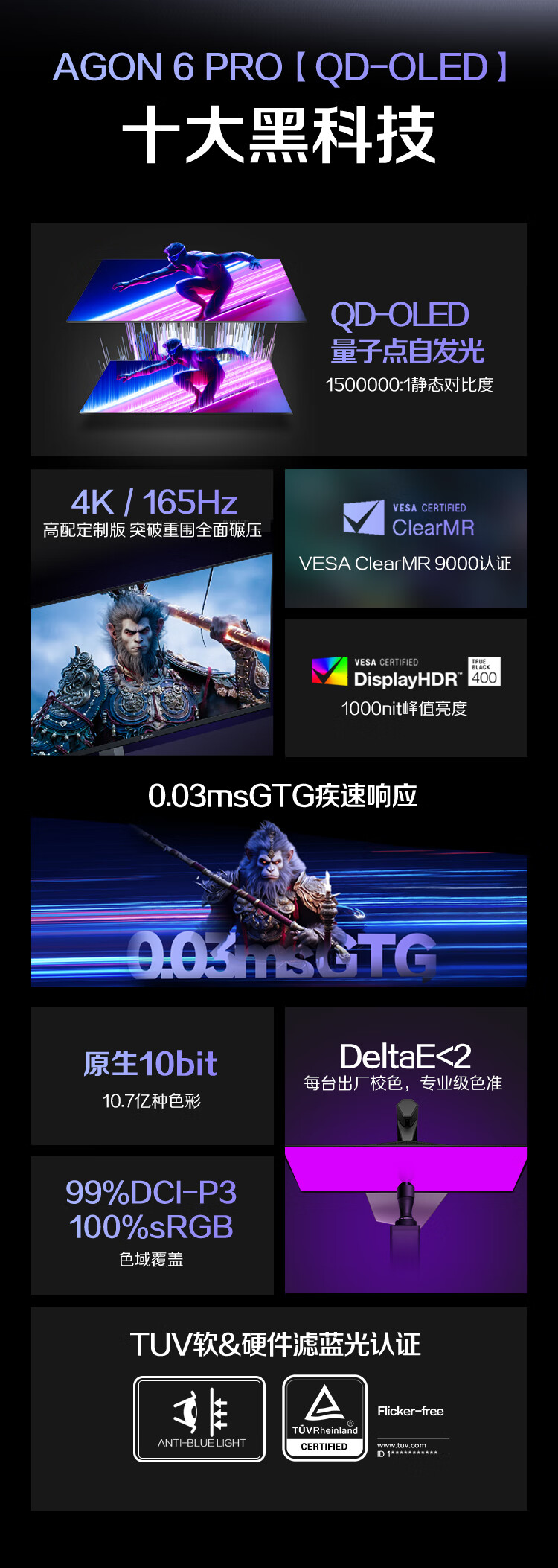 AOC 爱攻31.5英寸4K QD-OLED 165Hz 0.03ms 原生10bit 硬件低蓝光 8W音响 PS5游戏电竞显示器AG326UD
