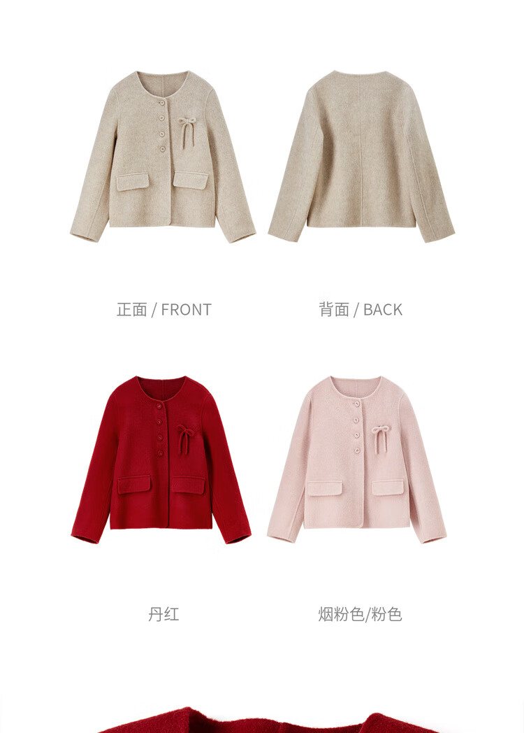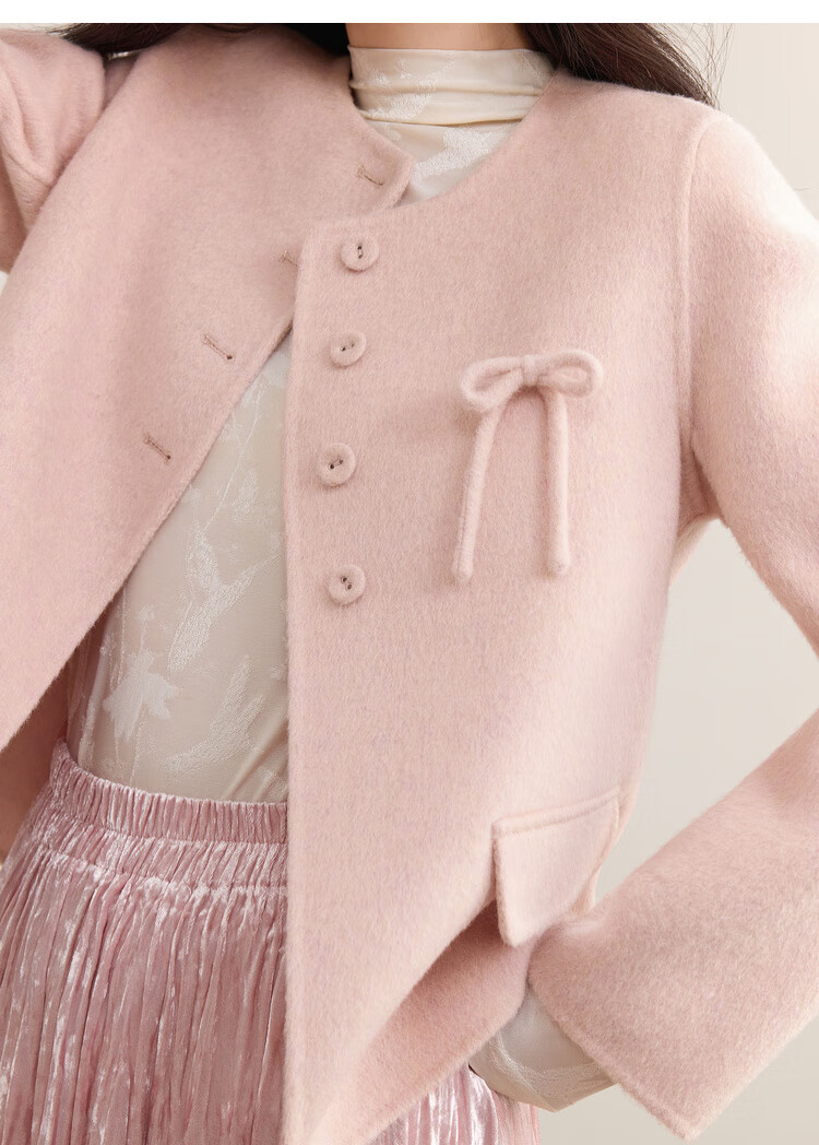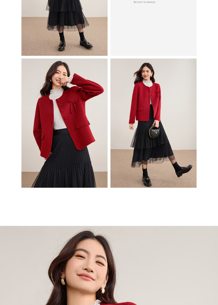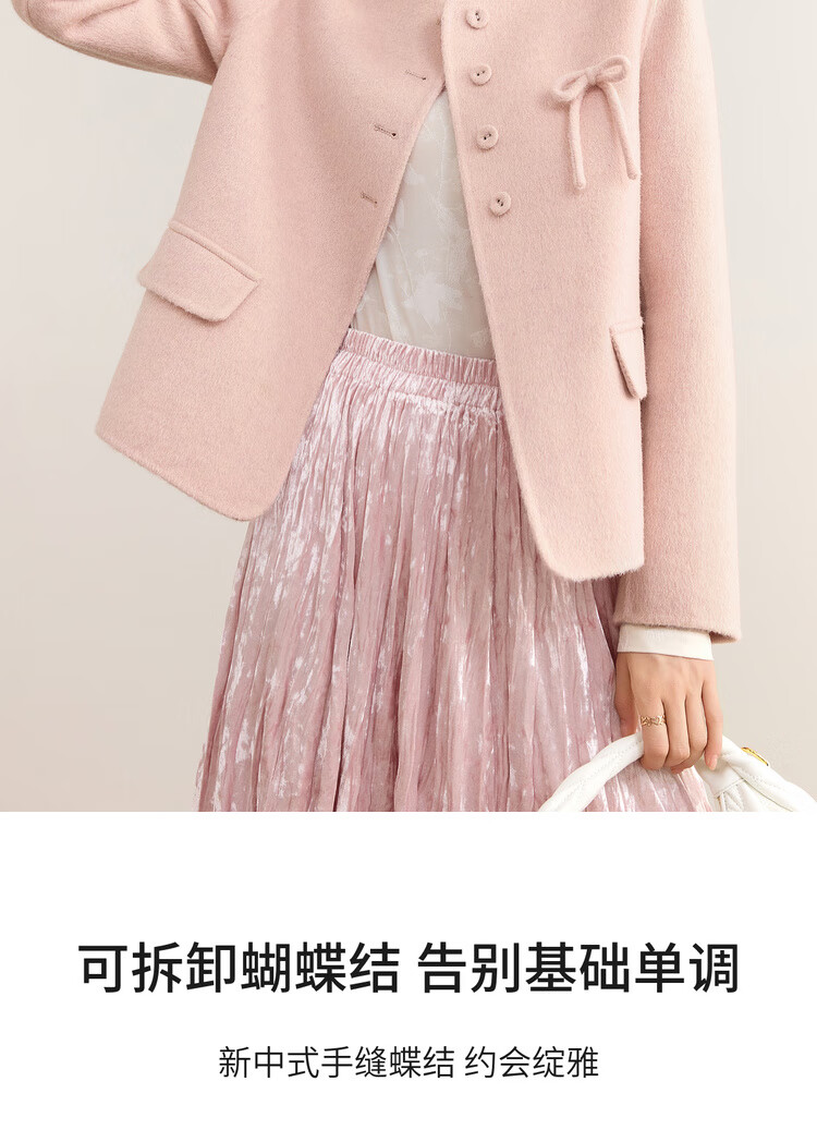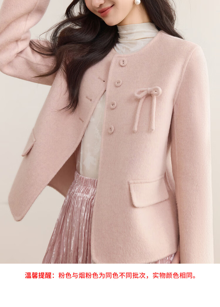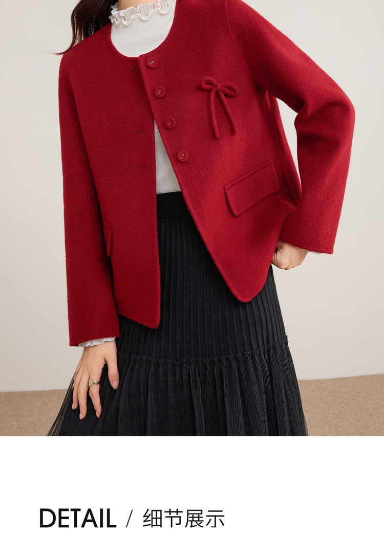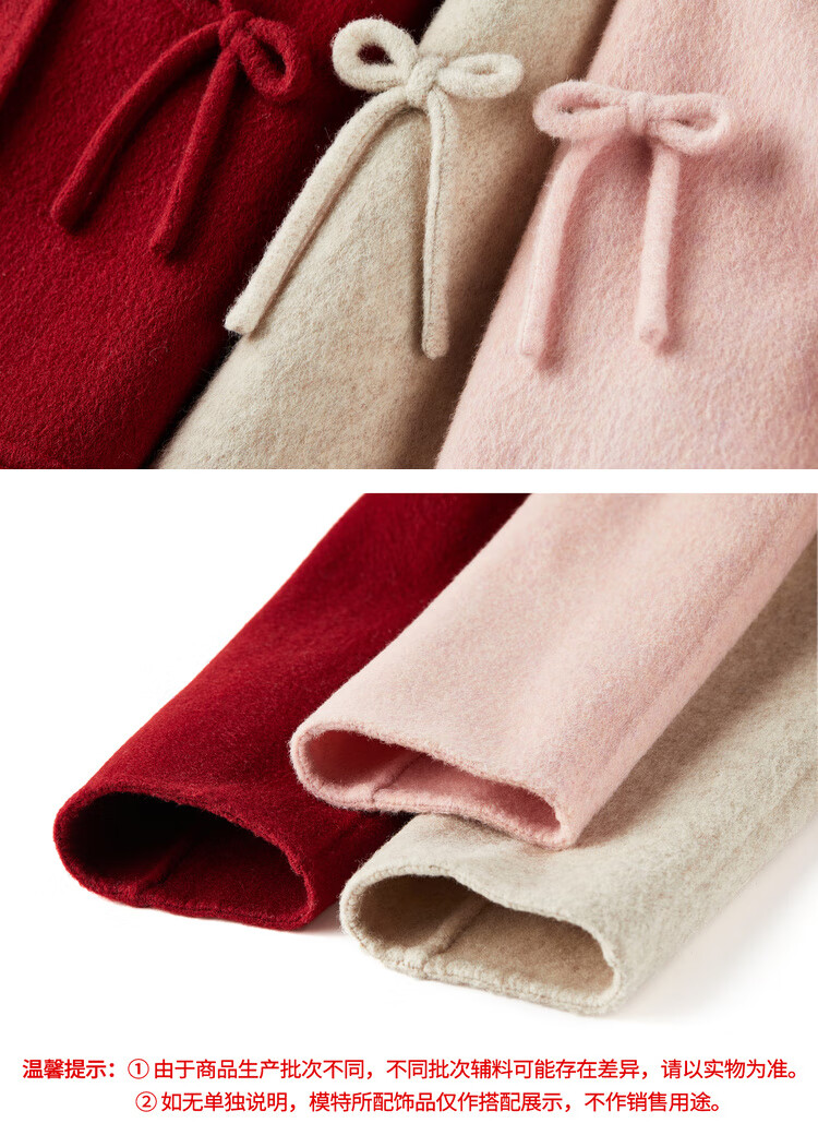 尚都比拉纯绵羊毛保暖毛呢大衣女冬季圆领新中式蝶结双面呢外套长袖大衣