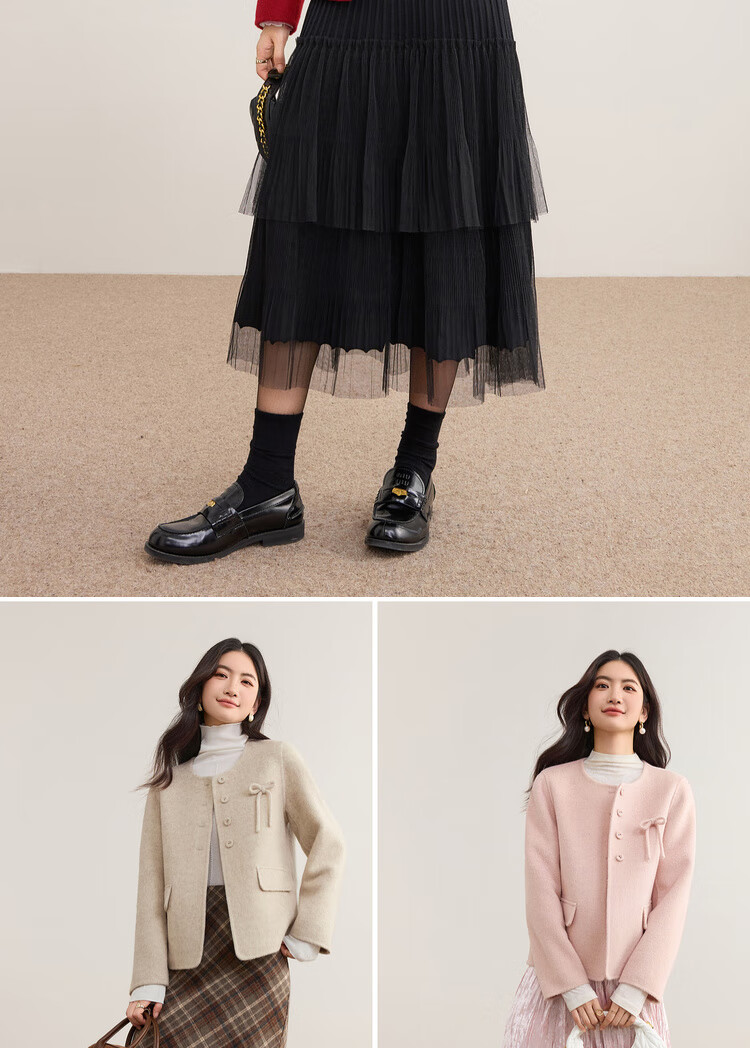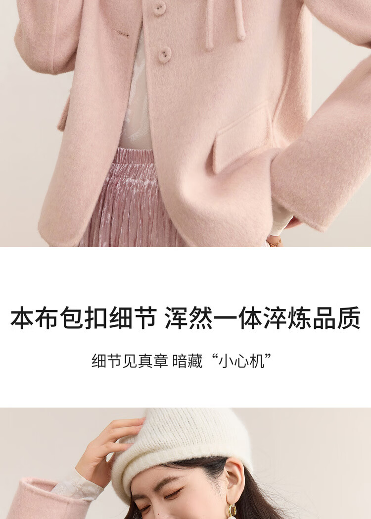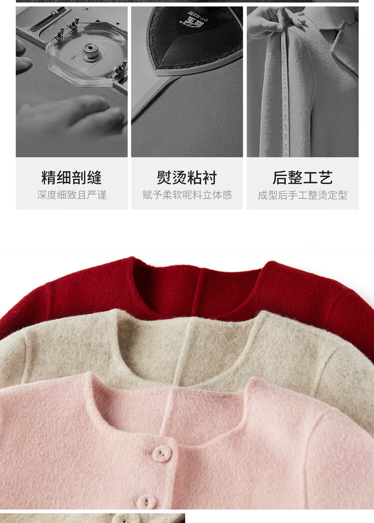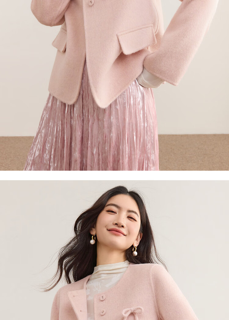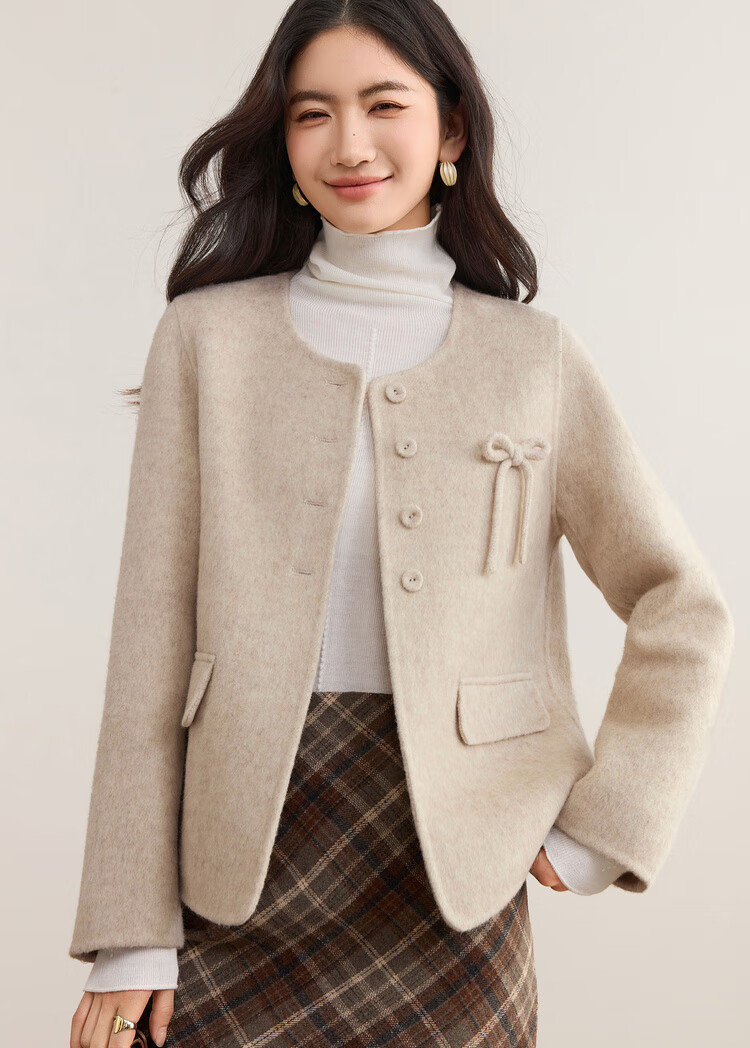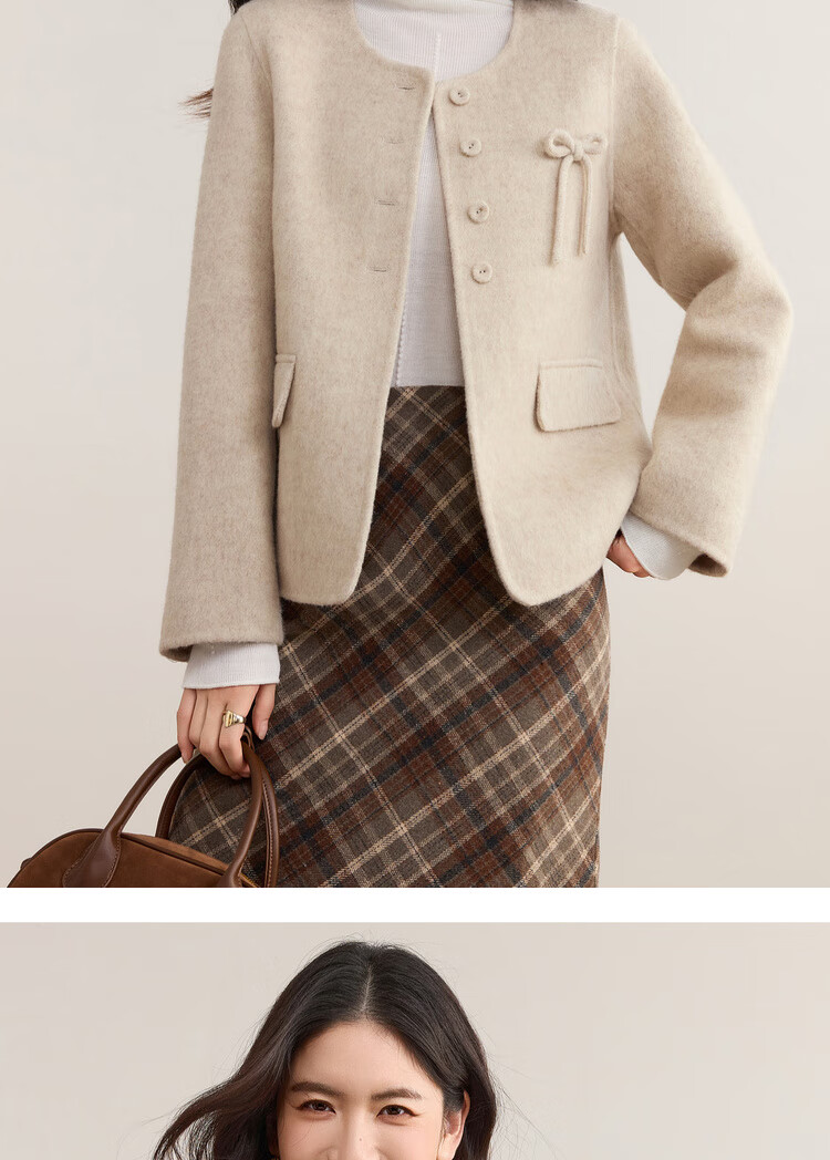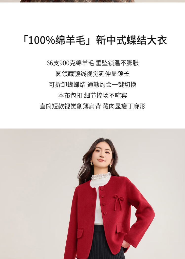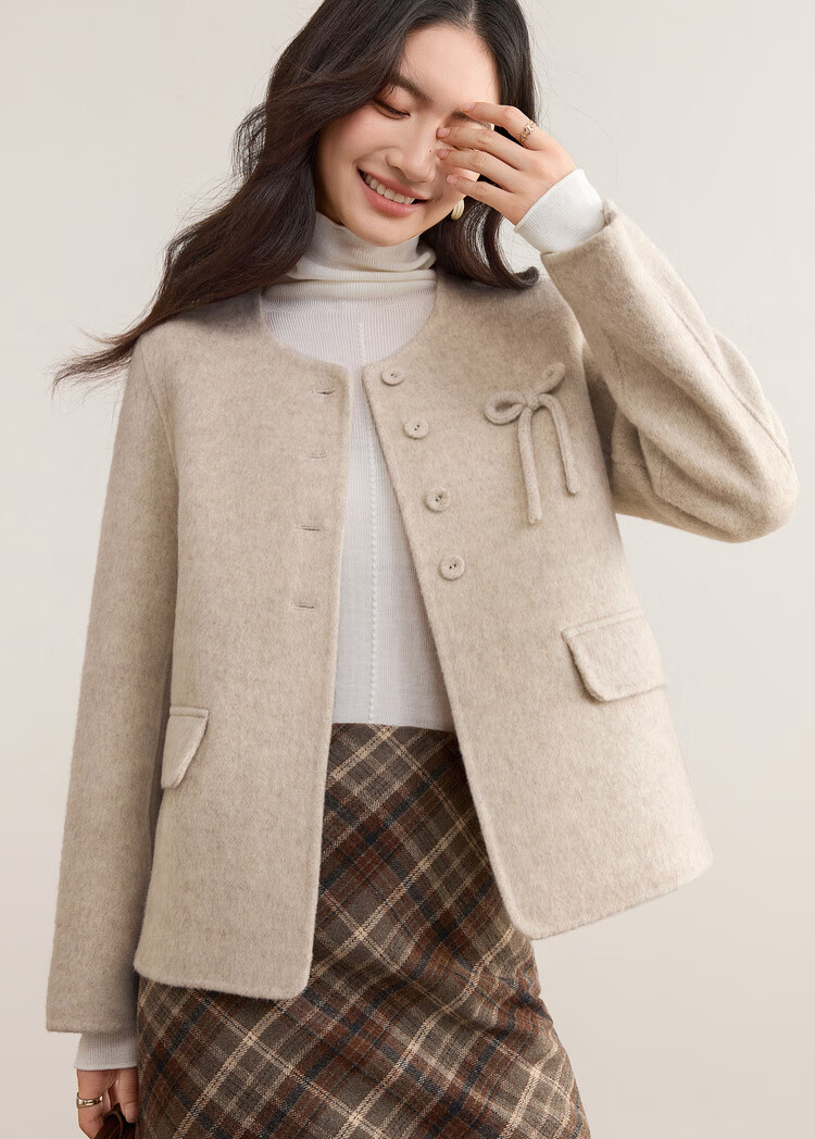 尚都比拉纯绵羊毛保暖毛呢大衣女冬季圆领新中式蝶结双面呢外套长袖大衣