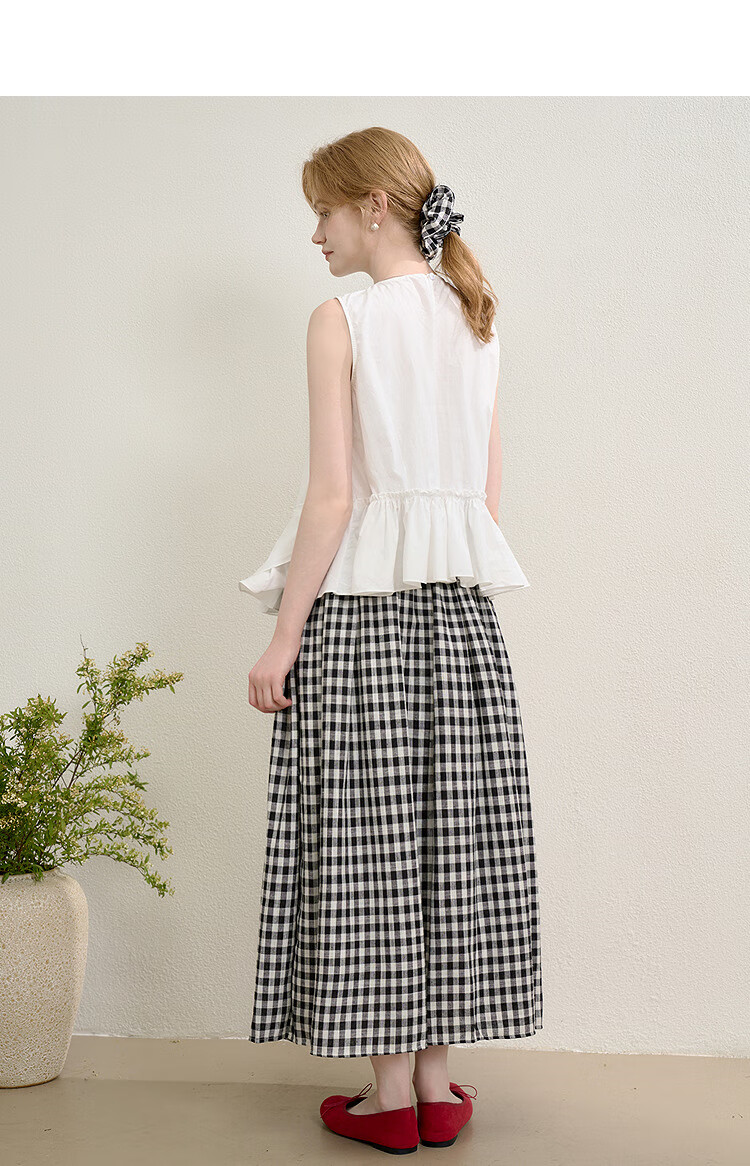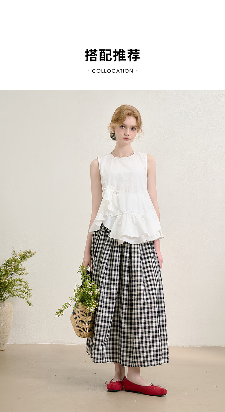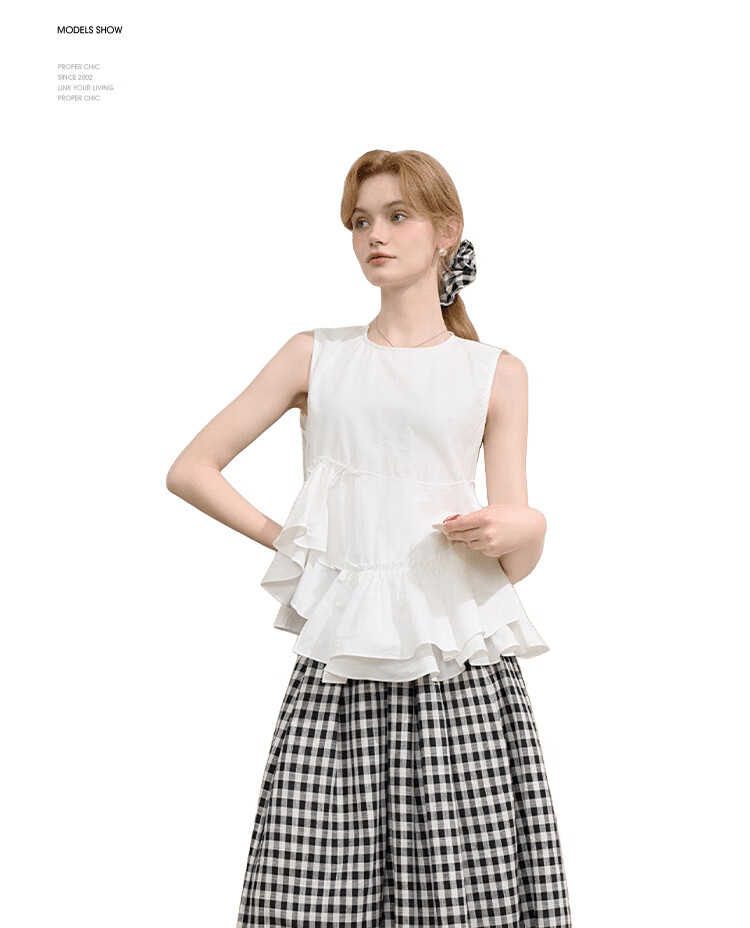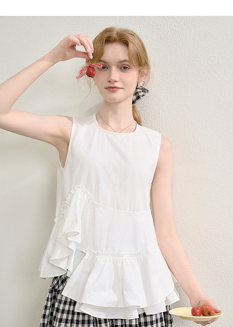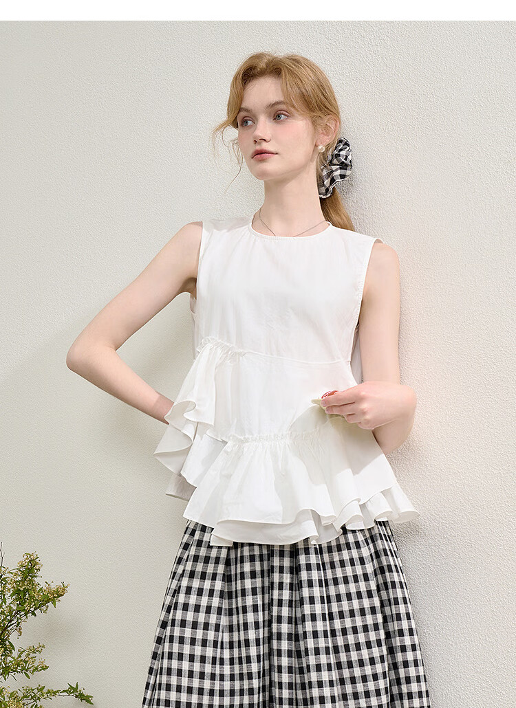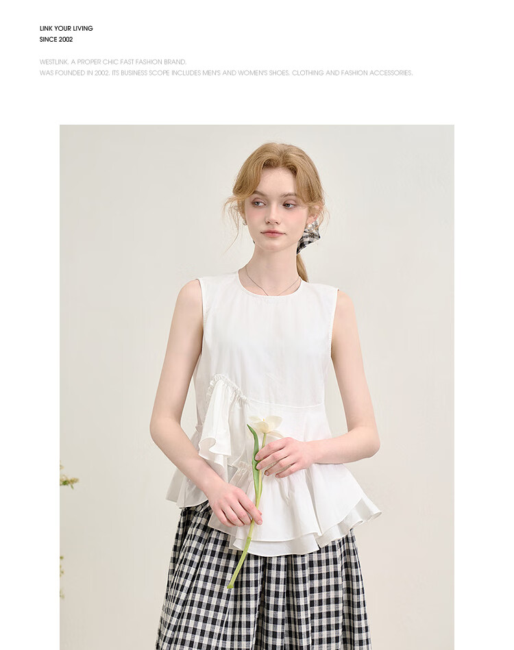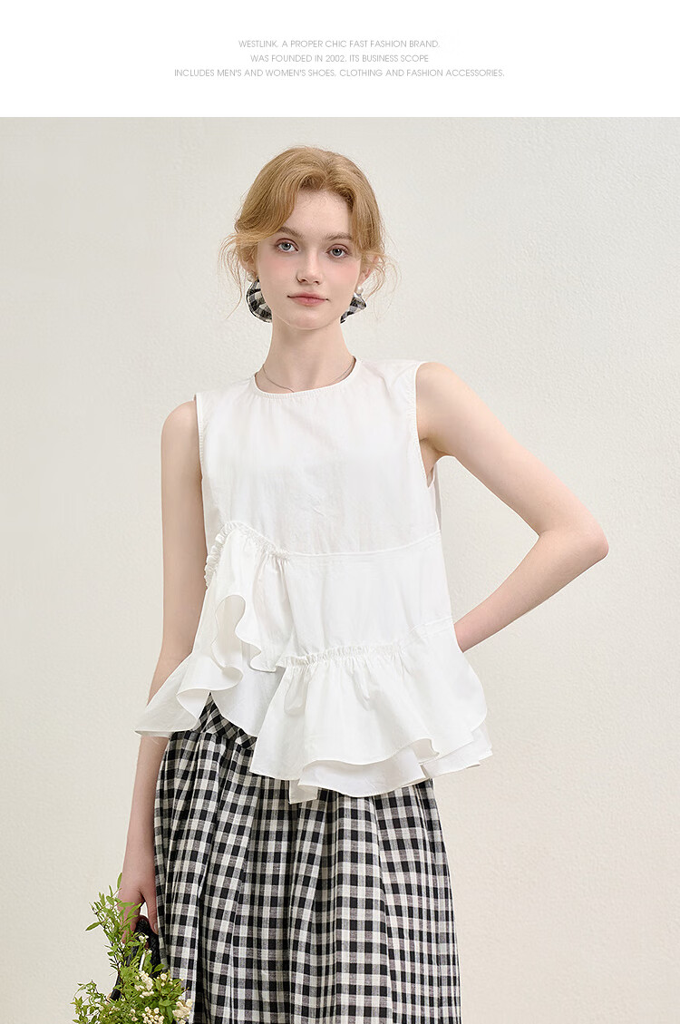 西遇(Westlink)西遇拼接无袖上衣女2025年秋季新款t恤荷叶边裙摆白色圆领衬衣 白色 M (160)