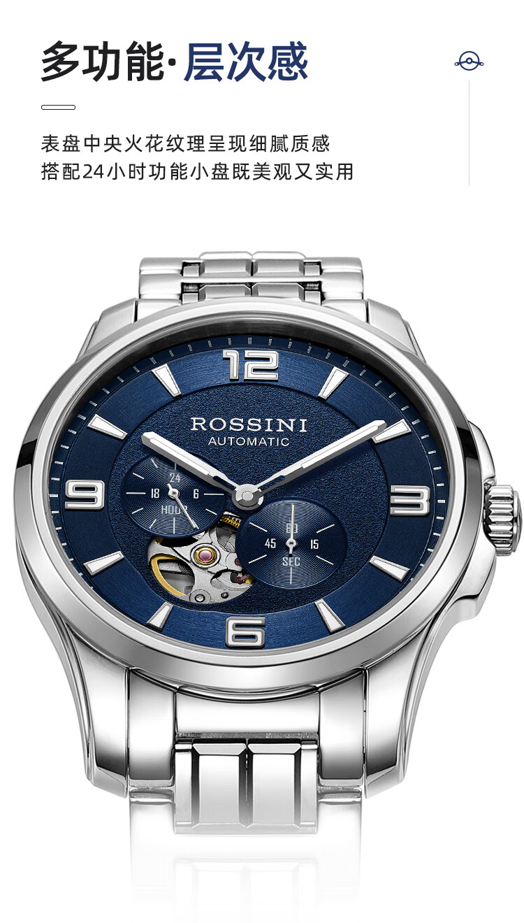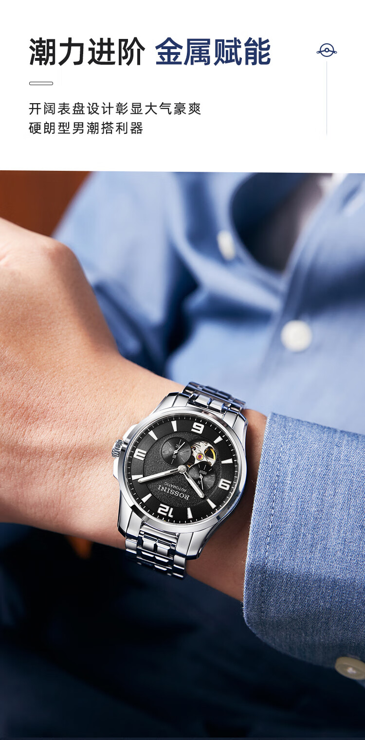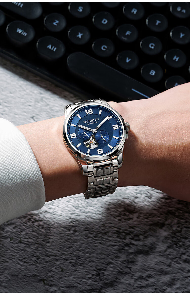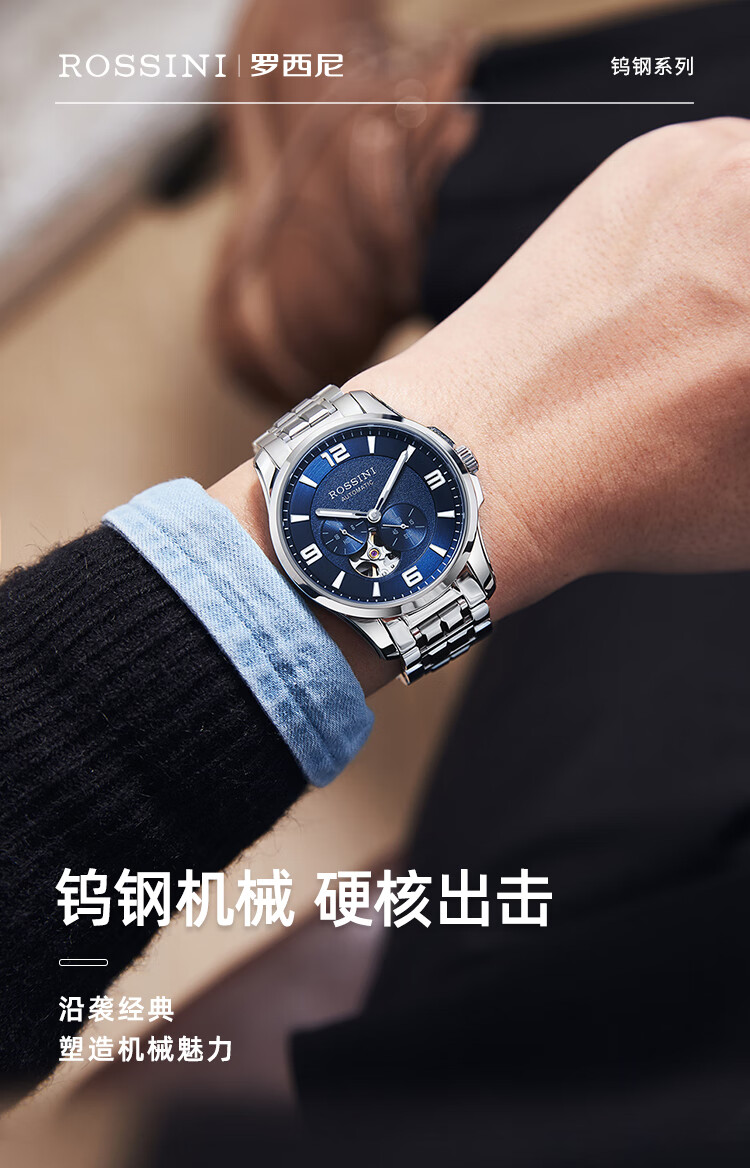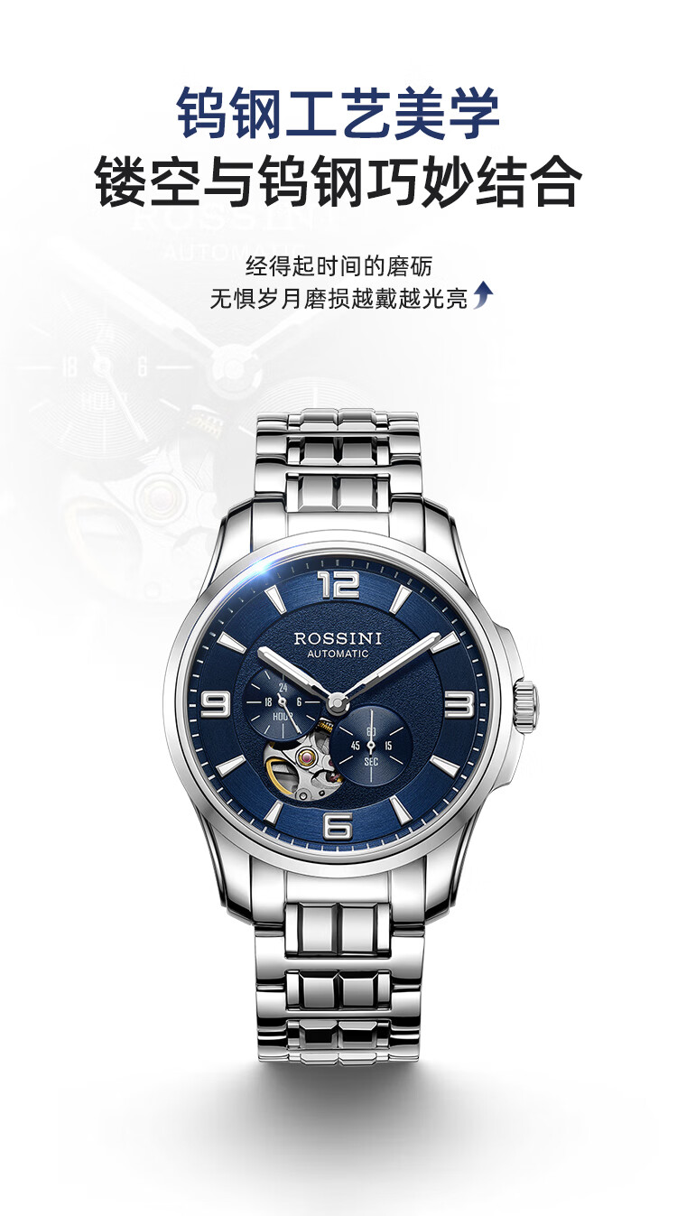 罗西尼(ROSSINI)手表男款 生日礼物钨钢夜光镂空机械手表蓝盘钢带519939