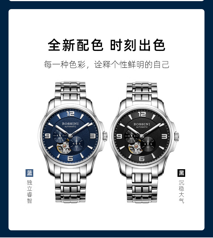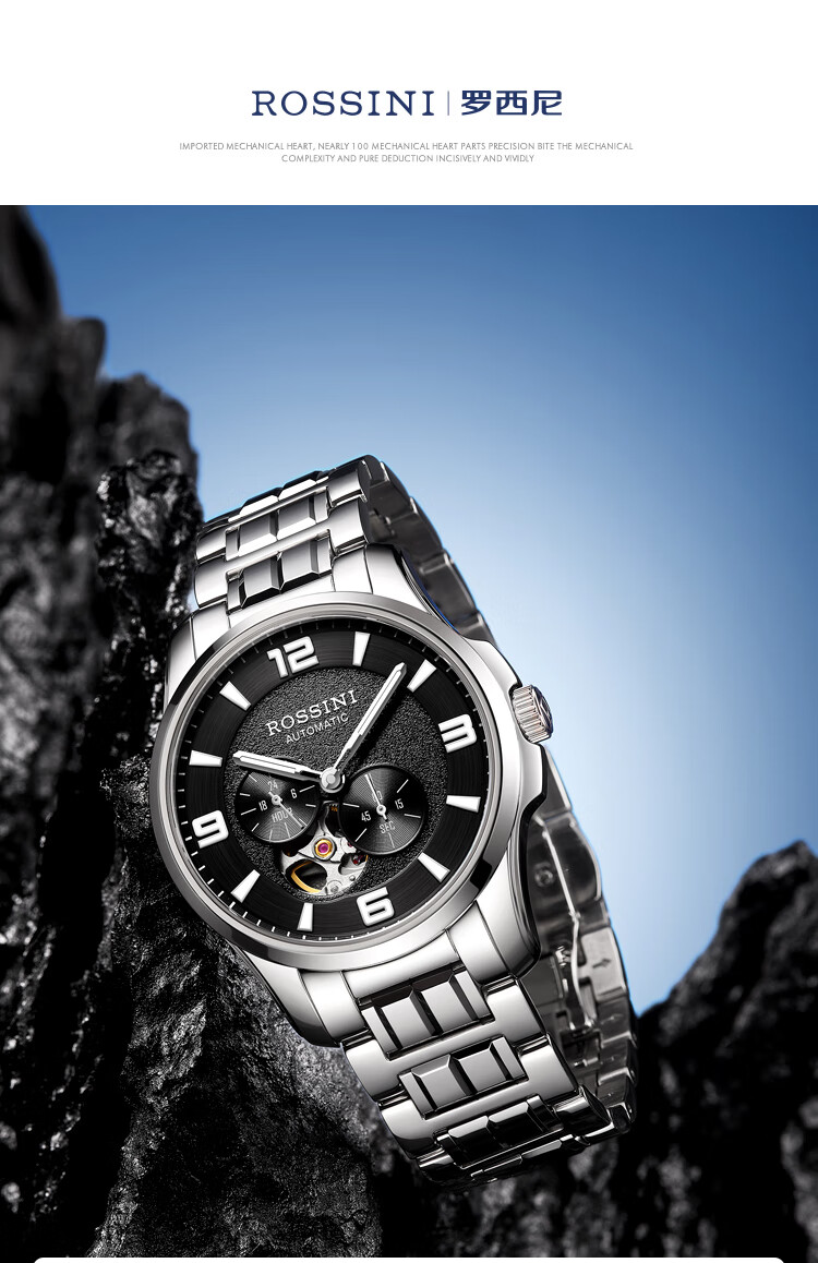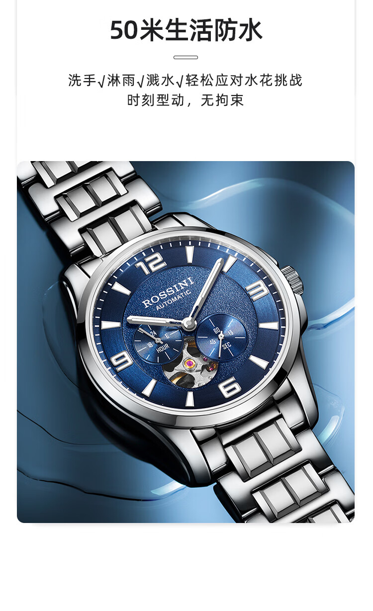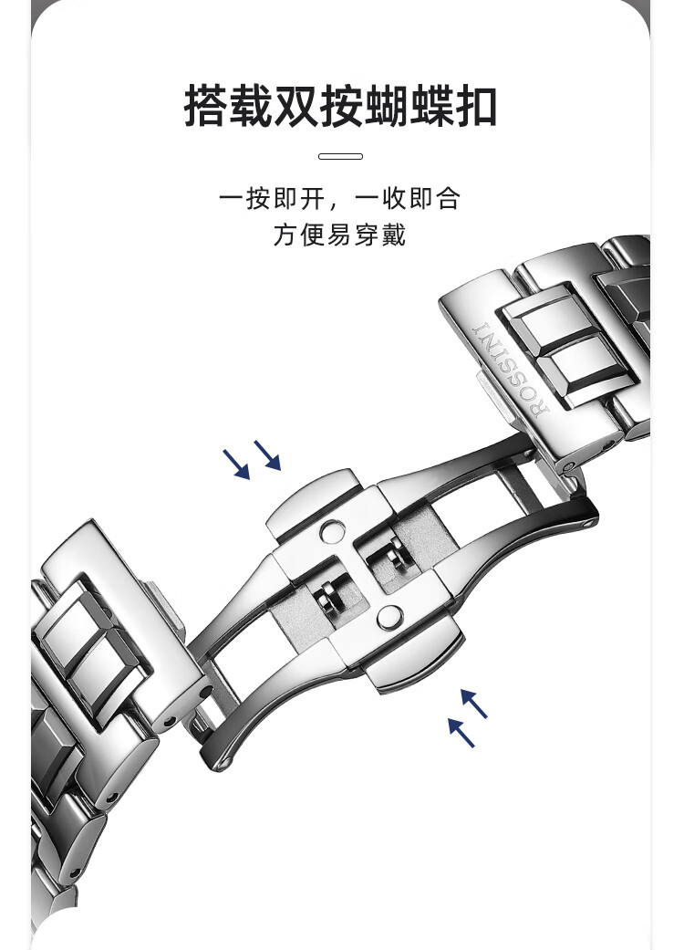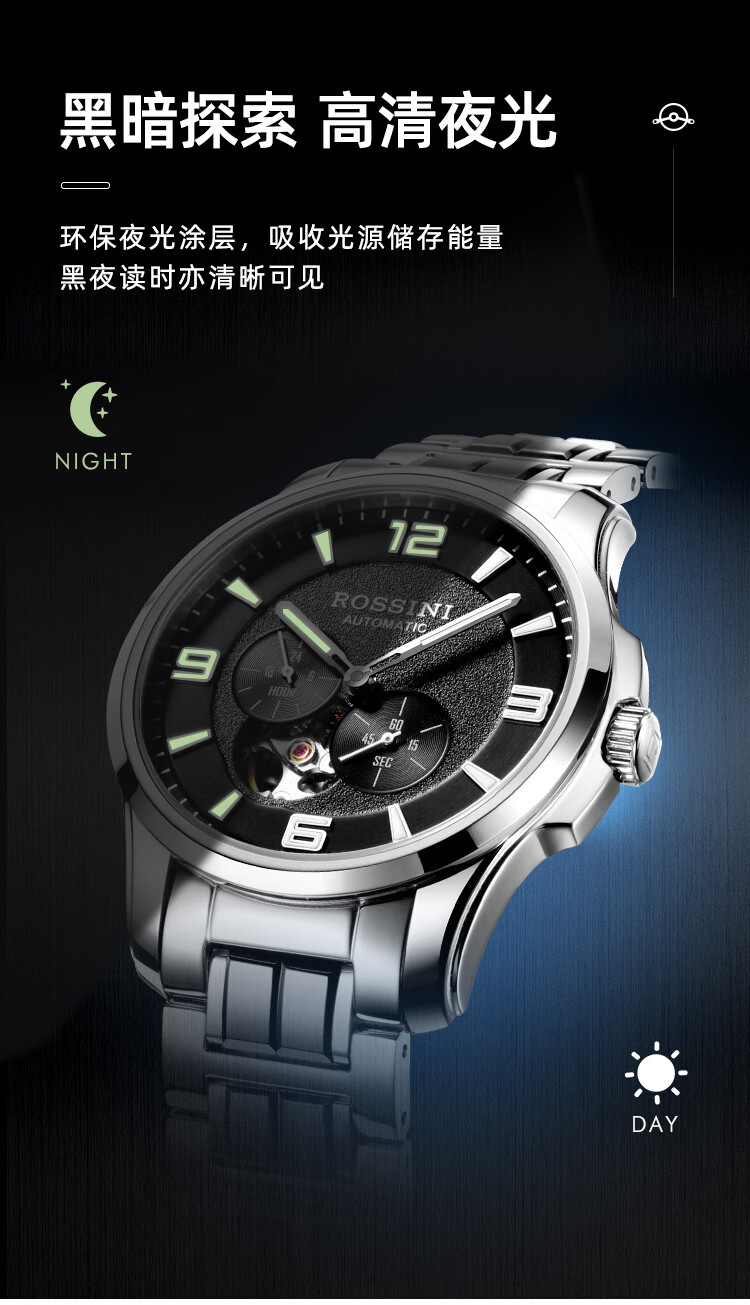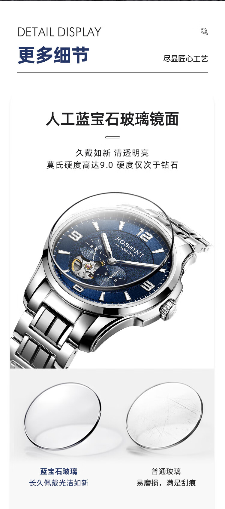 罗西尼(ROSSINI)手表男款 生日礼物钨钢夜光镂空机械手表蓝盘钢带519939