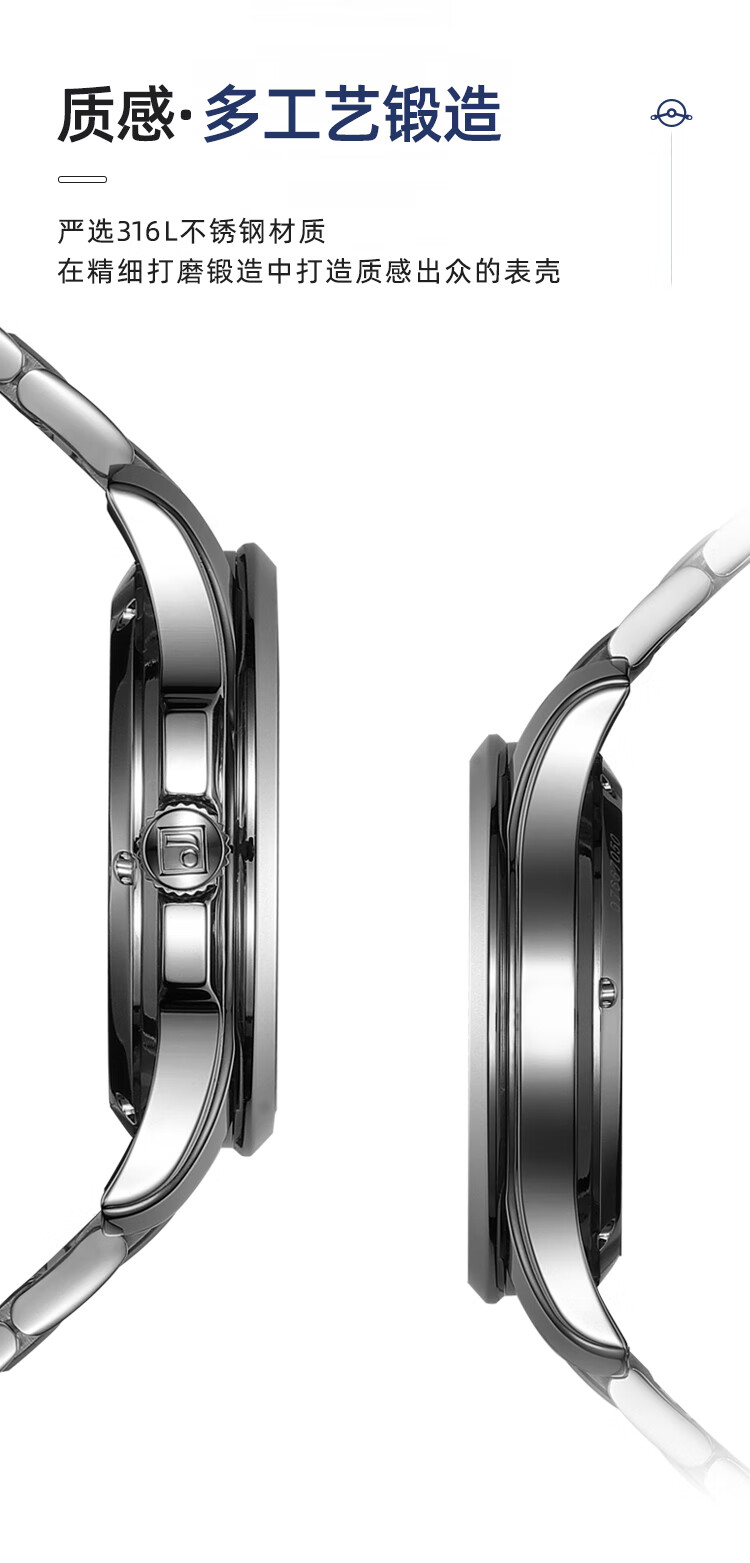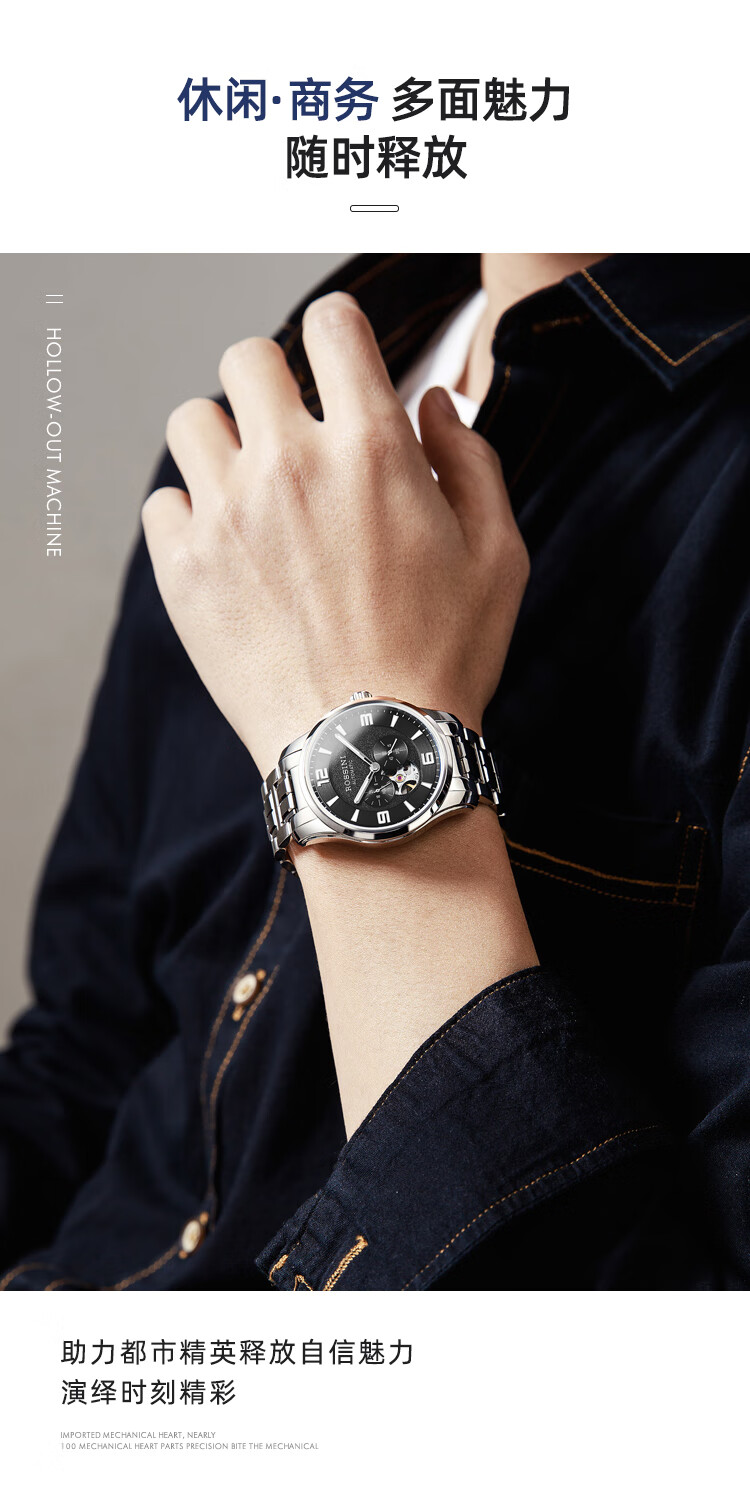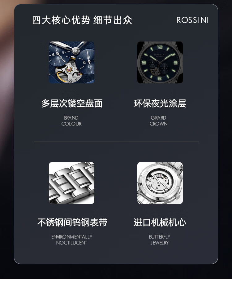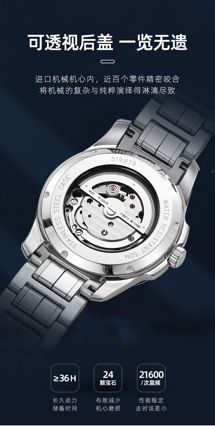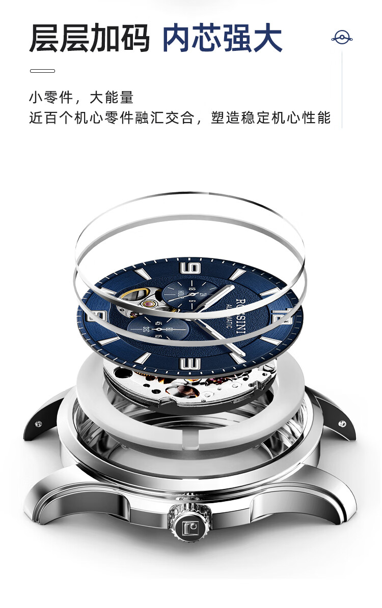 罗西尼(ROSSINI)手表男款 生日礼物钨钢夜光镂空机械手表蓝盘钢带519939