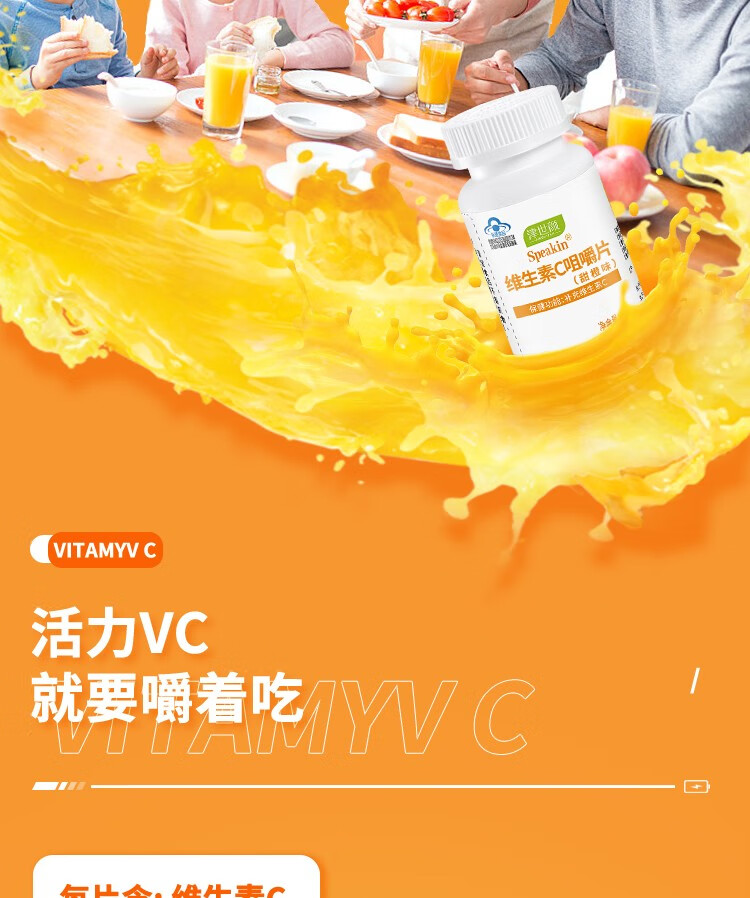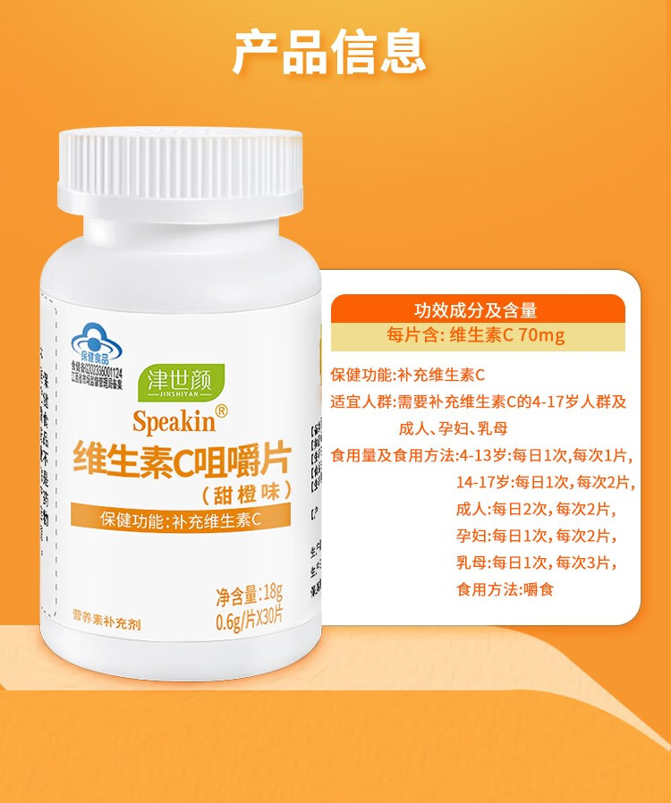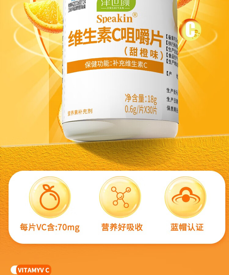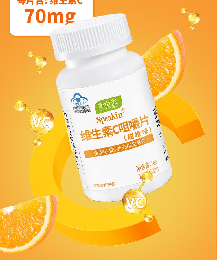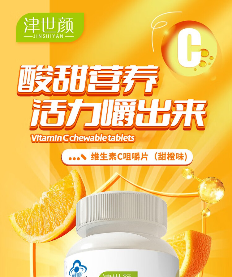 津世颜 维生素C咀嚼片 补充VC维c含片 维C营养 保健品 30片/瓶