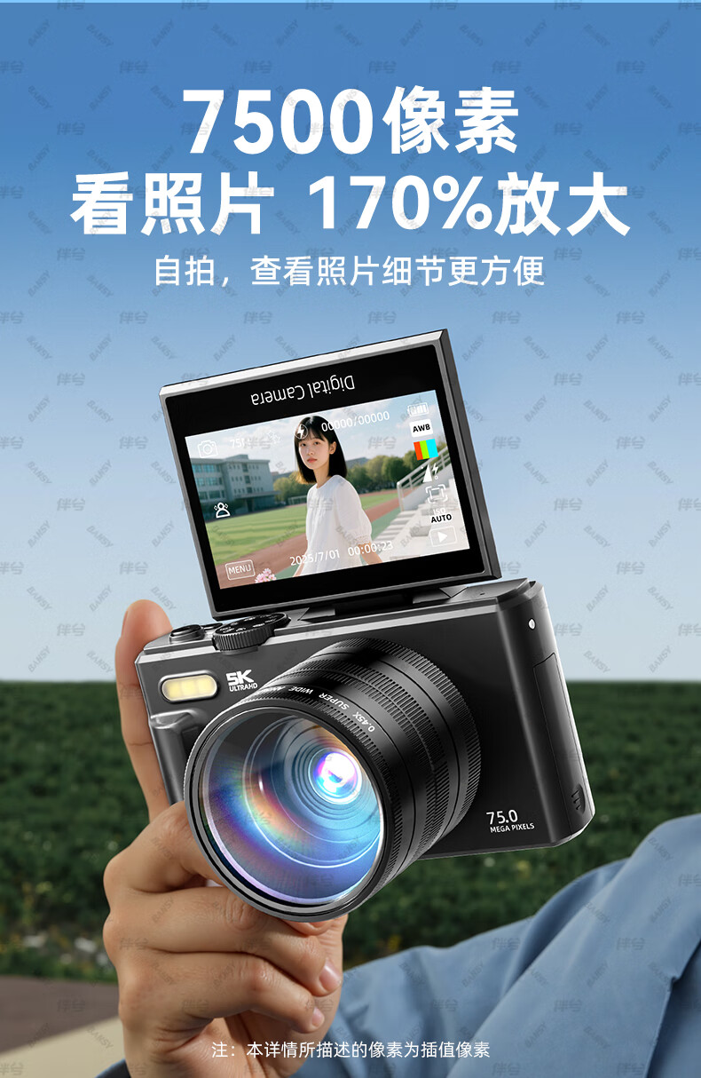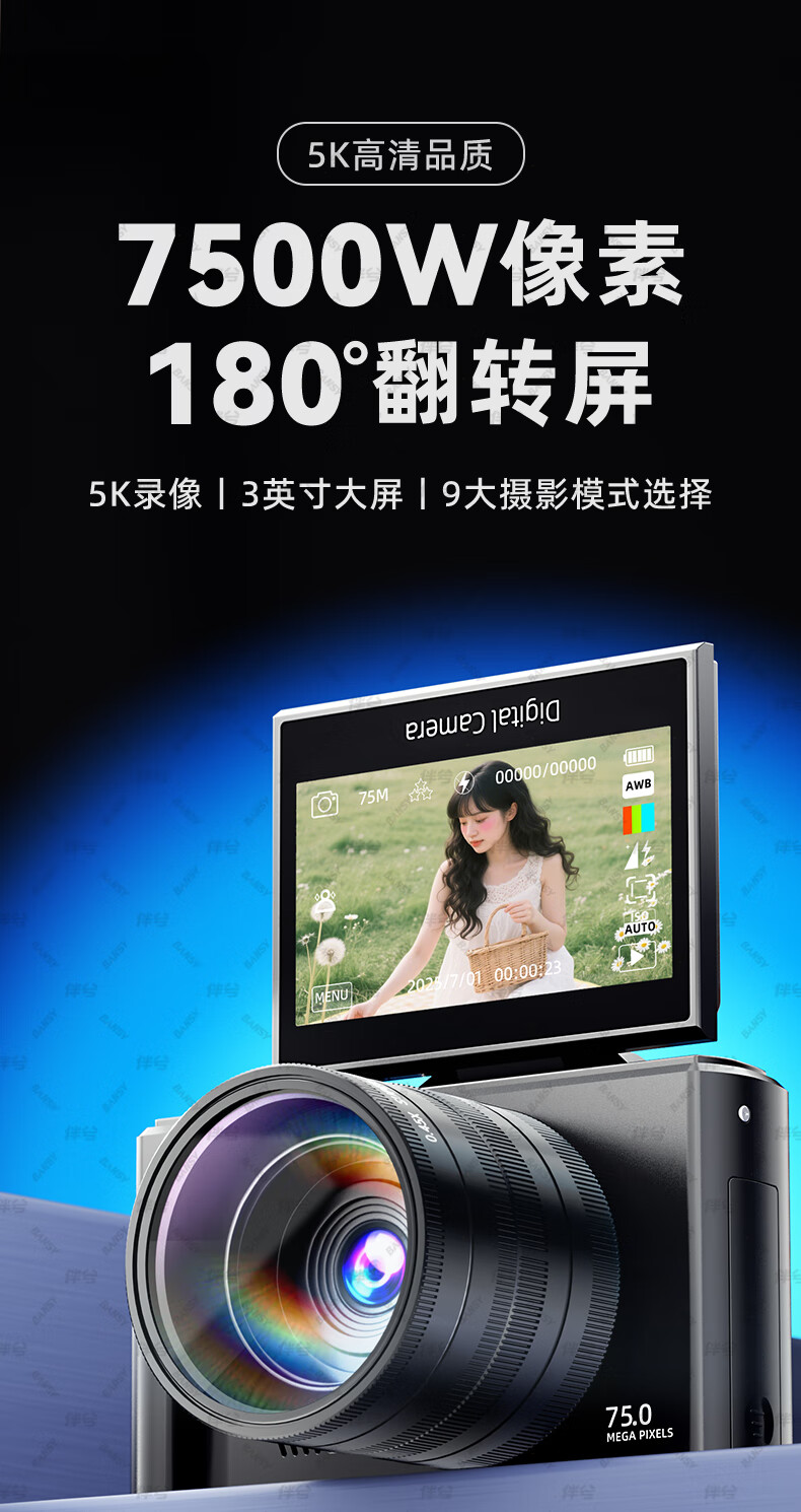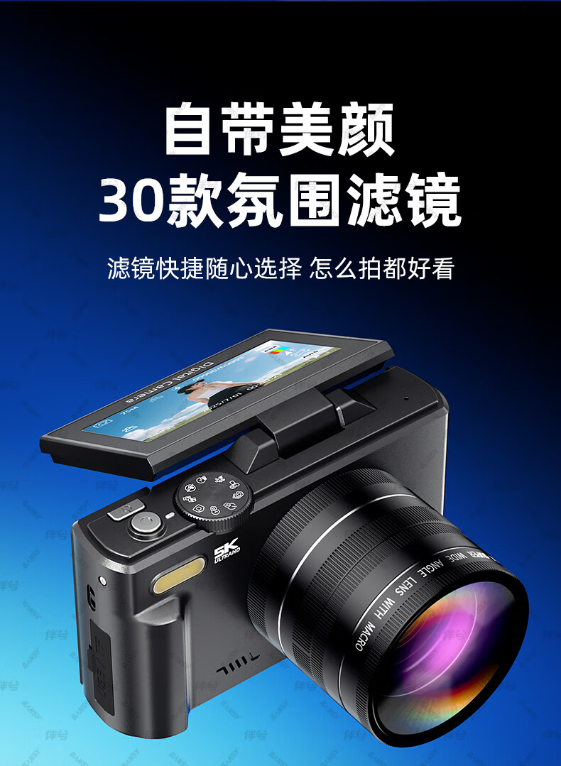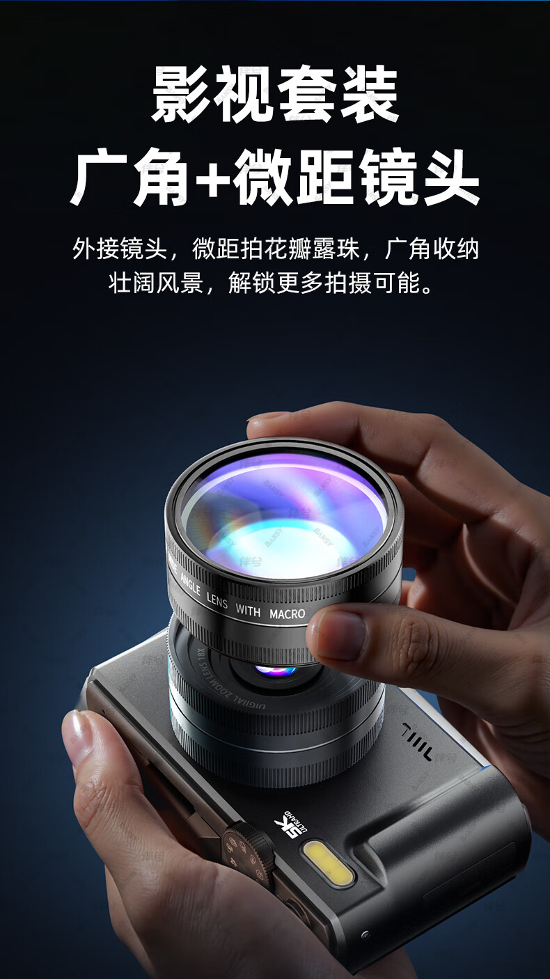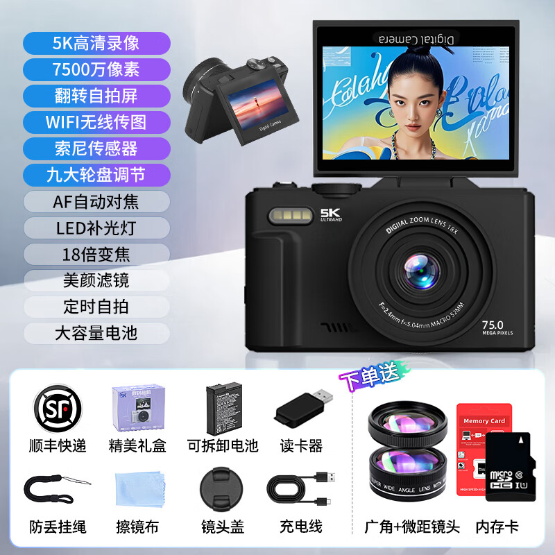 伴兮高清数码照相机替代ccd相机拍照旅游专用微单专业摄像入门级口袋小相机学生随身便携vlog卡片机 黑【配广角+微距镜头】7500万像素+5K录像 128GB内存卡