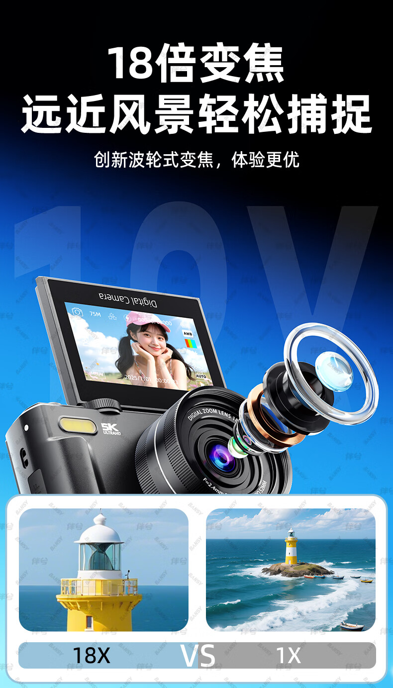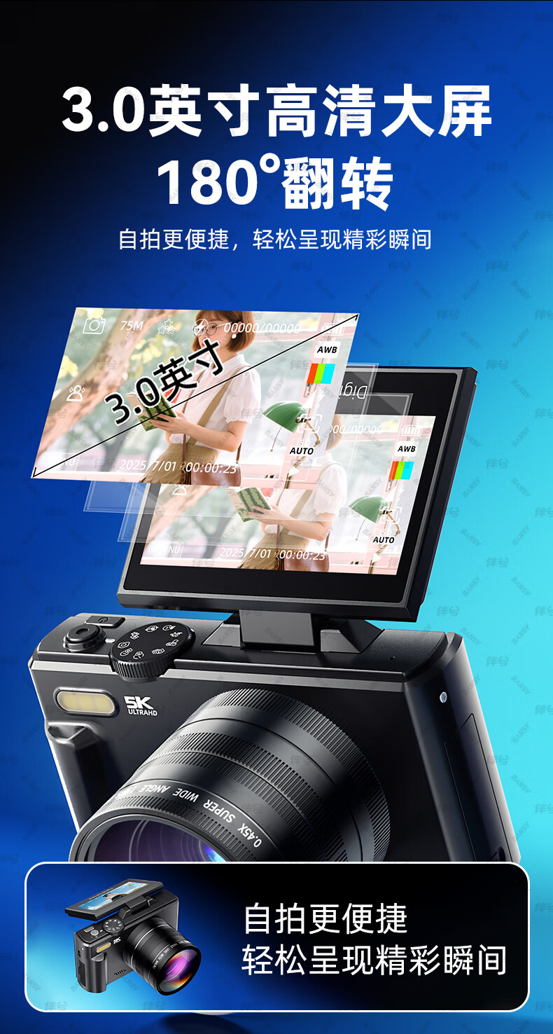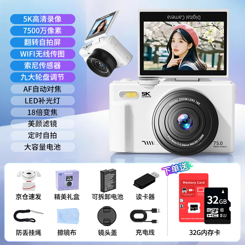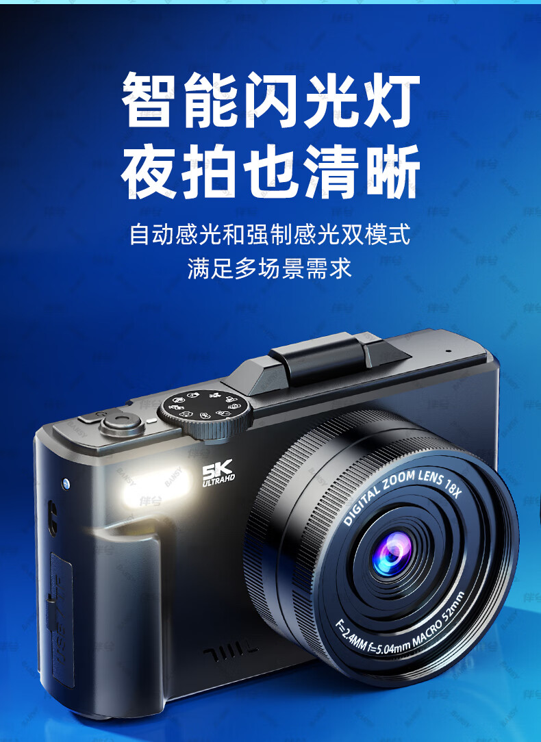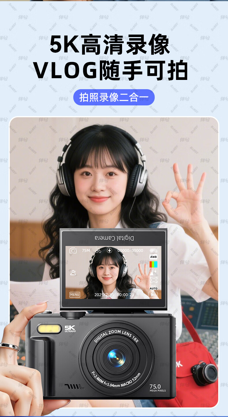 伴兮高清数码照相机替代ccd相机拍照旅游专用微单专业摄像入门级口袋小相机学生随身便携vlog卡片机 黑【配广角+微距镜头】7500万像素+5K录像 128GB内存卡