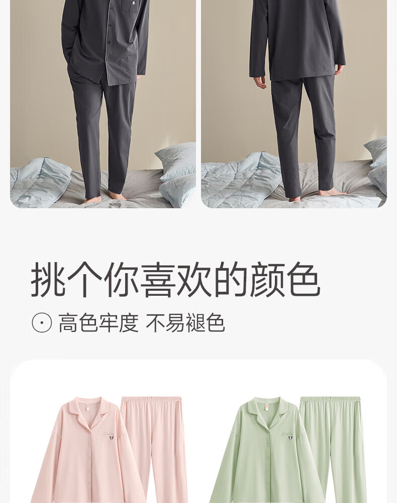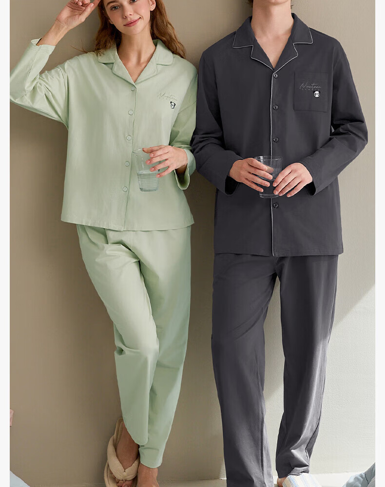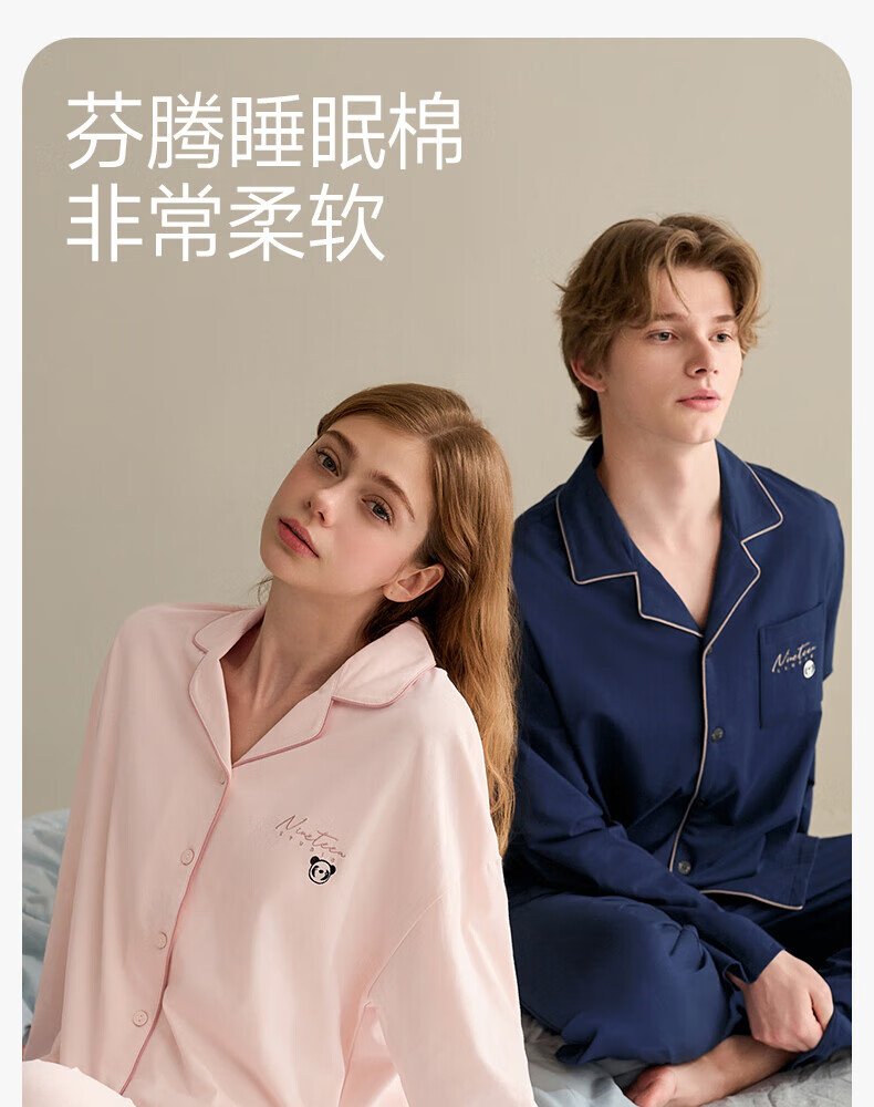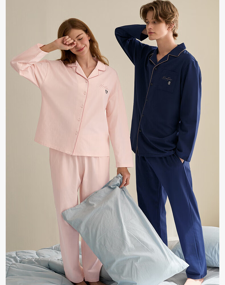 芬腾情侣睡衣女士春秋季新款长袖纯棉休闲大码开衫男款家居服套装 虾粉(女) L 建议:女110-124斤,男126-146斤