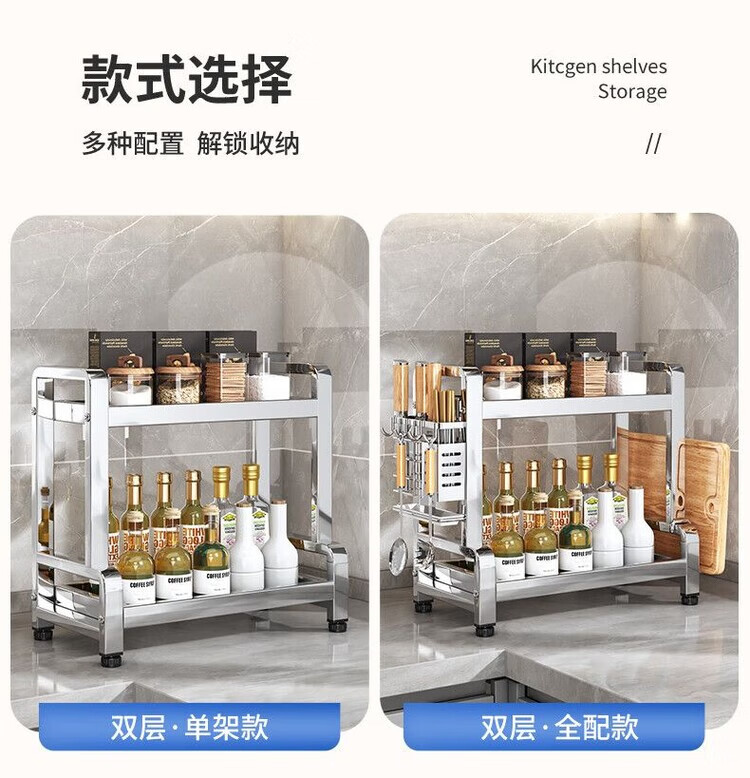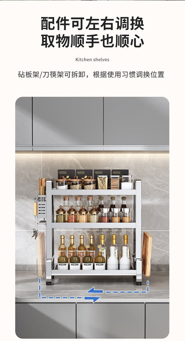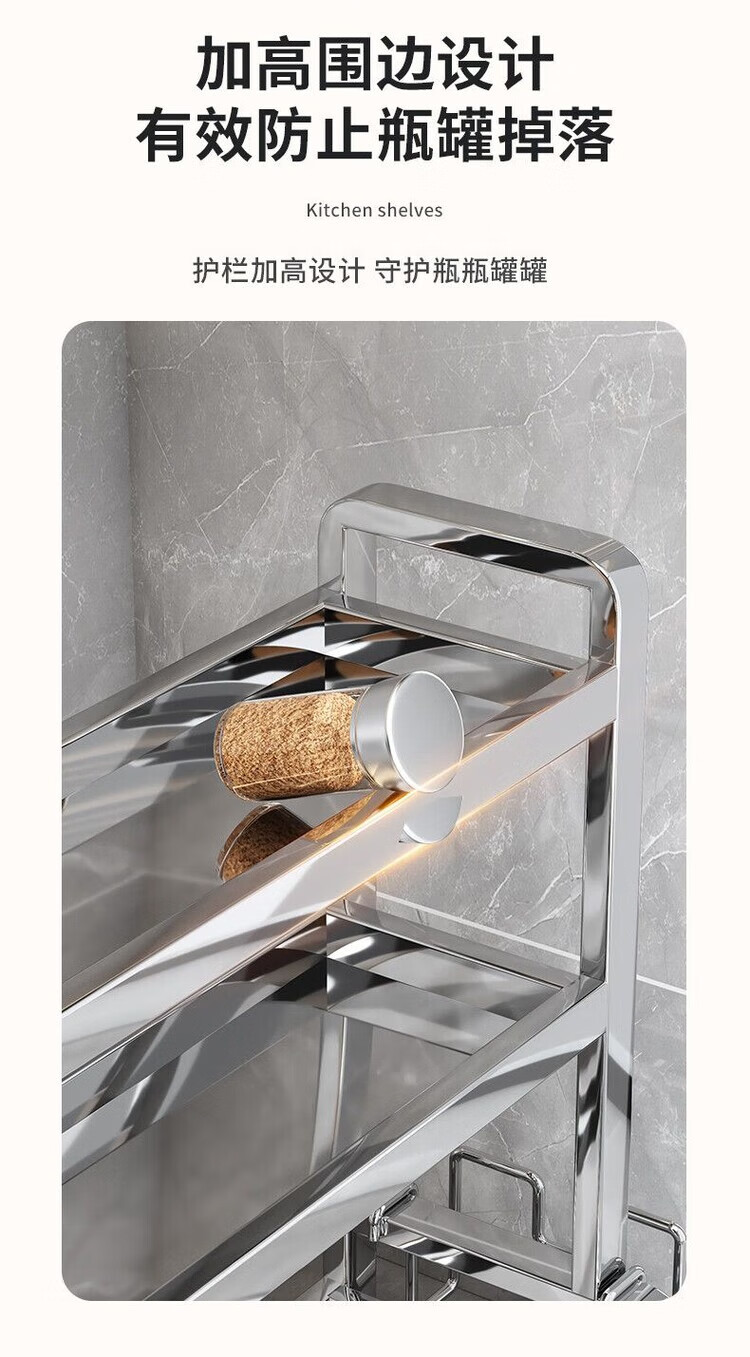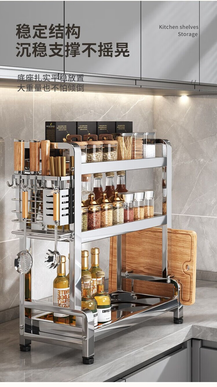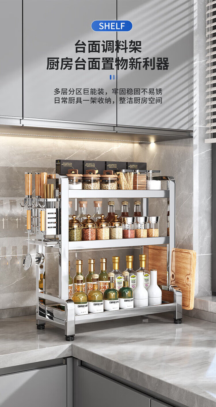 简漾304不锈钢厨房调料置物架台面调味品收纳架家用多功能多层储物架 特厚不锈钢材质 2层长33cm丨单主架