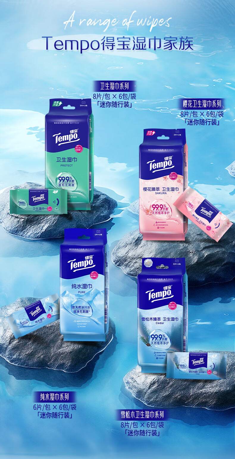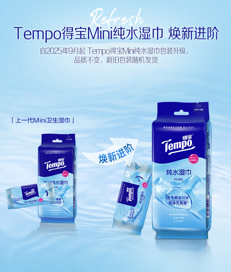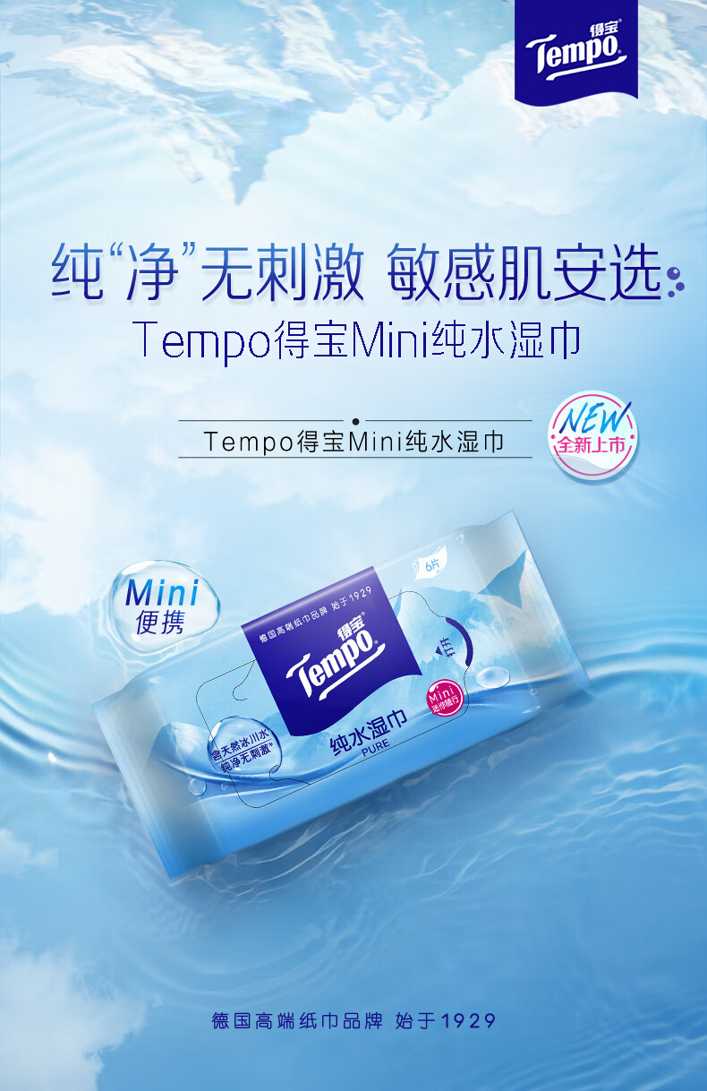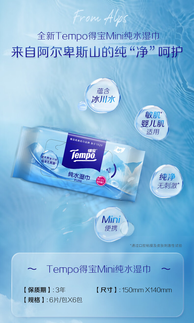 得宝(TEMPO)湿巾 Mini冰川纯水6片*6包 便携装 婴儿湿巾 湿纸巾 湿巾小包