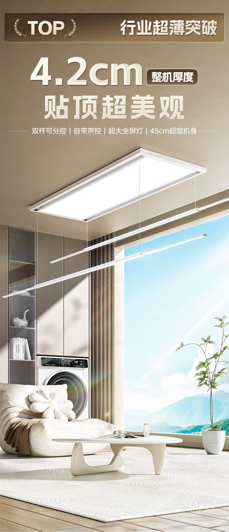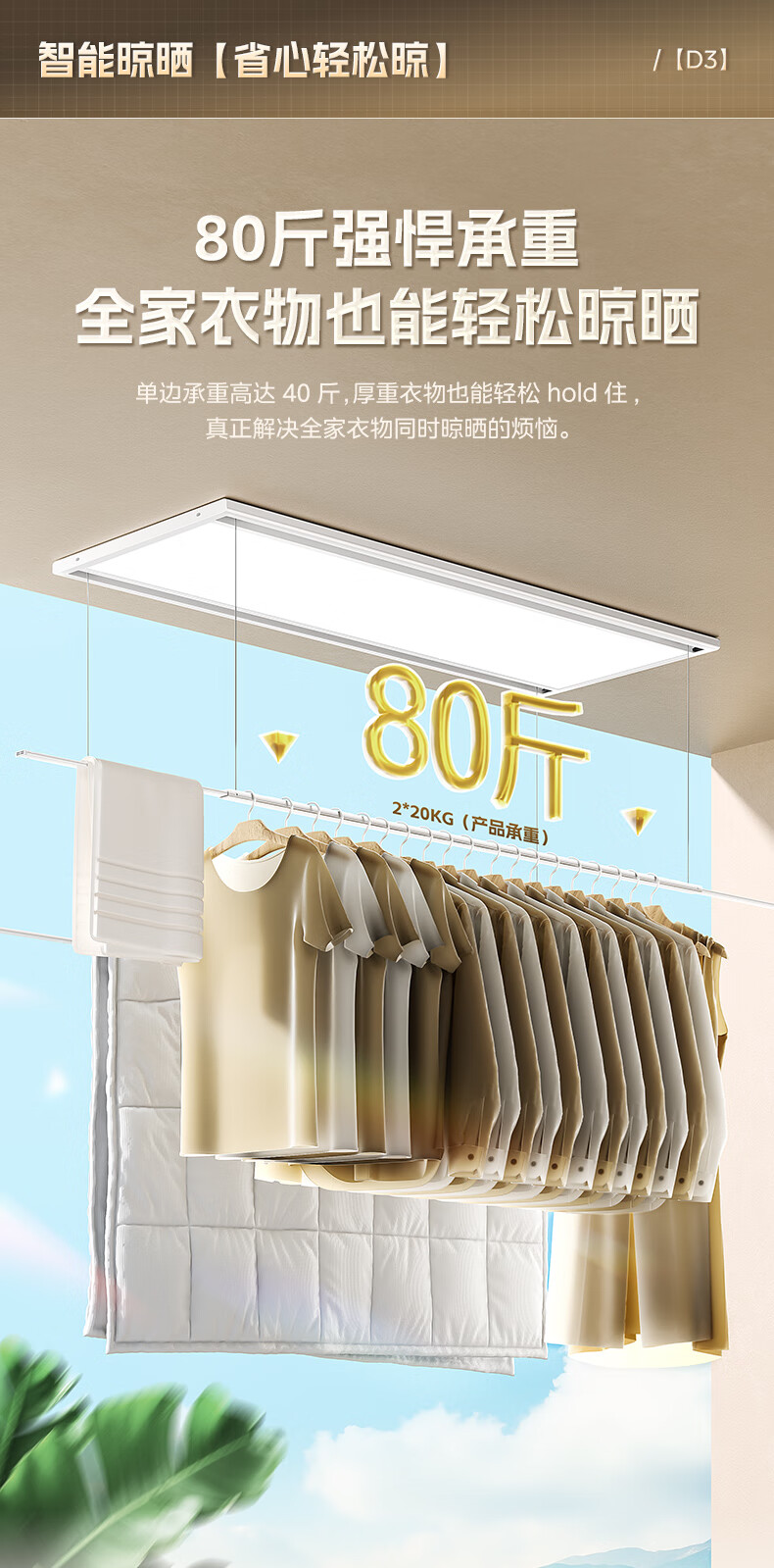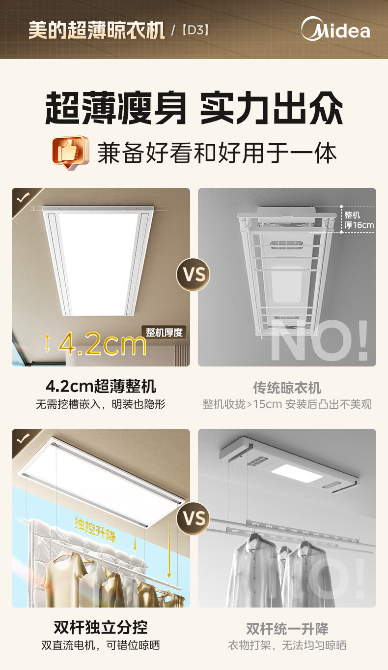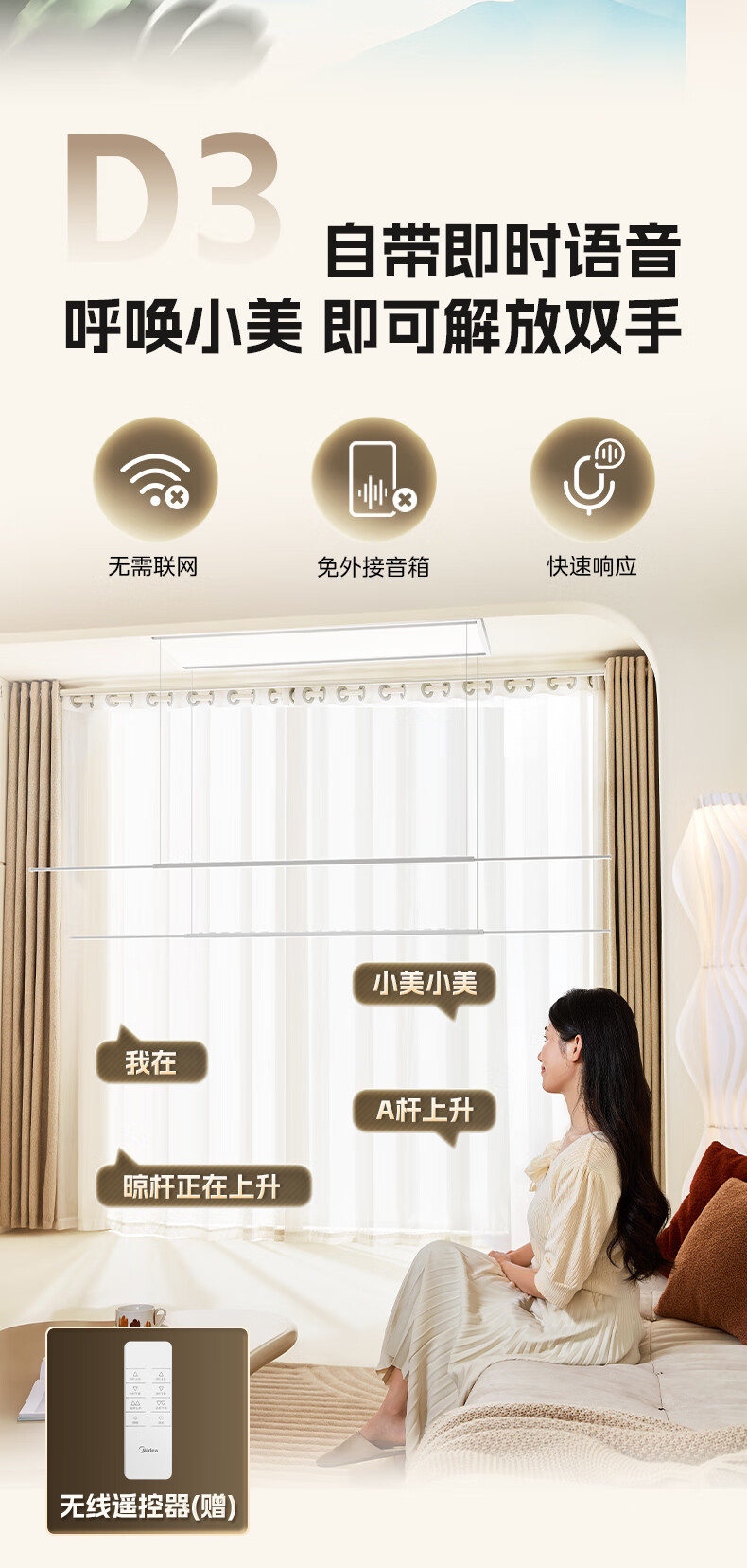美的(Midea)电动晾衣架智能双控双杆晾衣机超薄隐形阳台自动升降晾衣杆家用D3 【D3】双杆分控|离线语音|28W照明