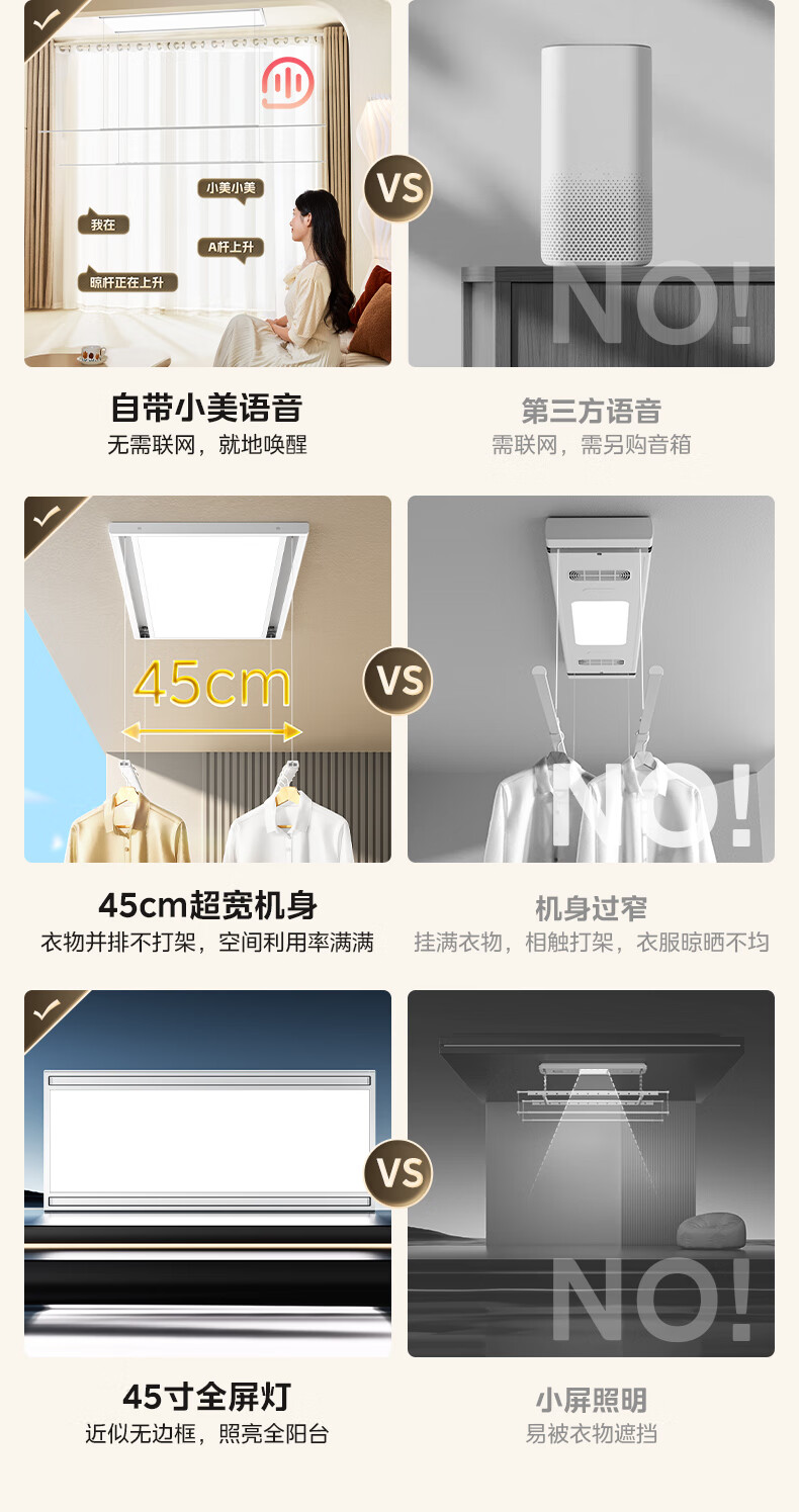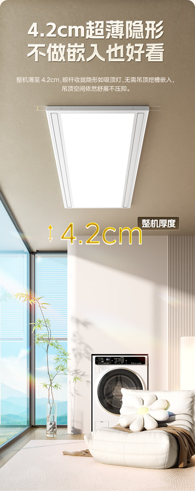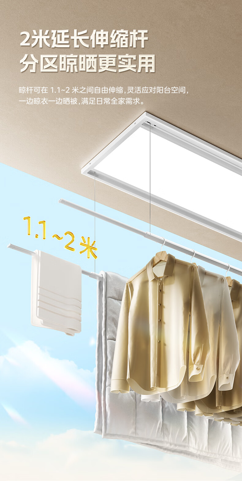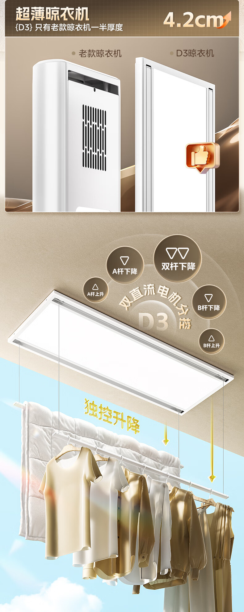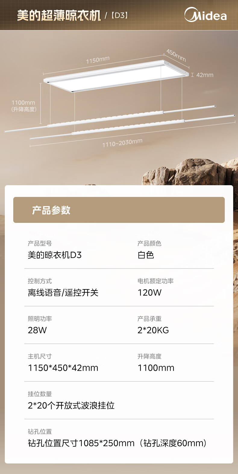 美的(Midea)电动晾衣架智能双控双杆晾衣机超薄隐形阳台自动升降晾衣杆家用D3 【D3】双杆分控|离线语音|28W照明