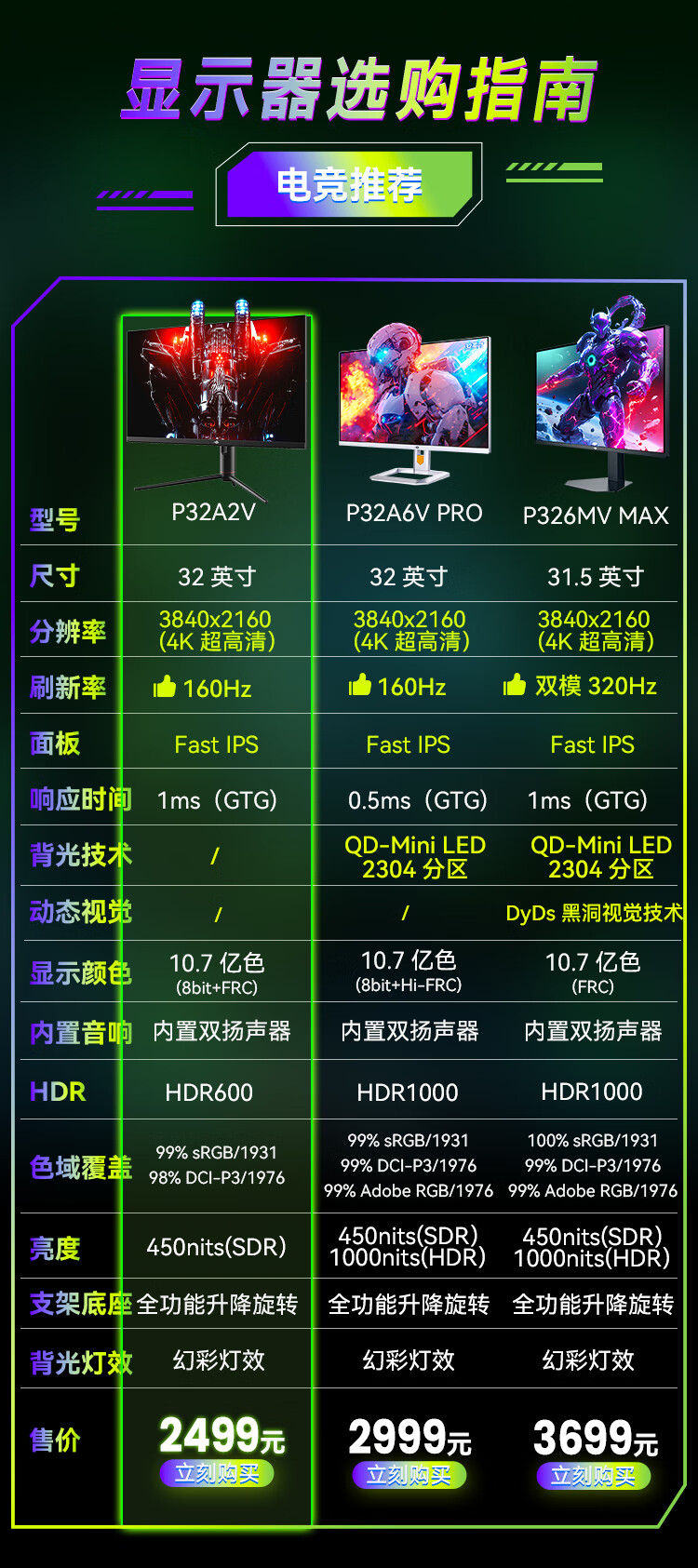 泰坦军团 32英寸 4K 160Hz F-IPS 双HDMI2.1 Type-C 65W供电 HDR600 内置音箱 1ms电竞电脑显示器 P32A2V