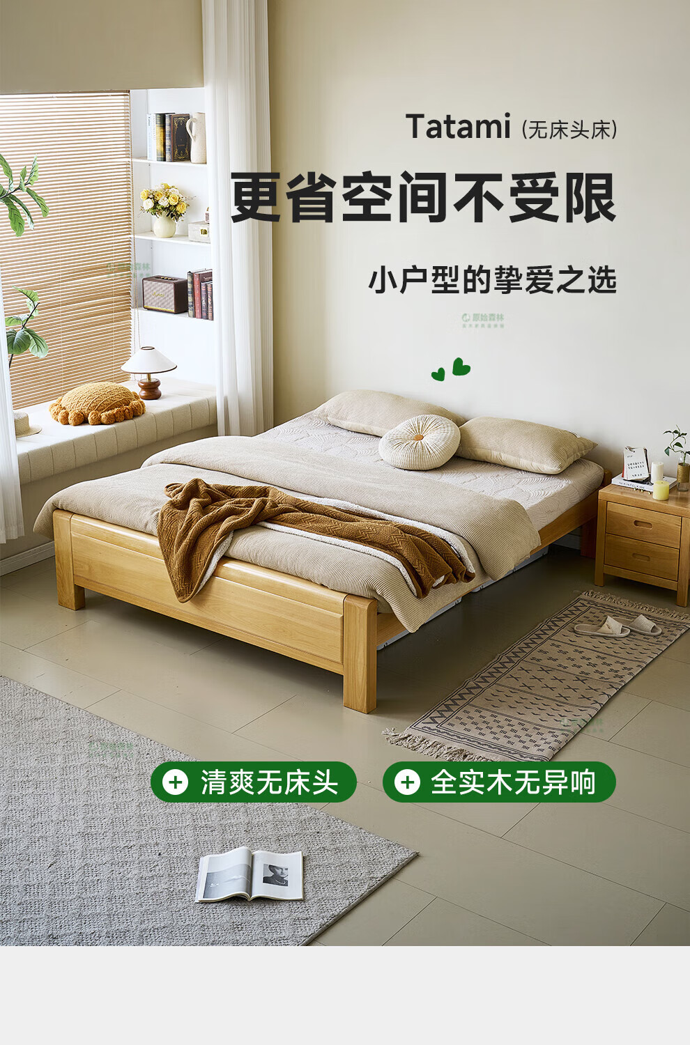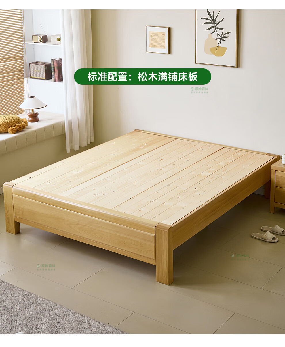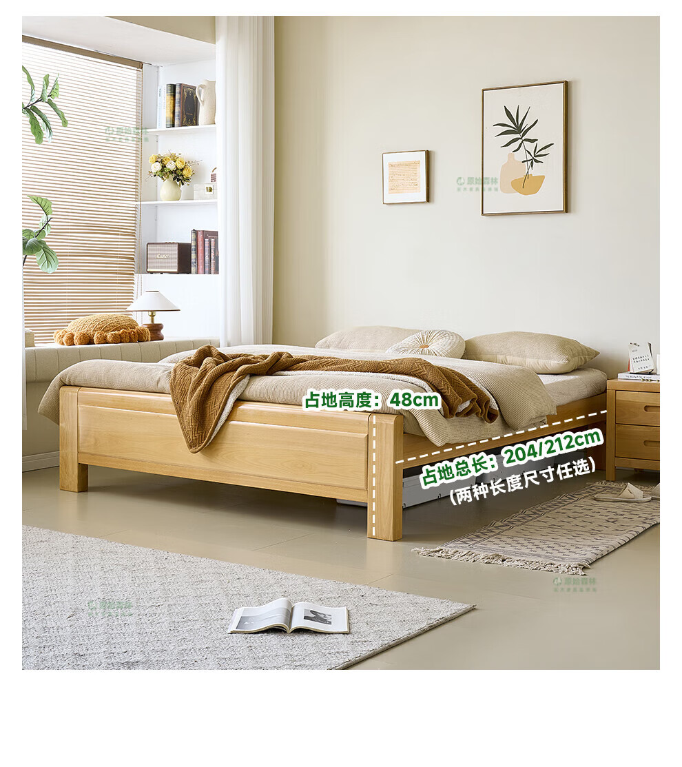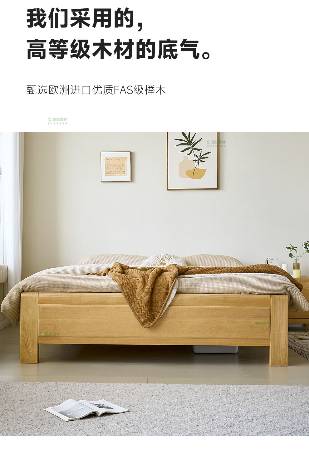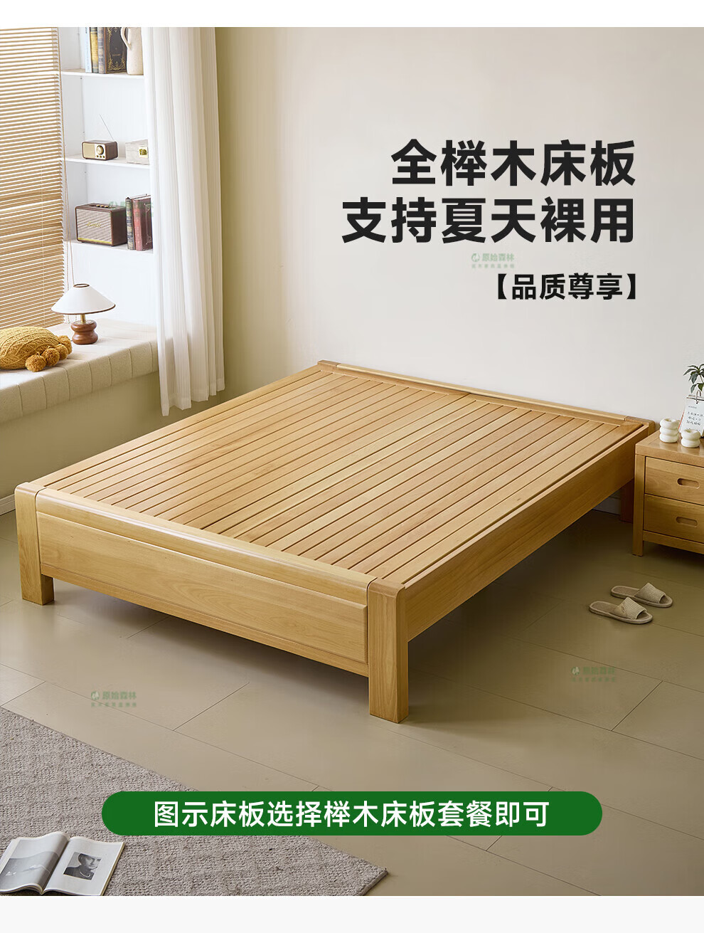 原始森林全实木无床头榉木床可调高度榻榻米小户型无靠背齐边排骨架双人床 无床头单床 1500*2000mm-配松木满铺床板