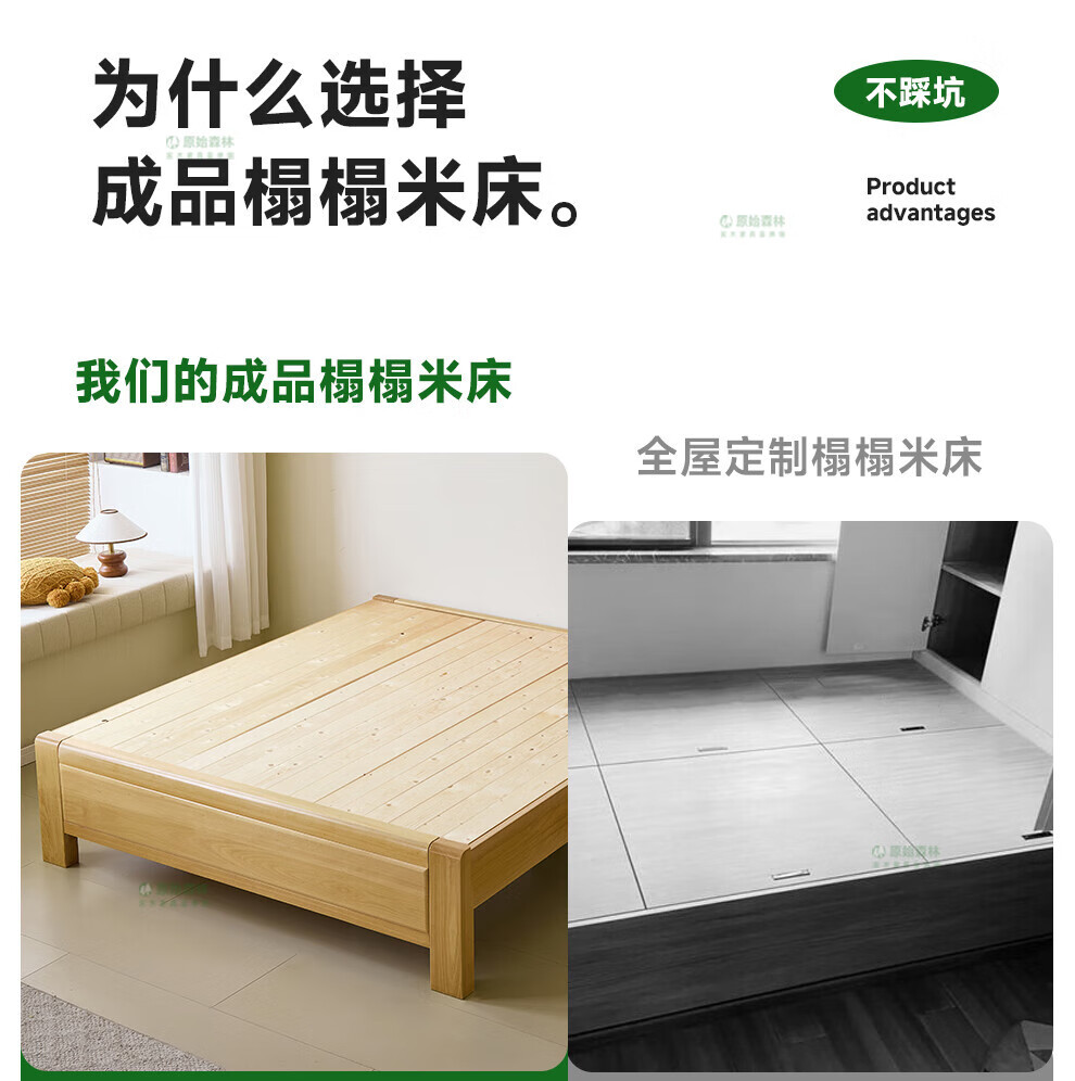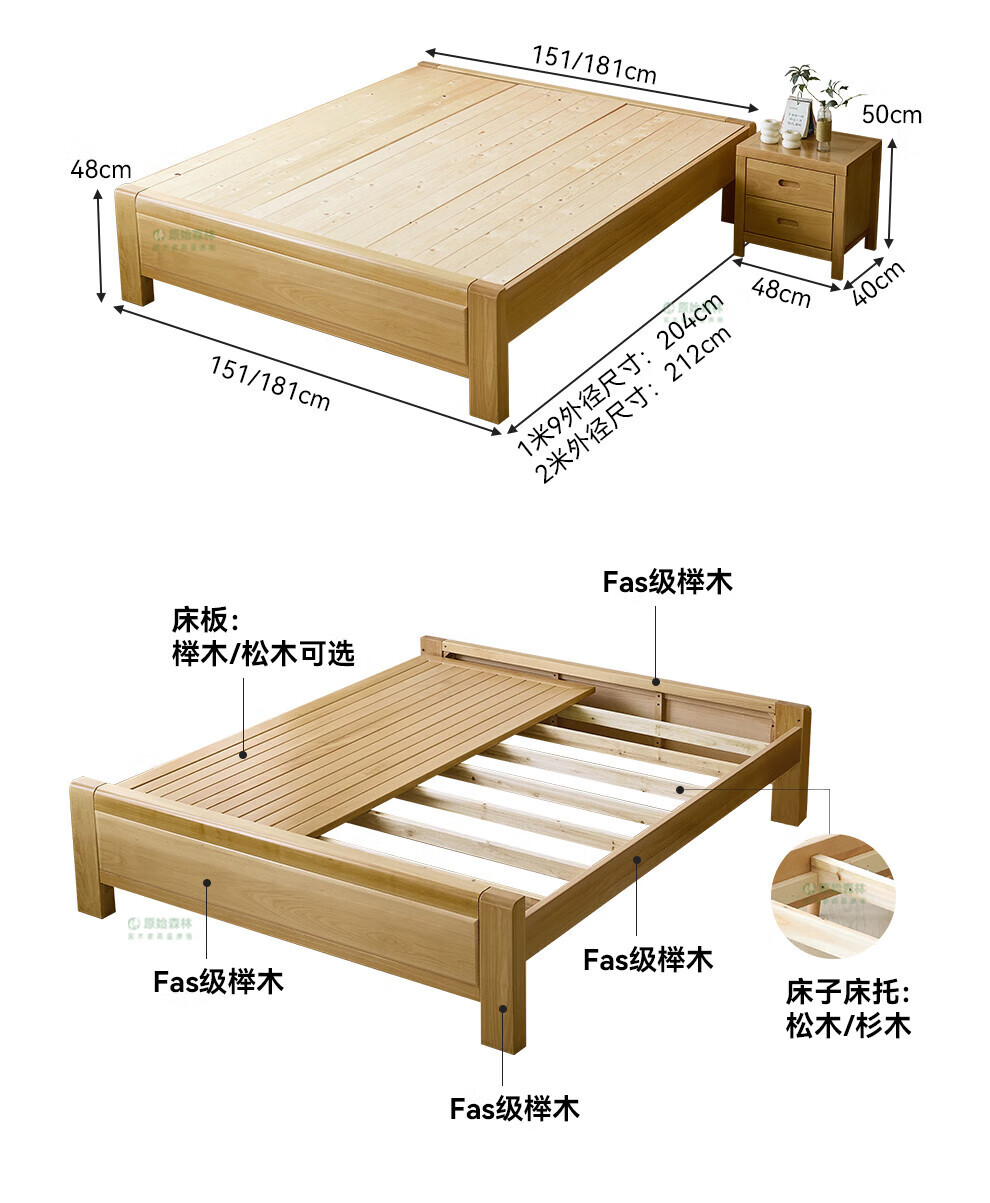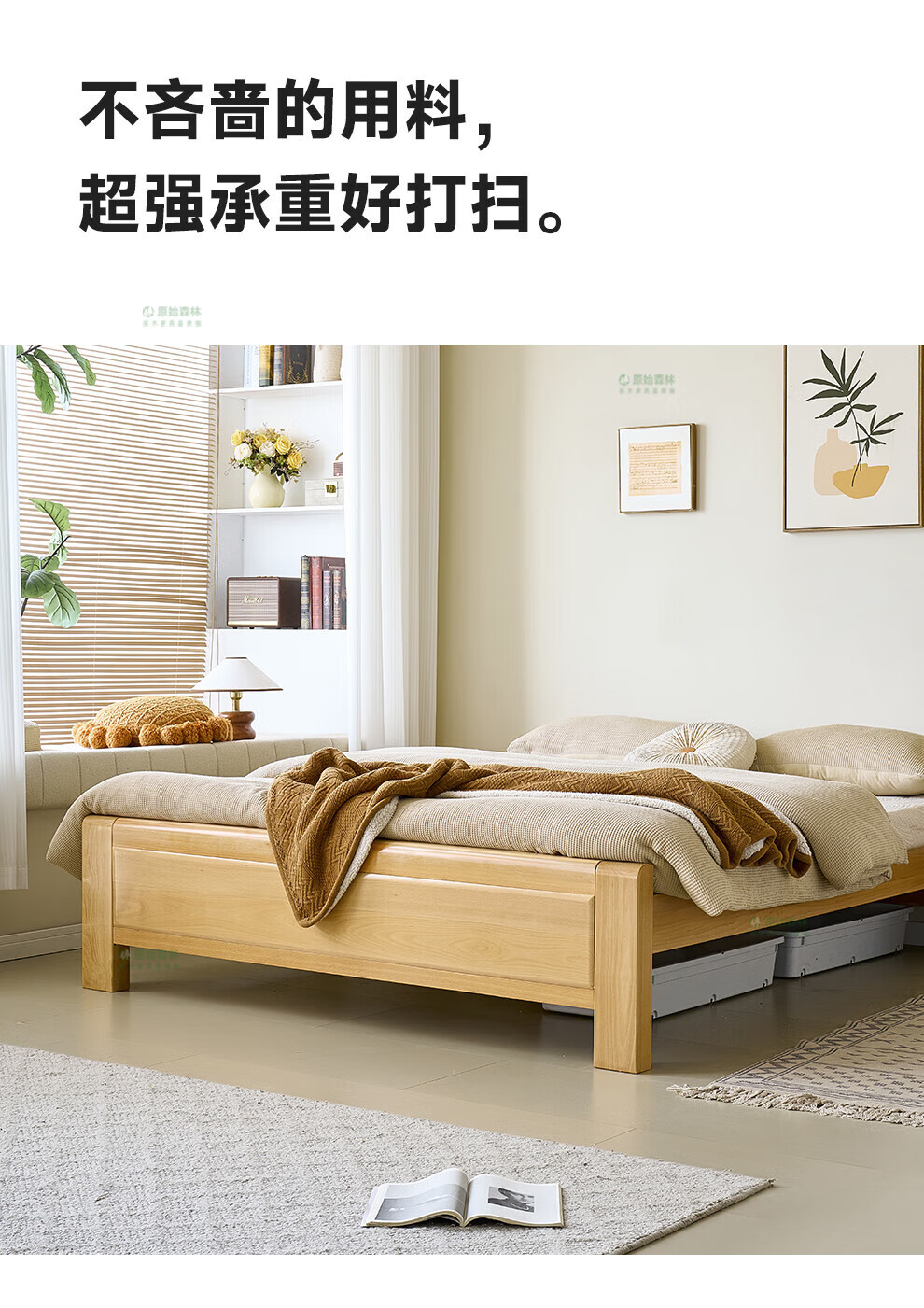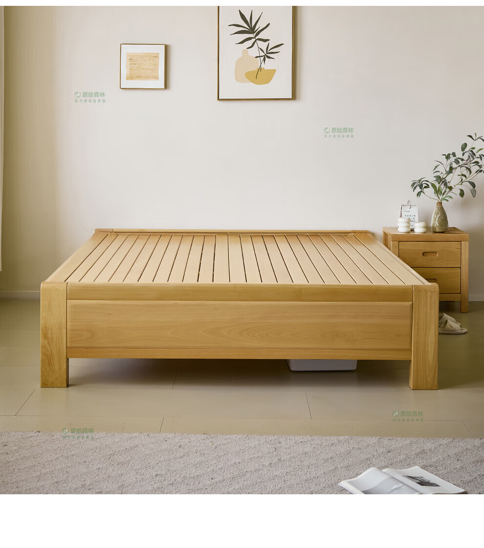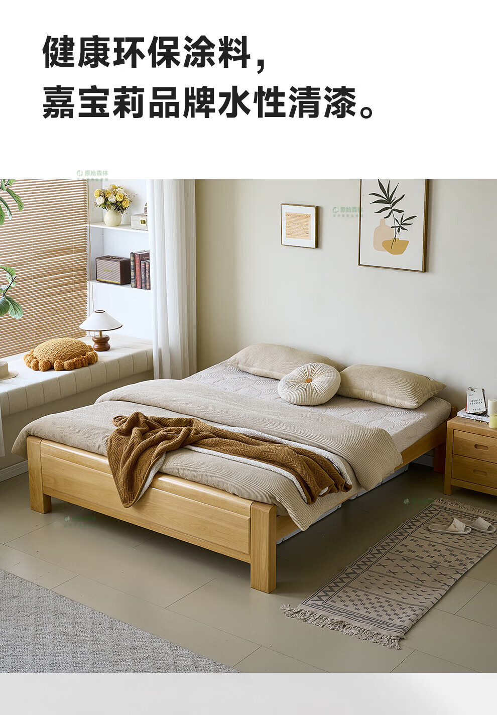 原始森林全实木无床头榉木床可调高度榻榻米小户型无靠背齐边排骨架双人床 无床头单床 1500*2000mm-配松木满铺床板