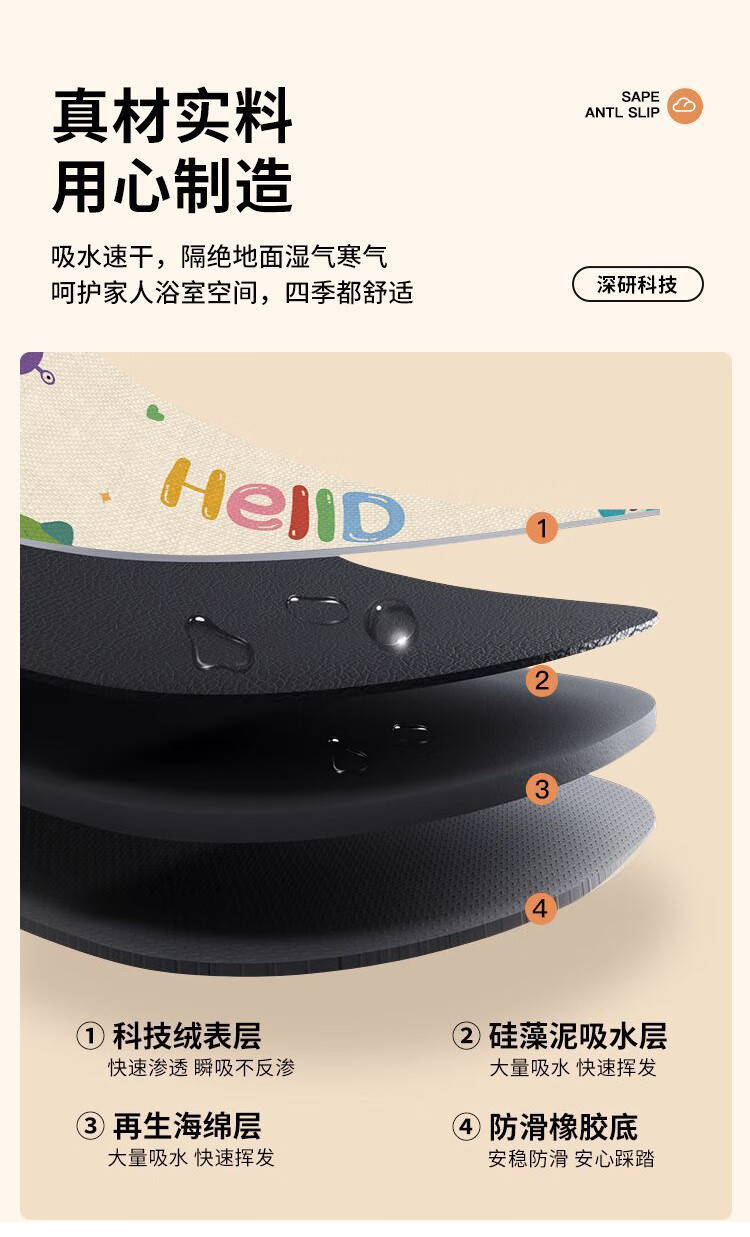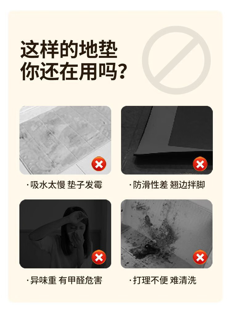 KAYE卫生间地垫硅藻泥厕所吸水垫子卫浴门口脚垫速干家用软浴室防滑垫 GZN-如歌-卡其-方形 40x60 cm
