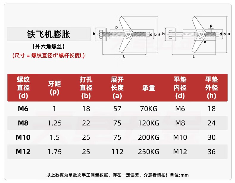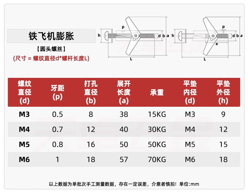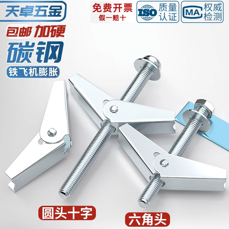 天卓五金铁飞机膨胀螺丝空心墙纤维石膏板兰花夹壁虎伞型胀塞MM4M5M6M8M10 圆头M4*80(5套)打孔12mm