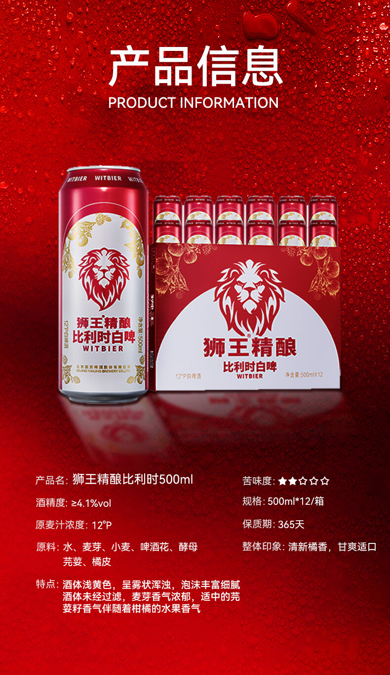 狮王精酿啤酒 燕京啤酒 麦汁浓度12度 500ml 比利时白啤 比利时白啤 500mL 12瓶 整箱装 3月份到期