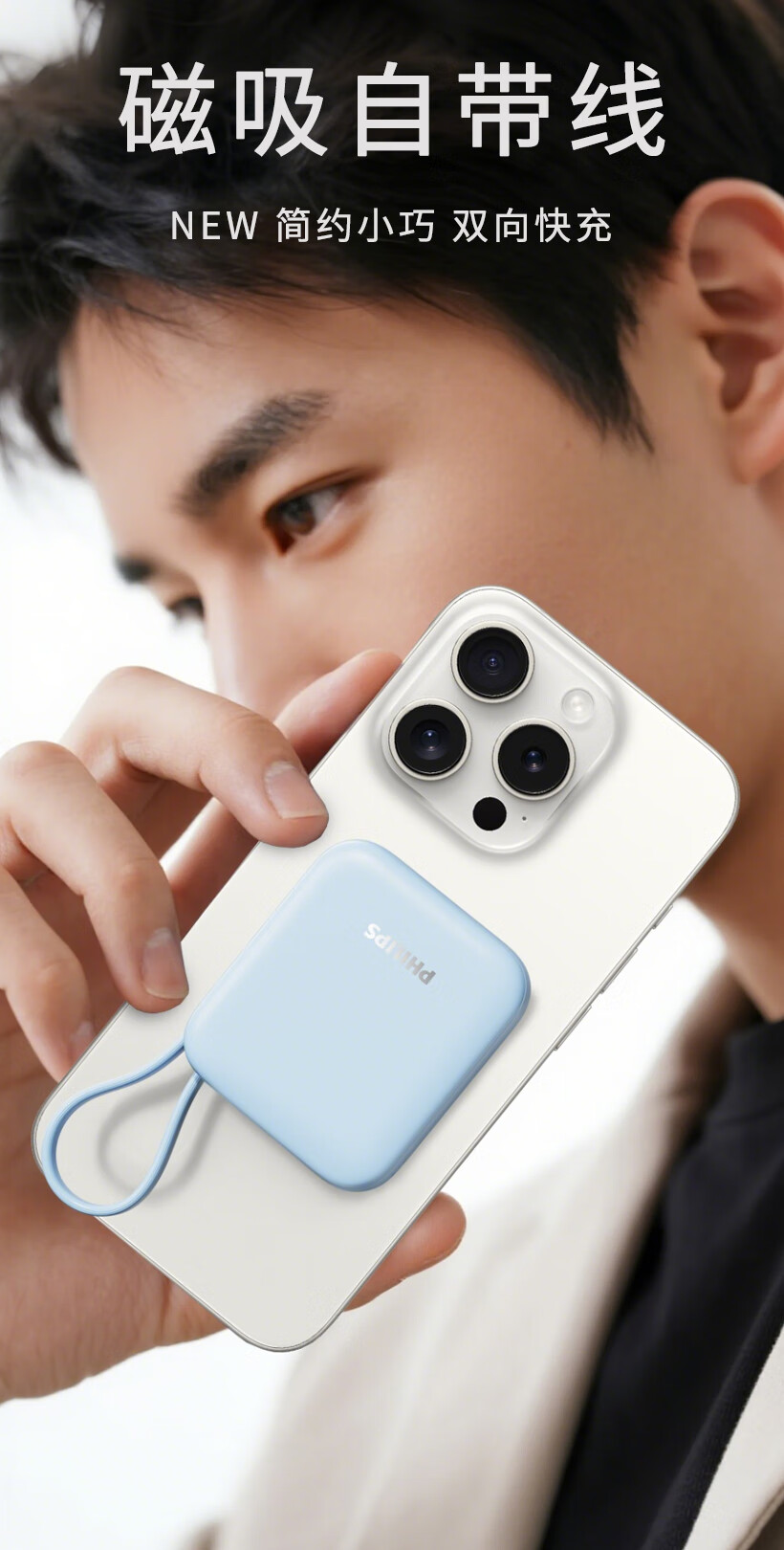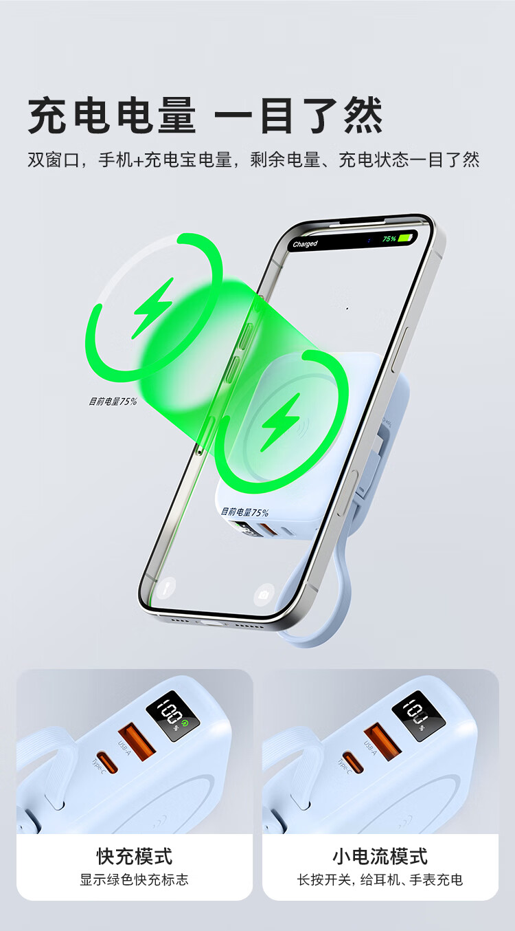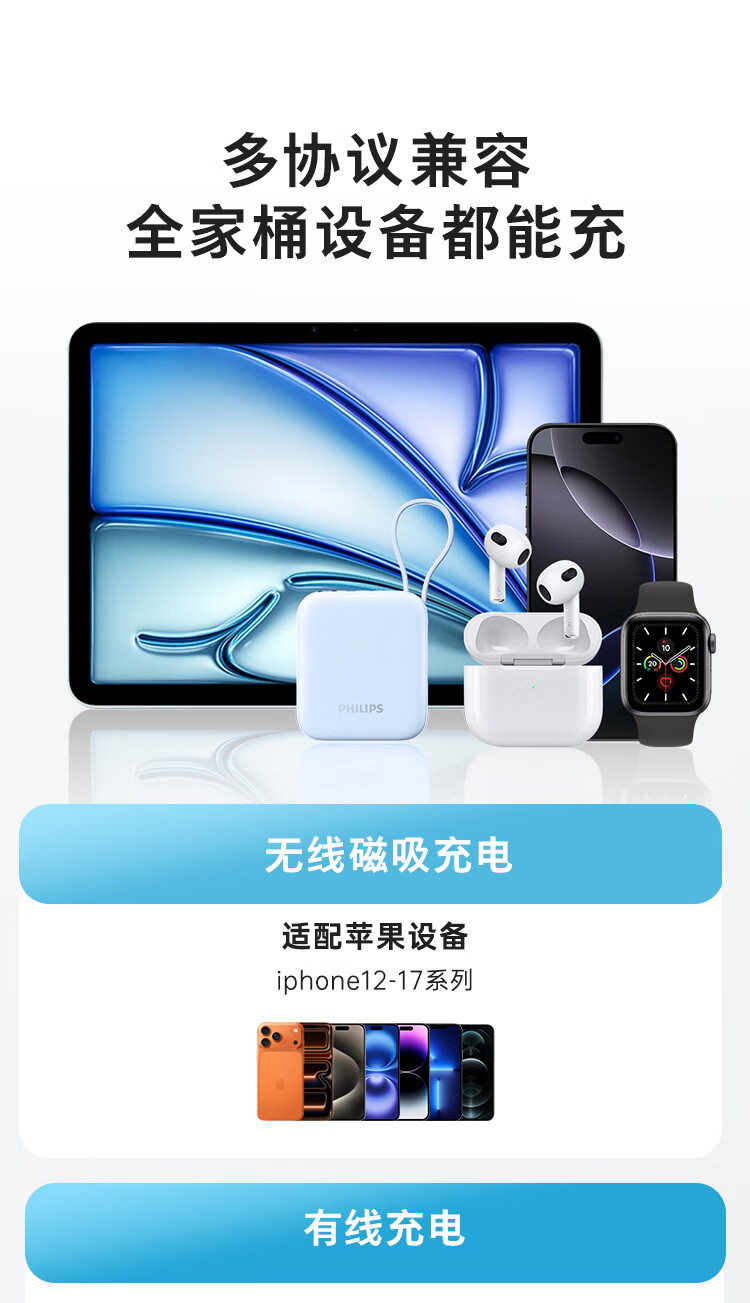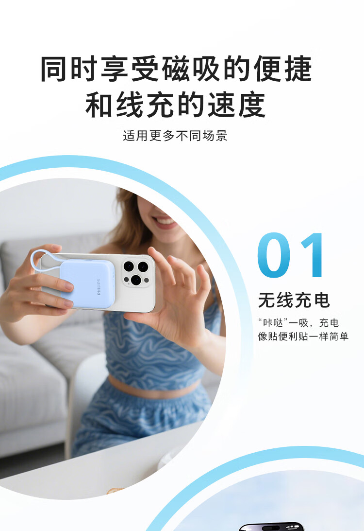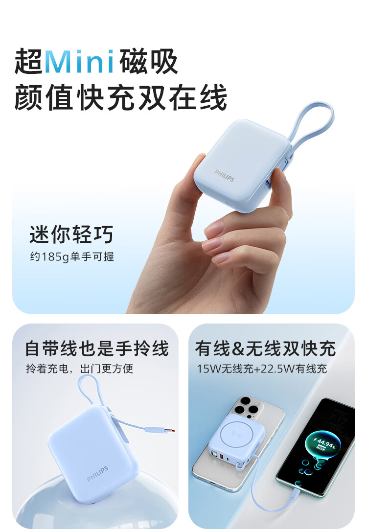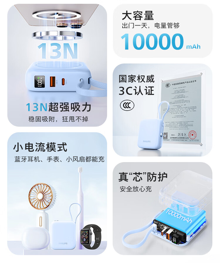 飞利浦【国标3C认证可上飞机】充电宝磁吸自带线快充10000mAh迷你小巧便携移动电源适用苹果15 16 17华为