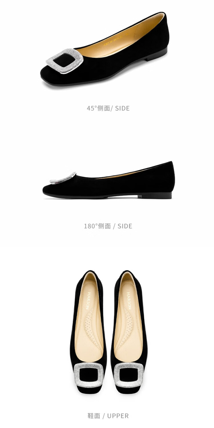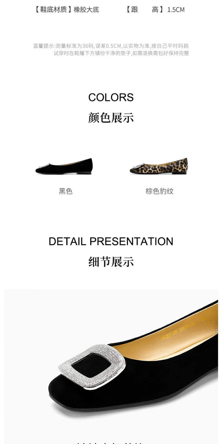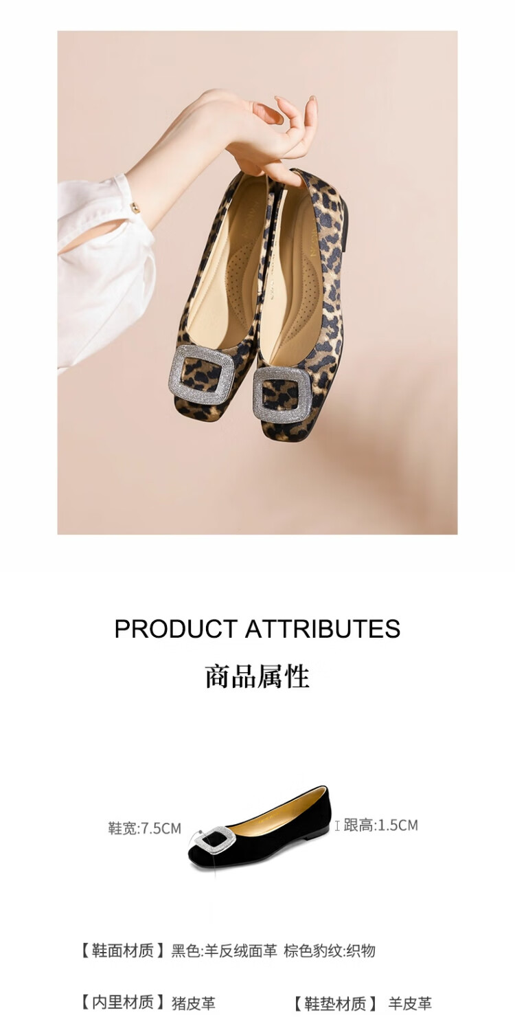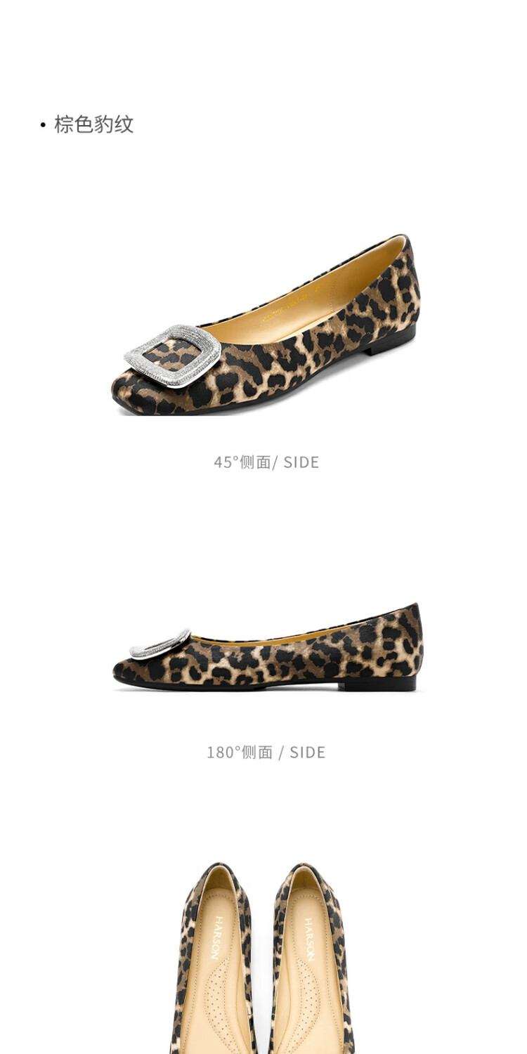 哈森方头浅口休闲单鞋2025秋季新款豹纹平跟通勤女鞋HS267106 黑色 羊反绒面革 36