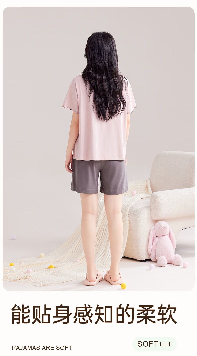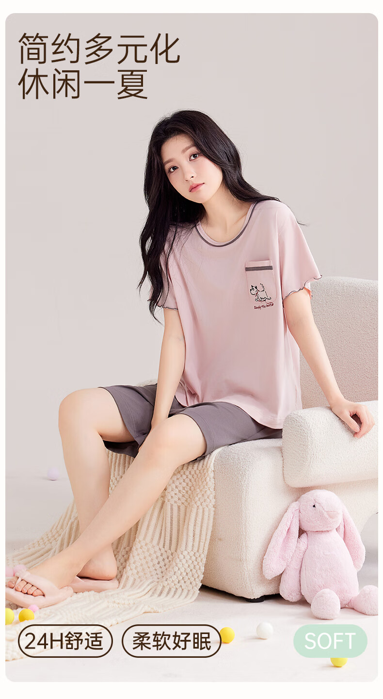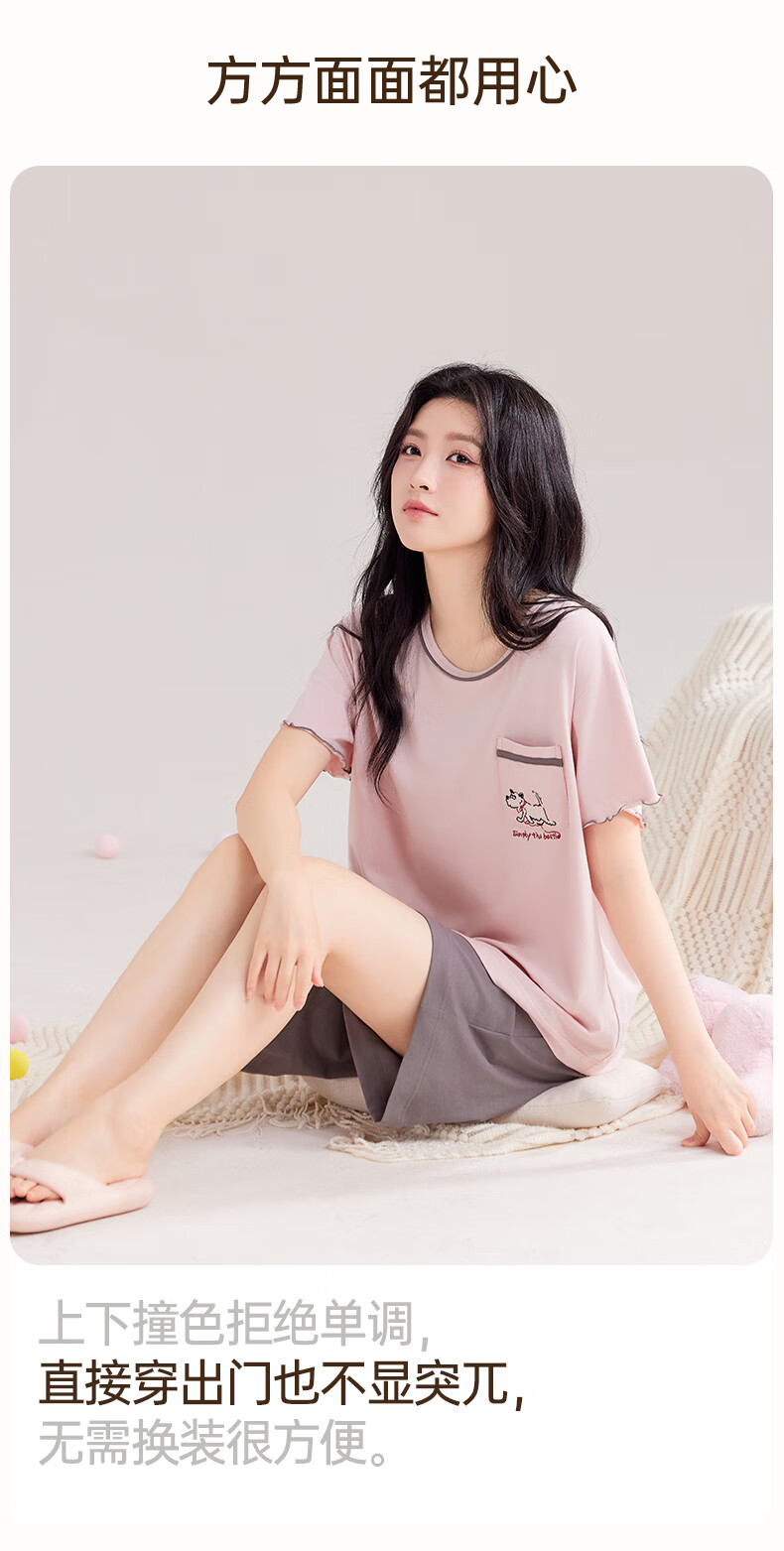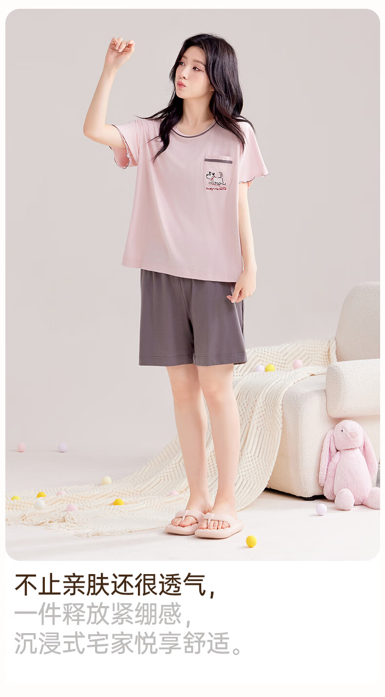 玛伦萨睡衣女夏季2025新款可外穿薄款圆领短袖短裤套装女士家居服 藕粉 M