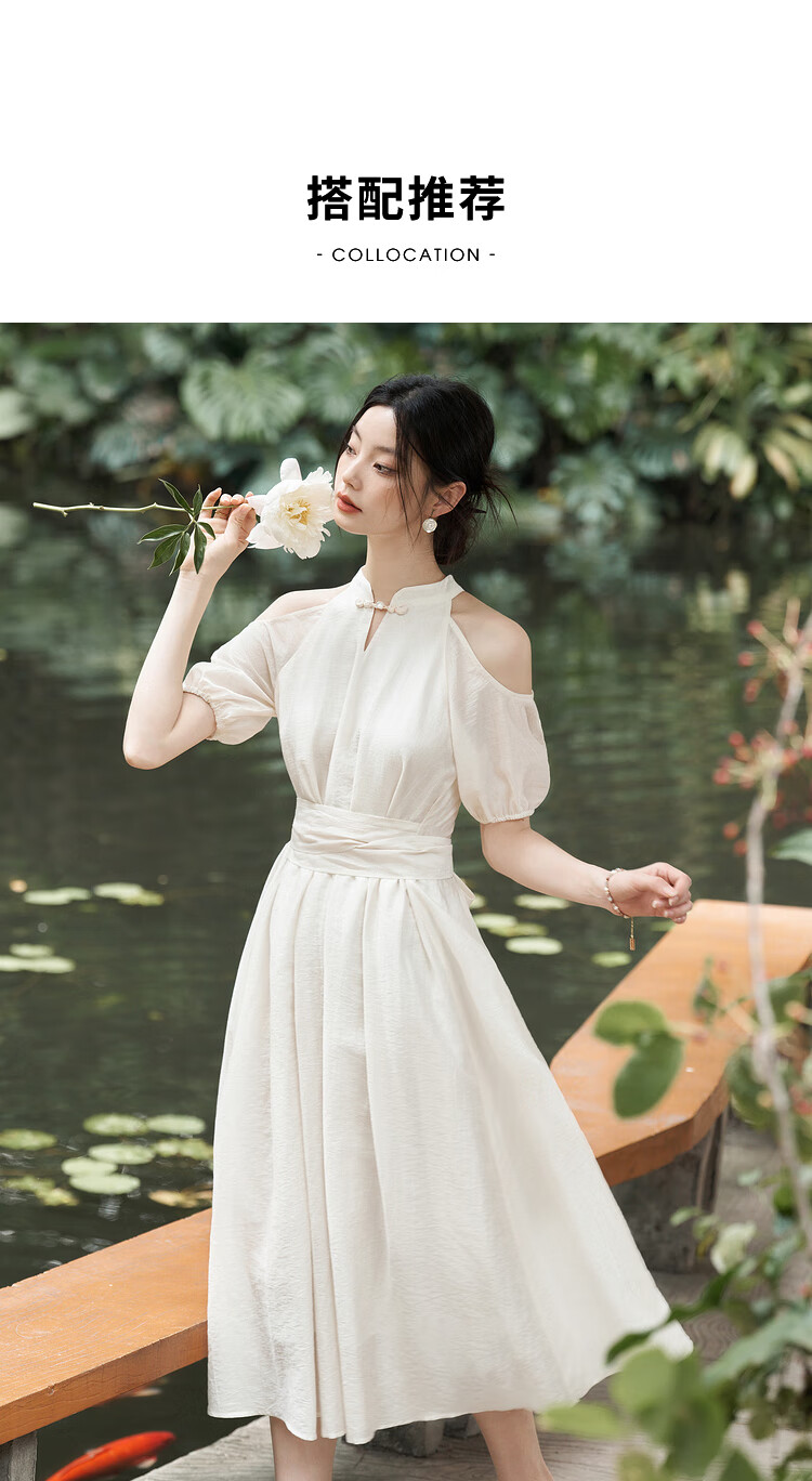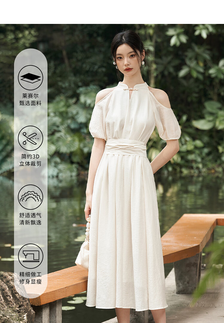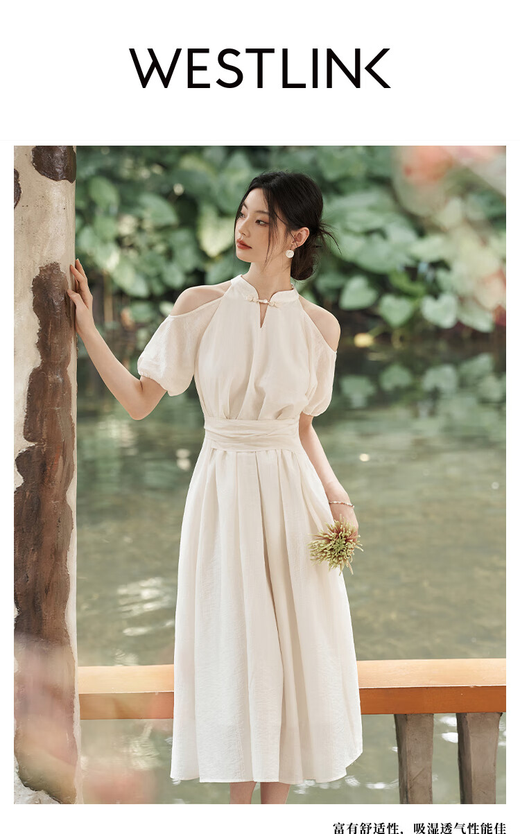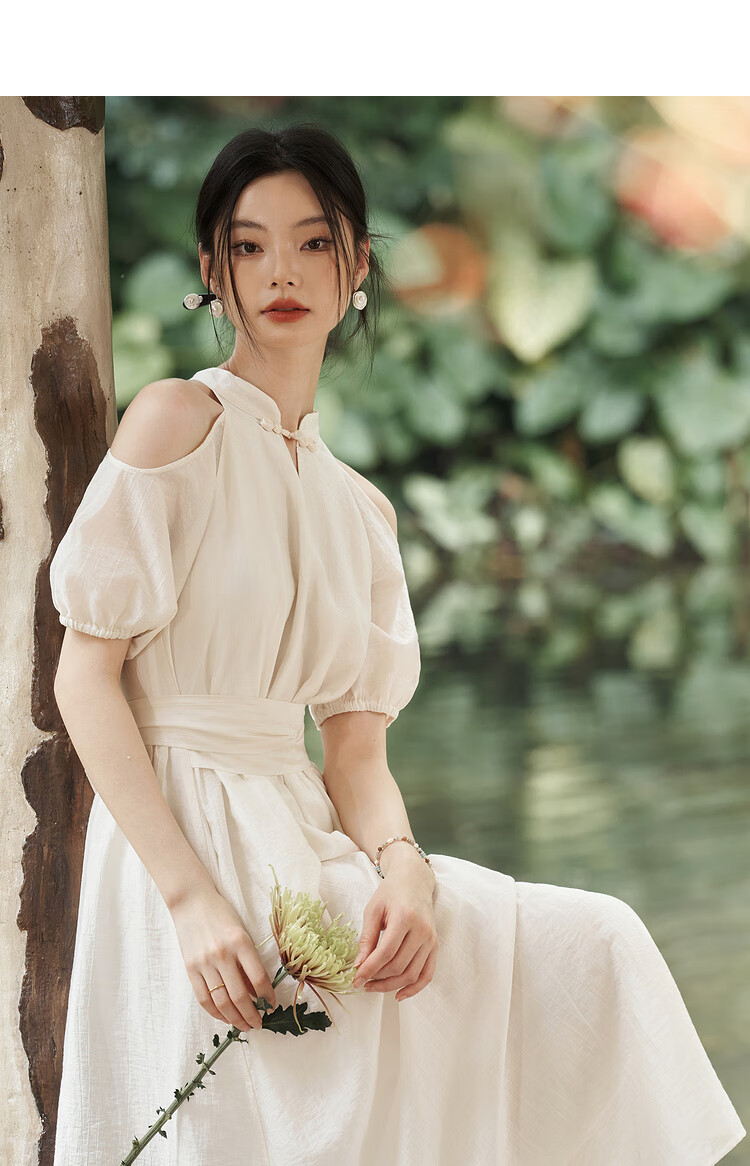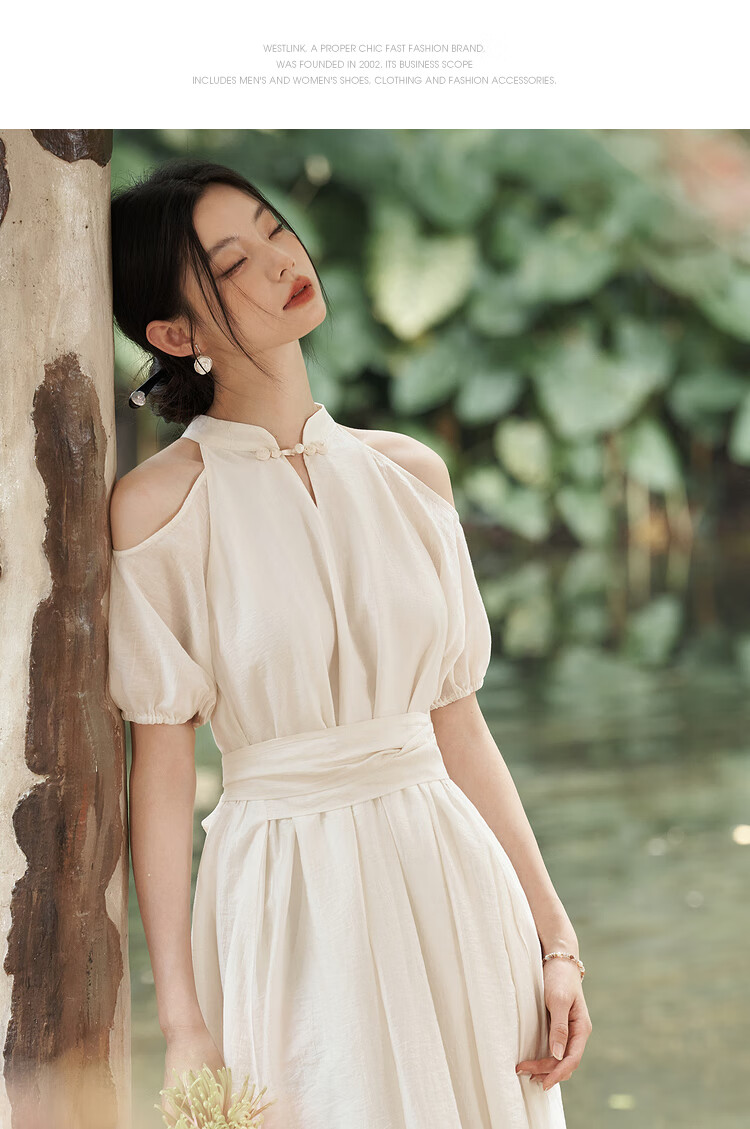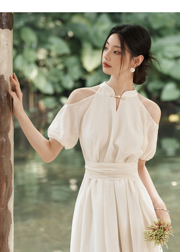 西遇挂脖连衣裙女2025夏季新款温柔水滴盘扣高腰新中式国风长裙 杏色 L