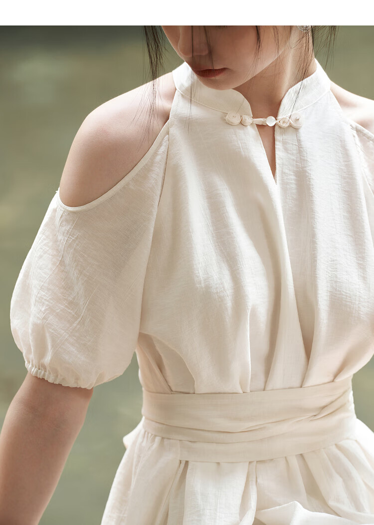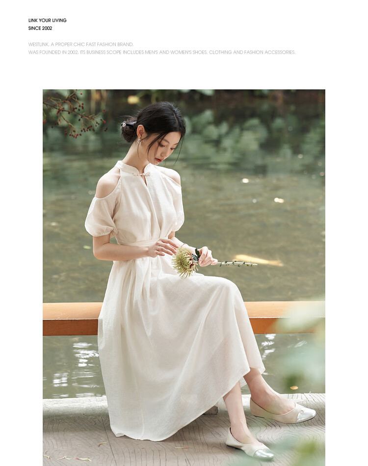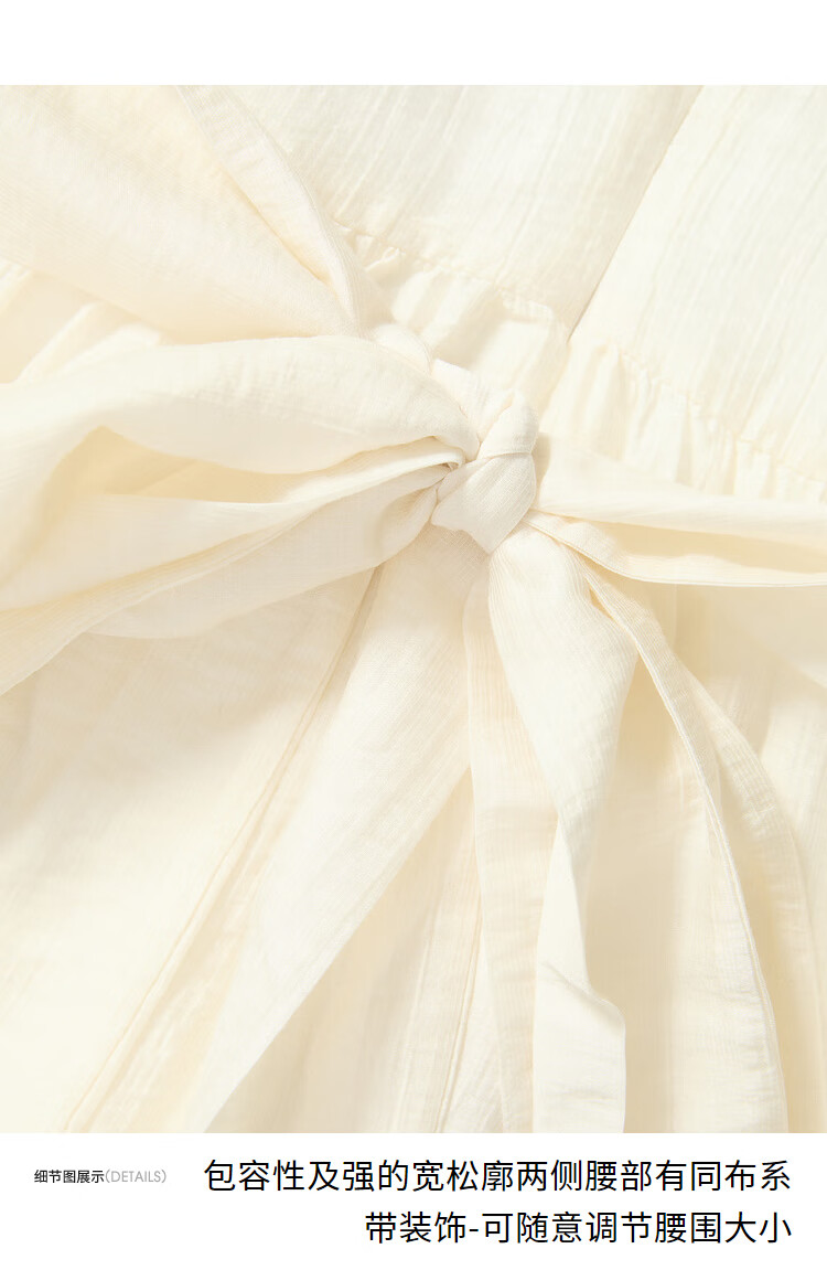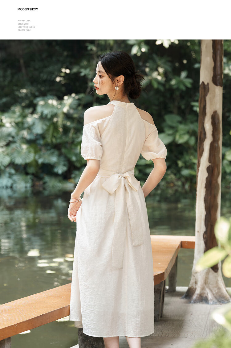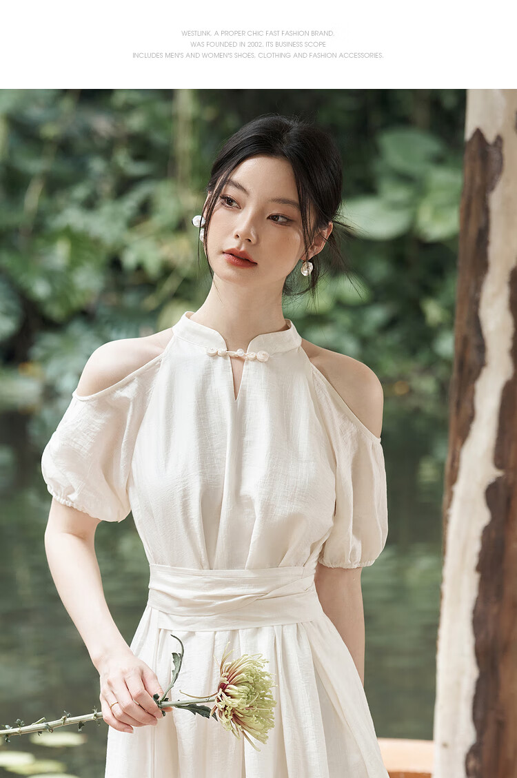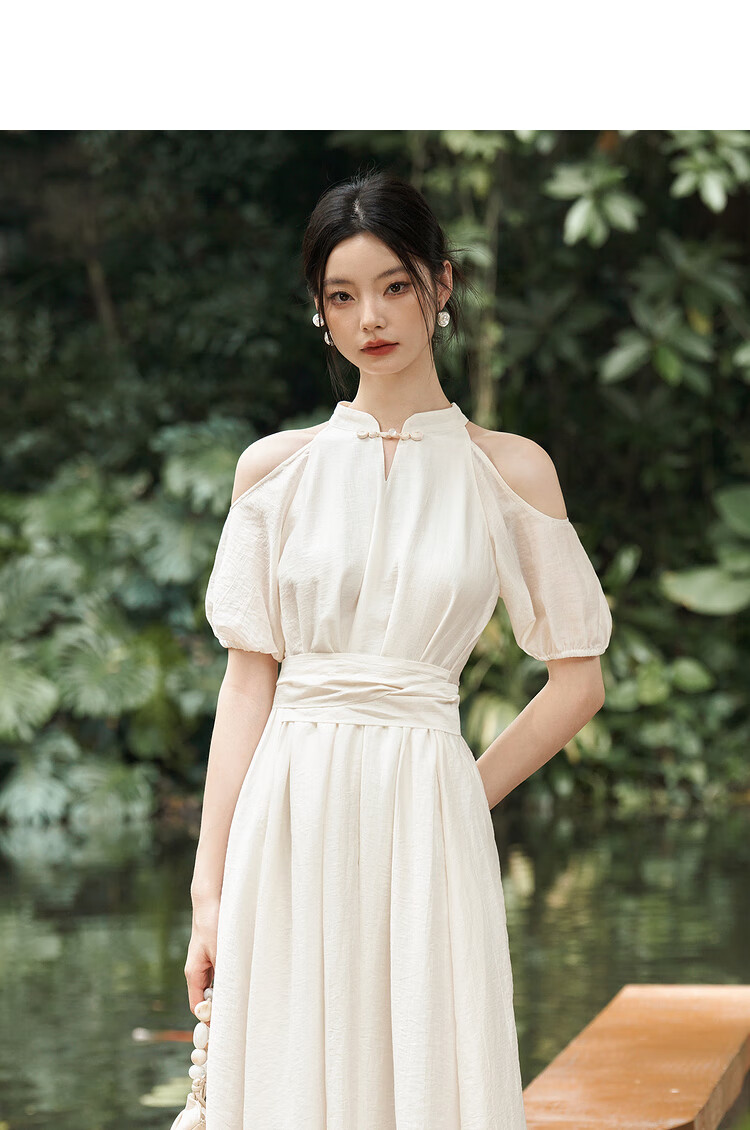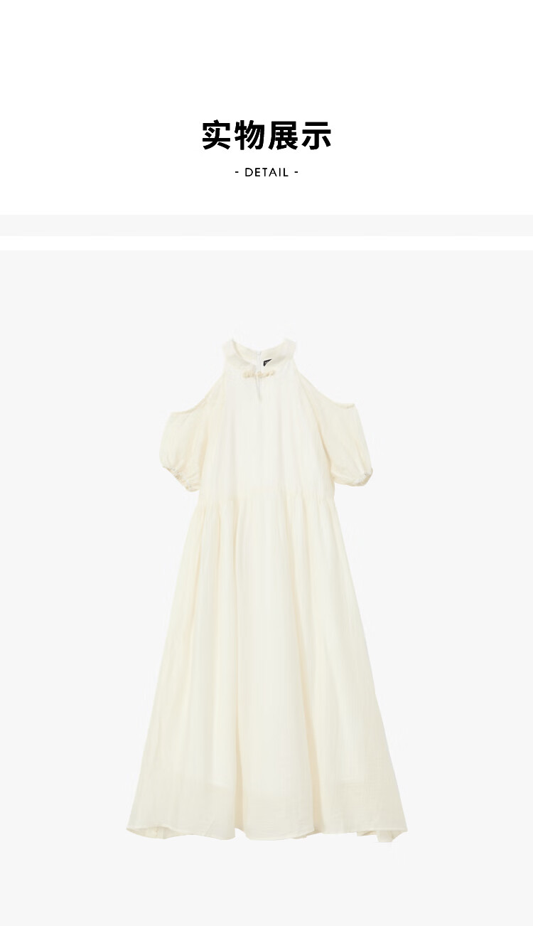 西遇挂脖连衣裙女2025夏季新款温柔水滴盘扣高腰新中式国风长裙 杏色 L
