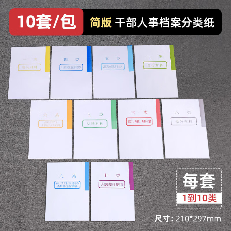 三益档案 干部人事档案盒分类纸简版新版彩色十大类分隔纸姓名标签背脊条分类角分号角 新版彩色十大类分隔纸【10套-100张】