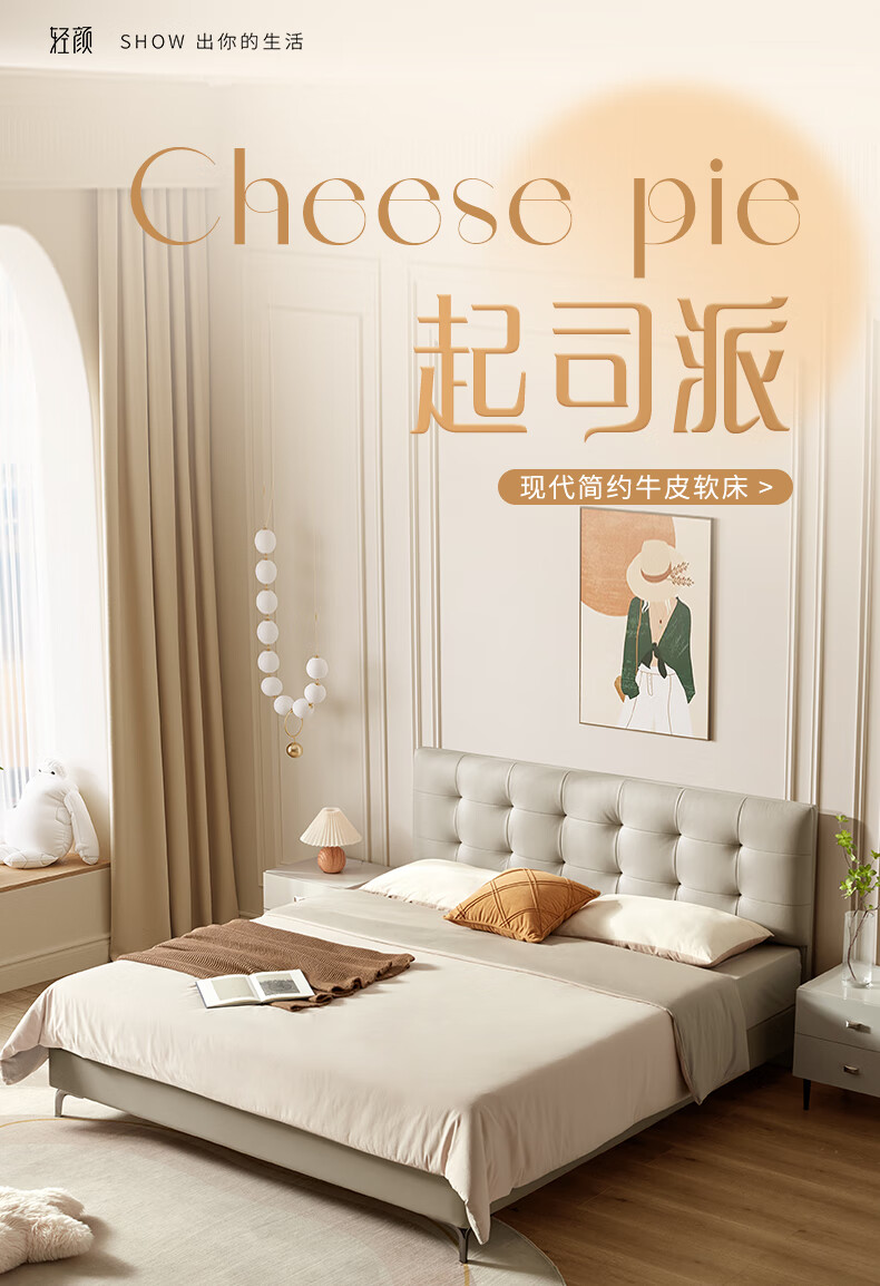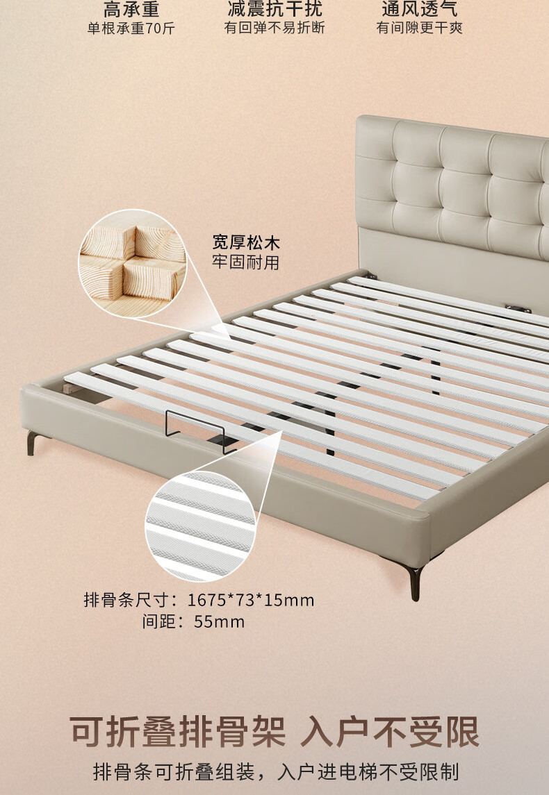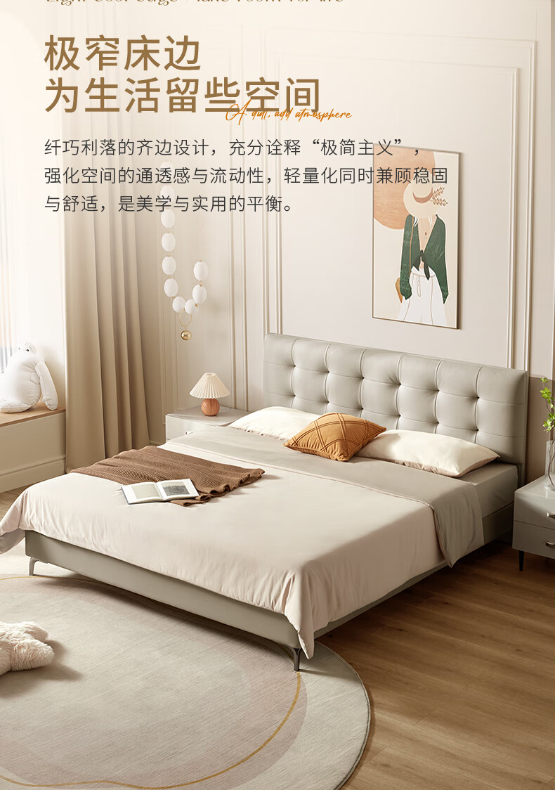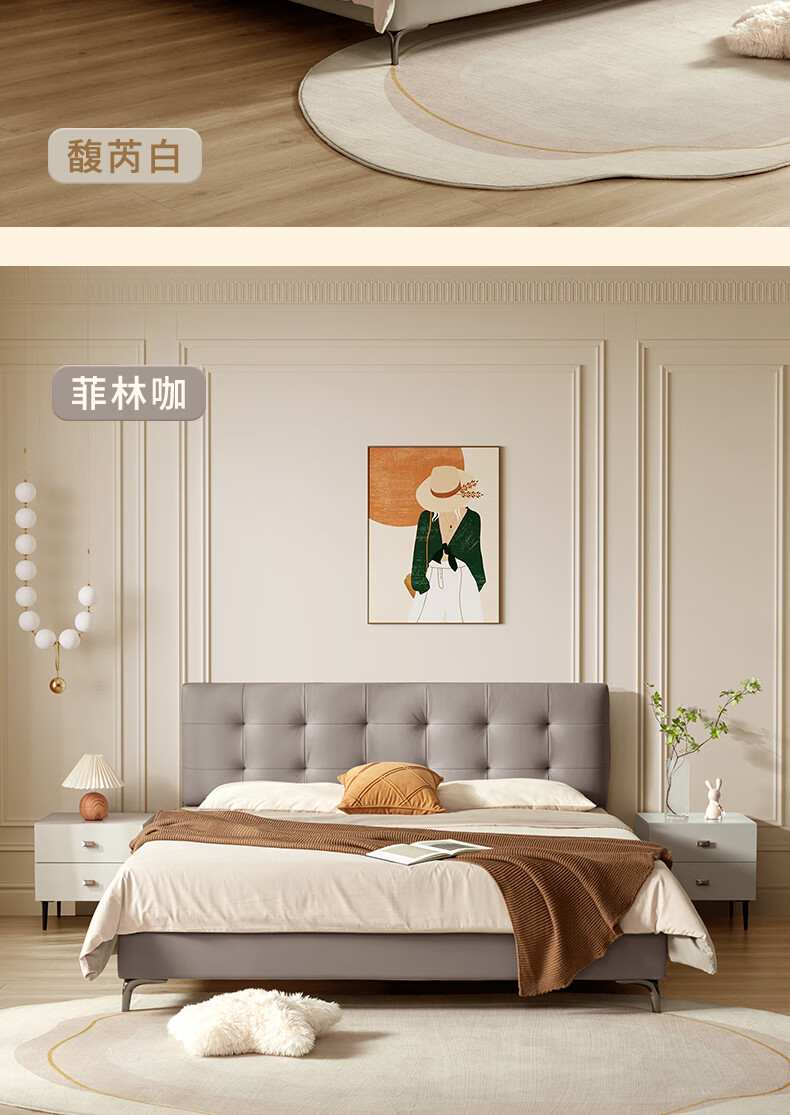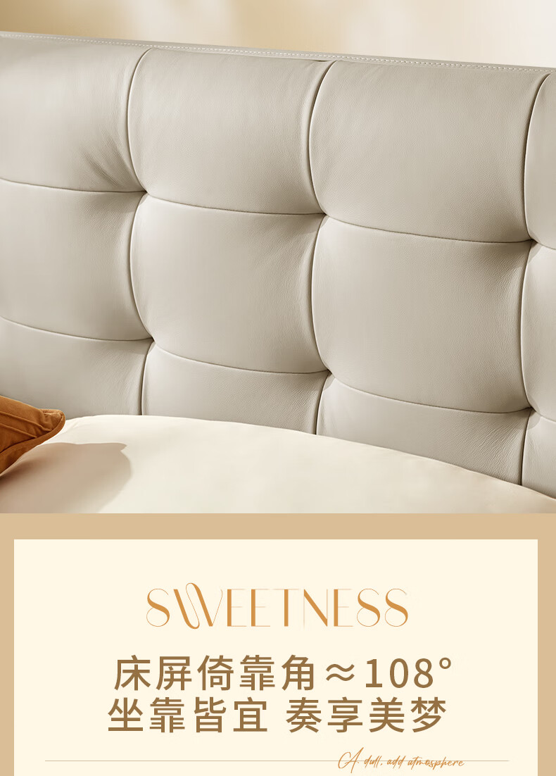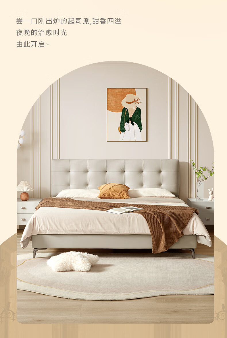 顾家家居华夫格奶油风头层牛皮床双人床卧室DS8109B馥芮白高脚款1.8