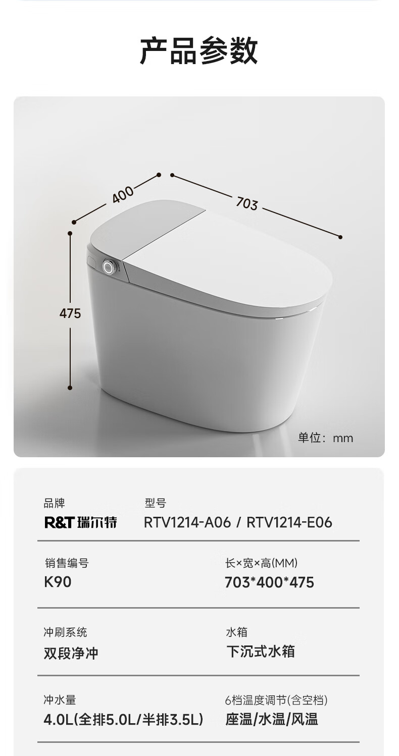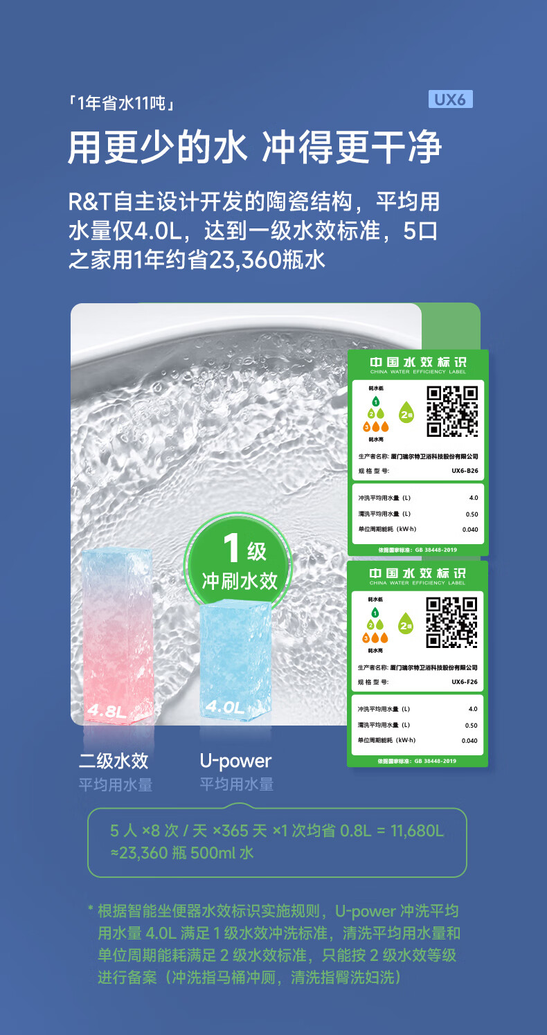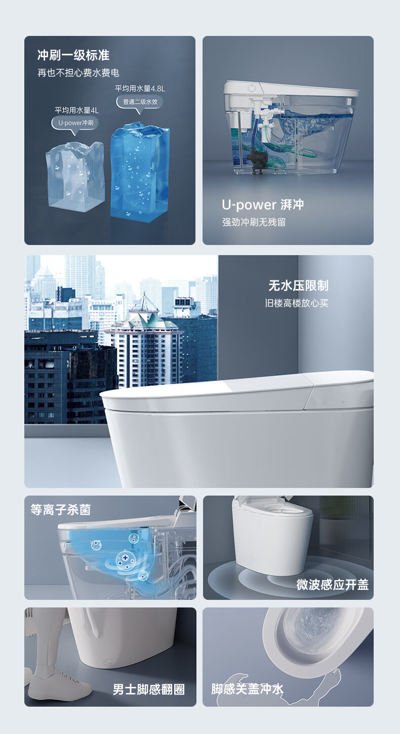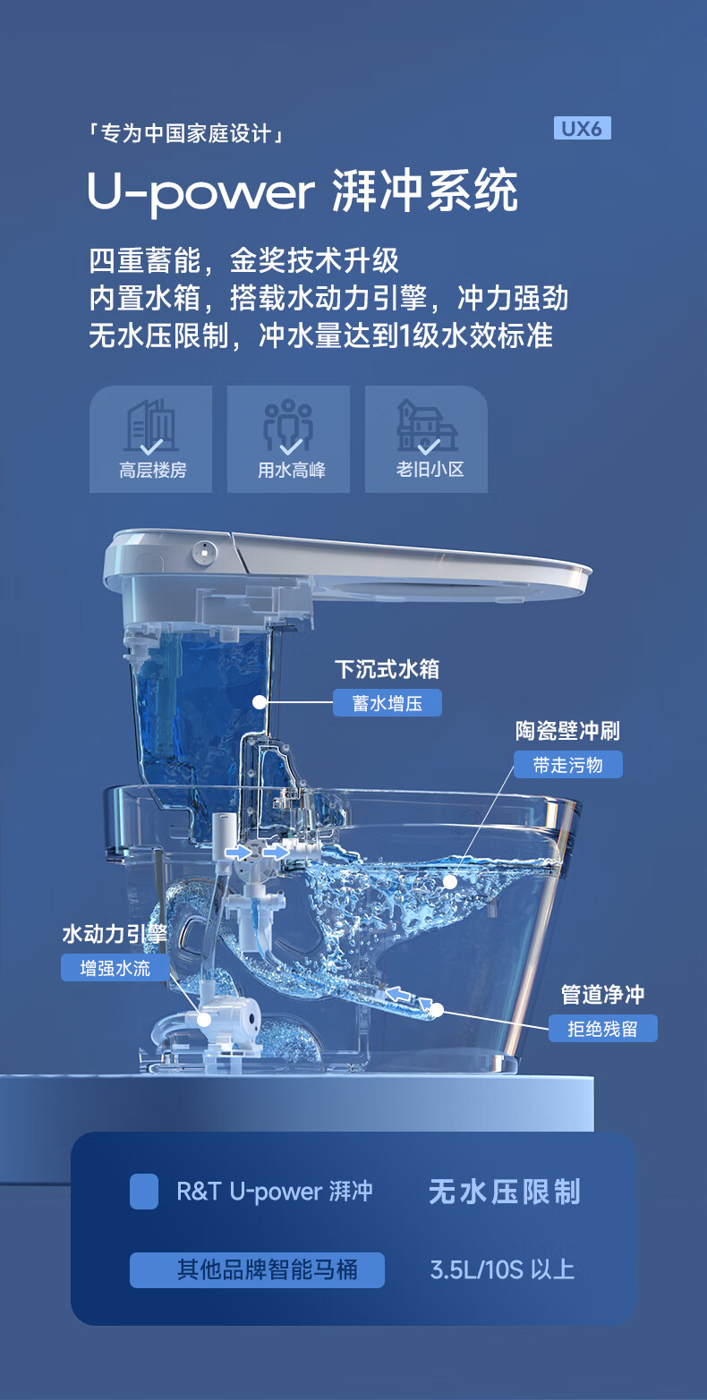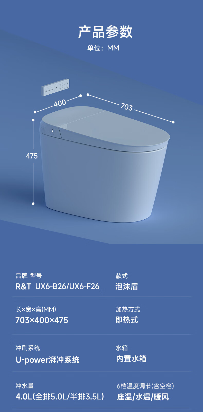 瑞尔特(R&T)自动开盖等离子杀菌无水压限制智能马桶 UX6 305/300mm