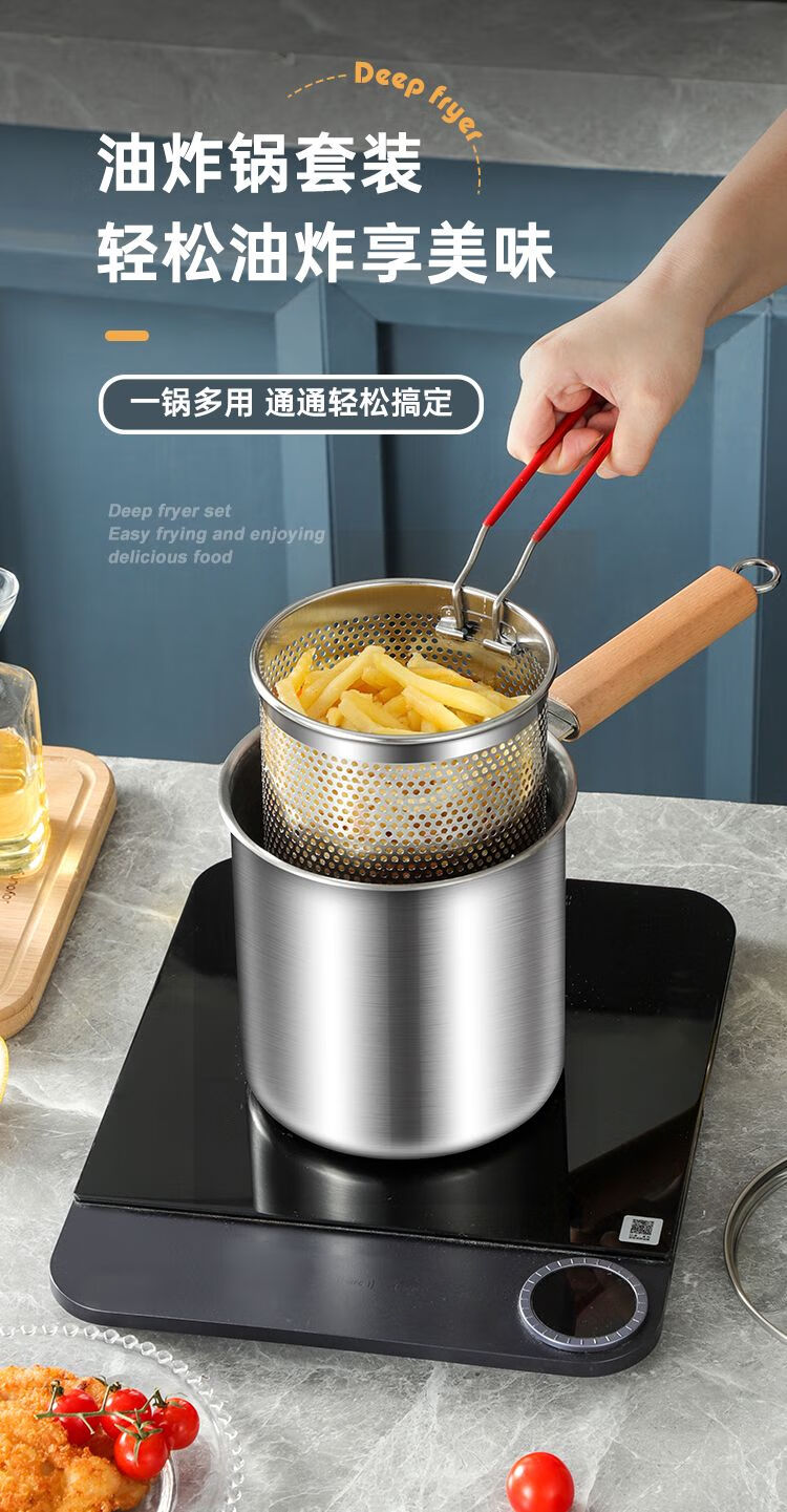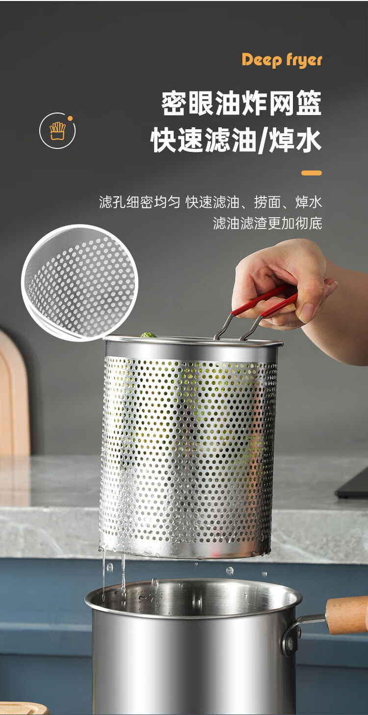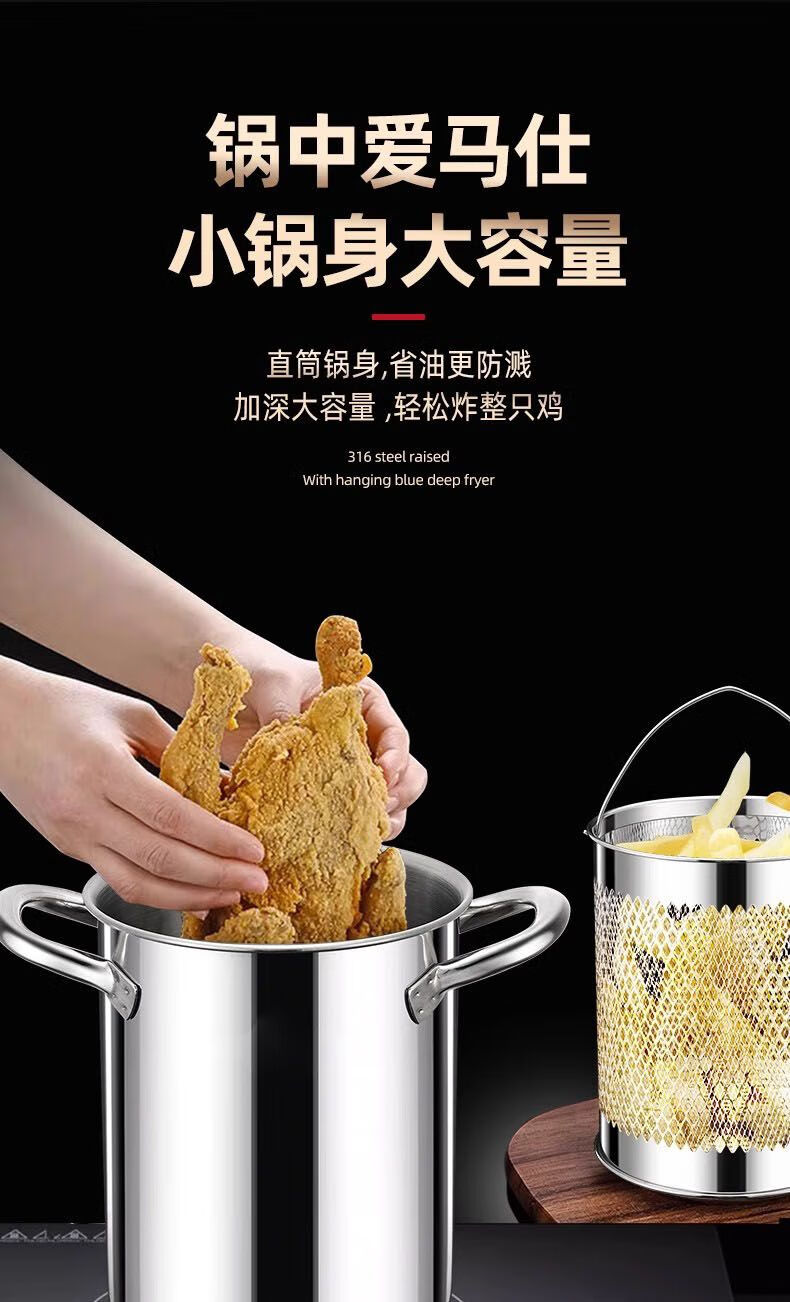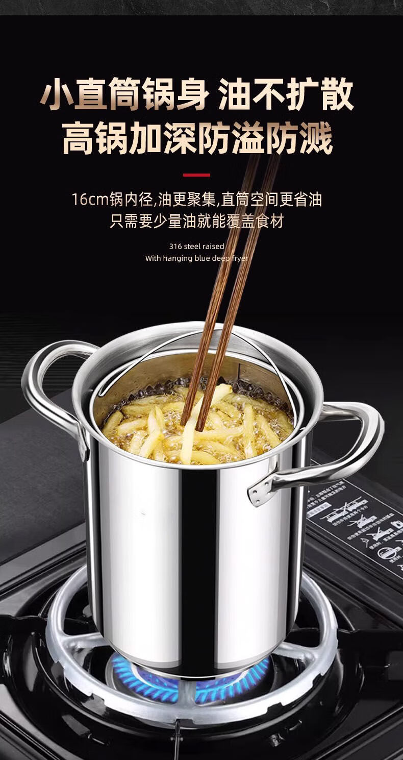 金汤银饺316不锈钢双耳油锅直筒家用炸鸡薯条省油小锅 油泼面 油炸锅 双耳炸锅+沥油篮 16.5cm 3L