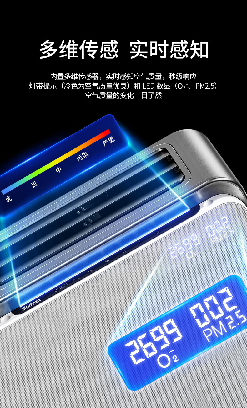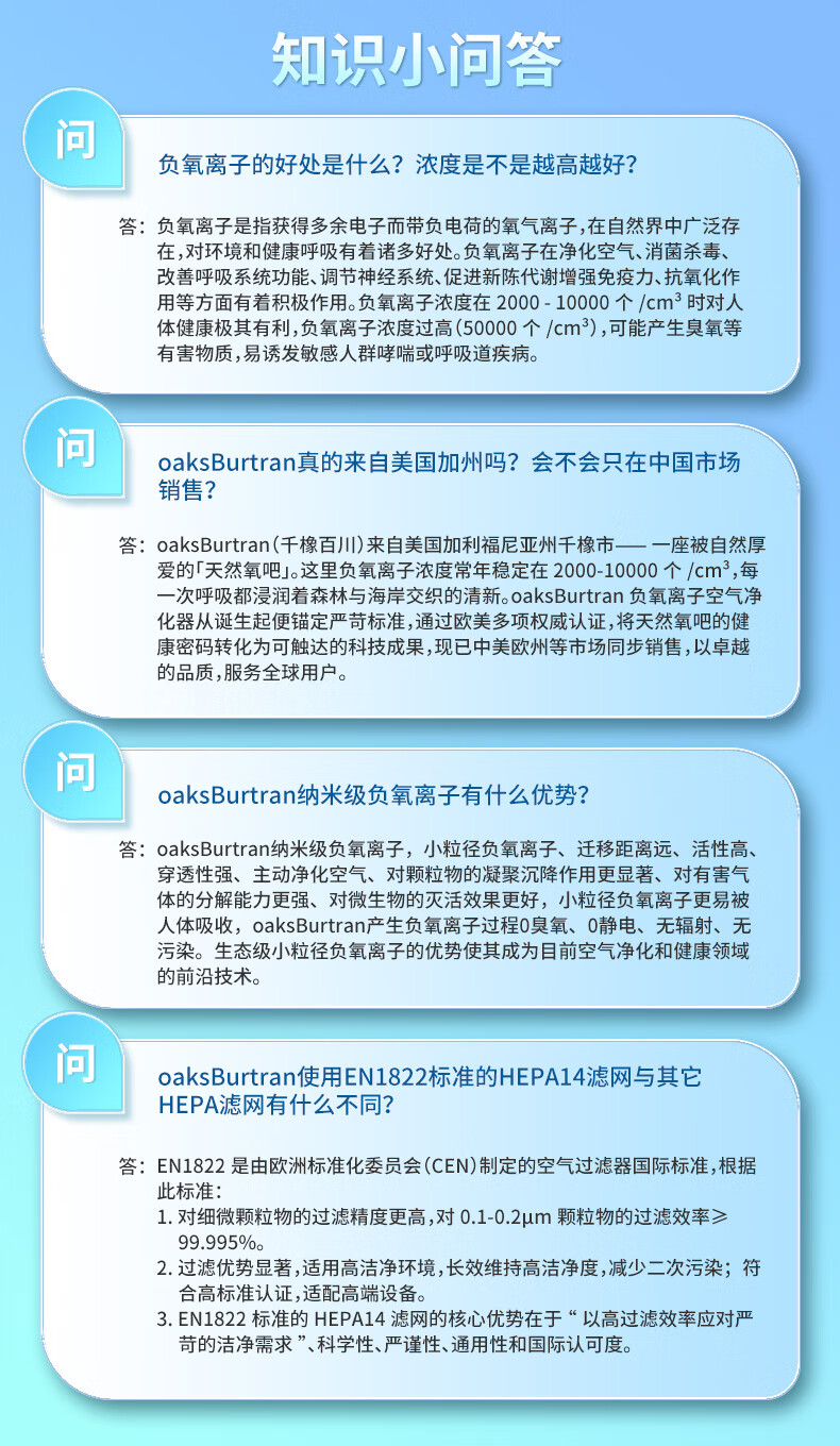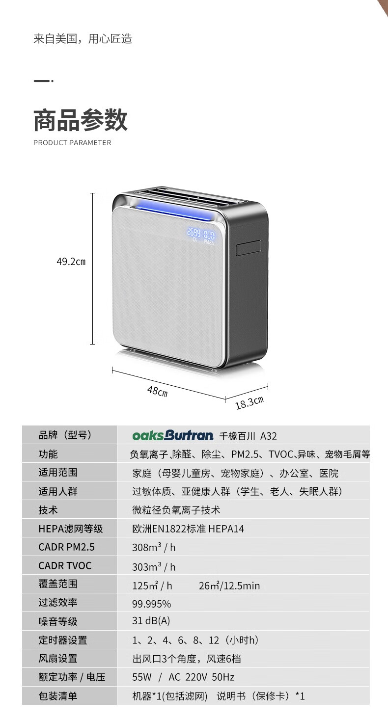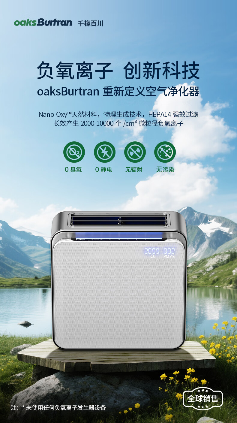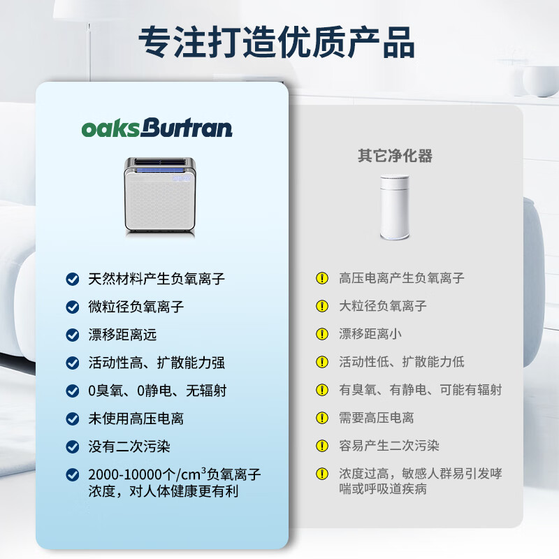 oaksBurtran美国千橡百川负氧离子空气净化器除甲醛PM2.5除异味消毒杀菌宠物毛屑 母婴家用0臭氧负氧离子A32