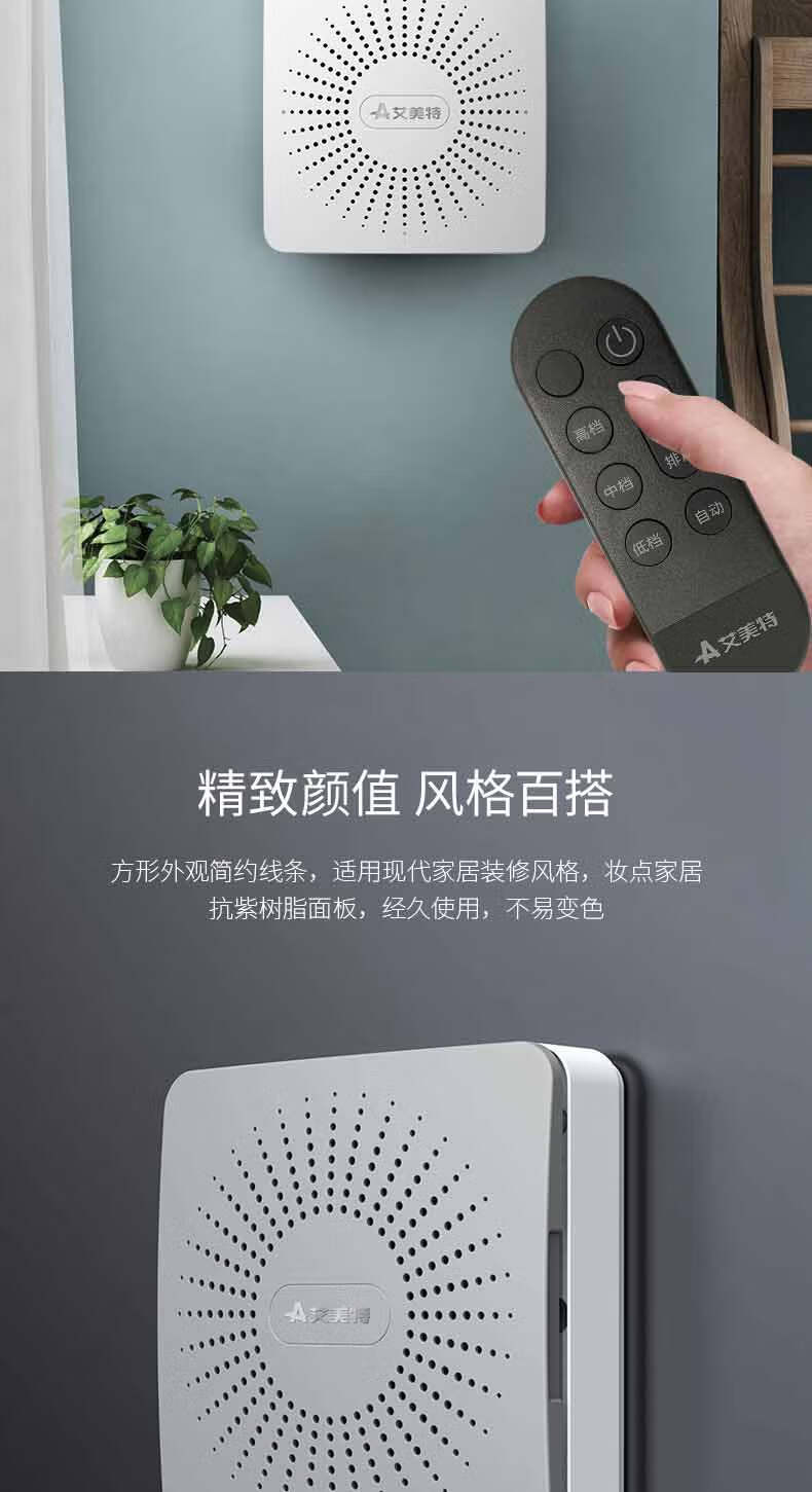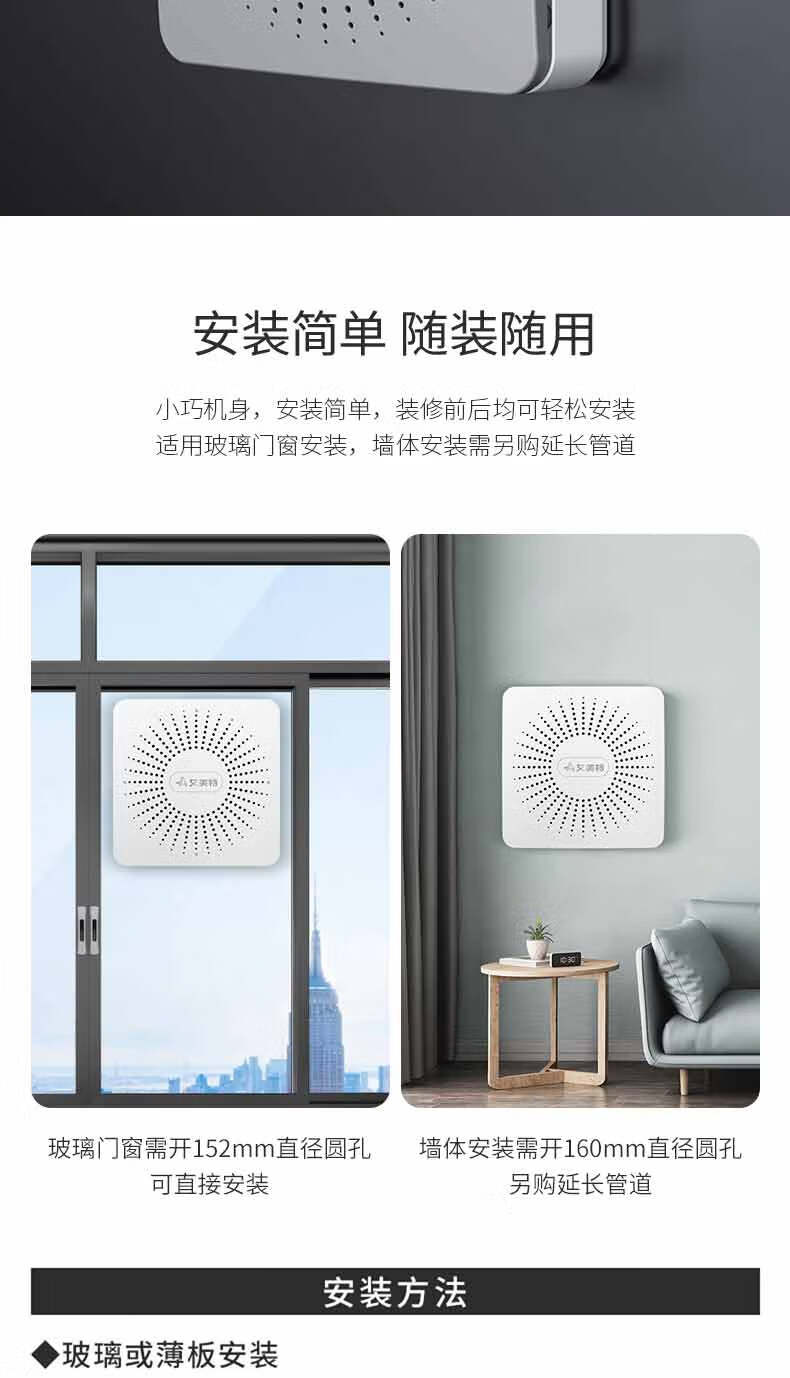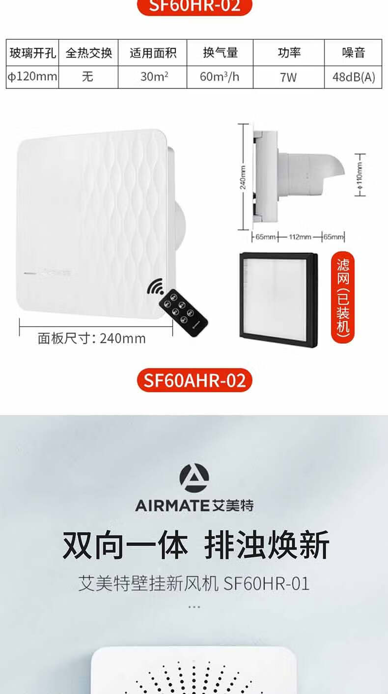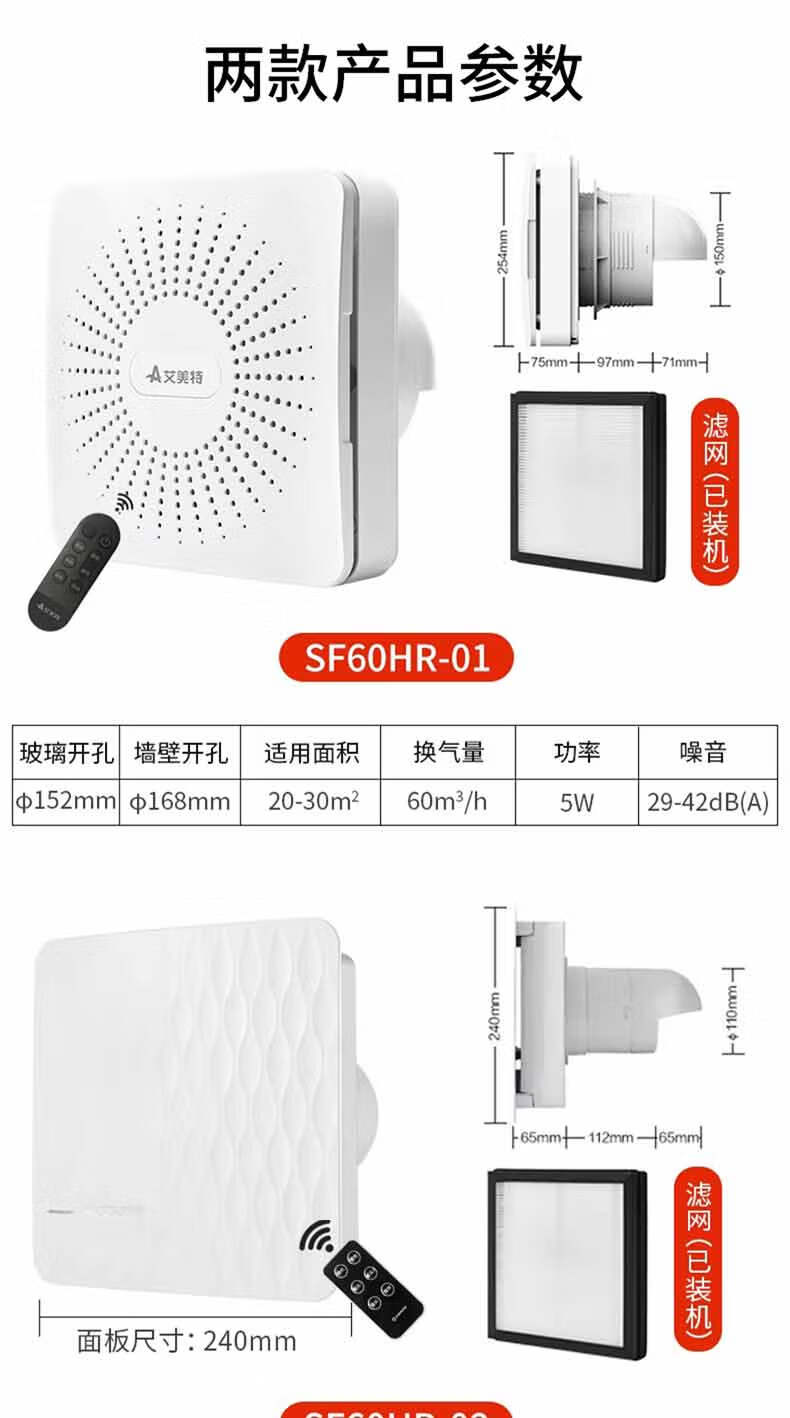 艾美特新风系统家用壁挂式墙壁窗式静音换气机室内双向空气净化器新风机 SF60HR-01开孔尺寸152mm