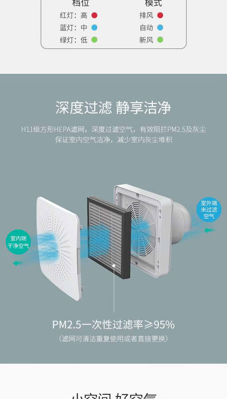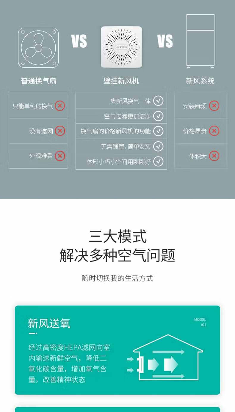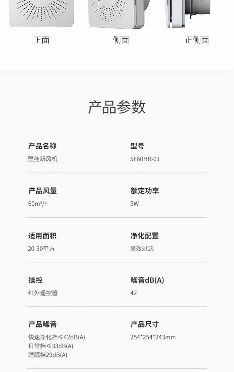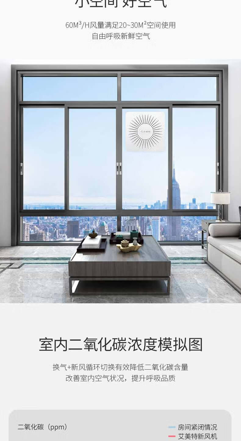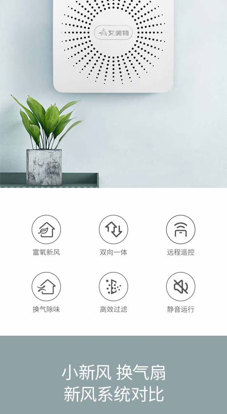 艾美特新风系统家用壁挂式墙壁窗式静音换气机室内双向空气净化器新风机 SF60HR-01开孔尺寸152mm