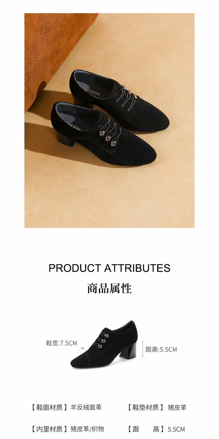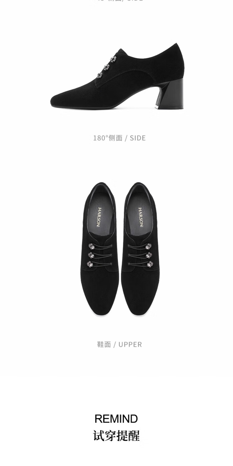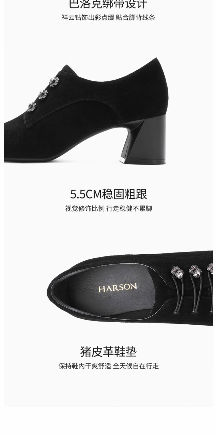 哈森黑色羊反绒面革粗高跟深口女鞋单鞋舒适妈妈鞋2025秋HL257140 黑色 羊反绒面革 36