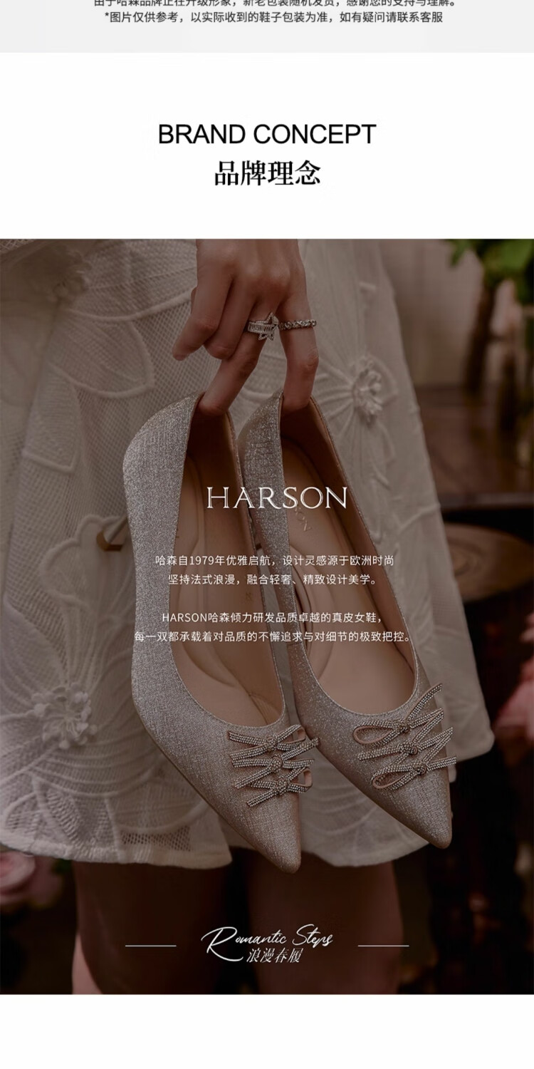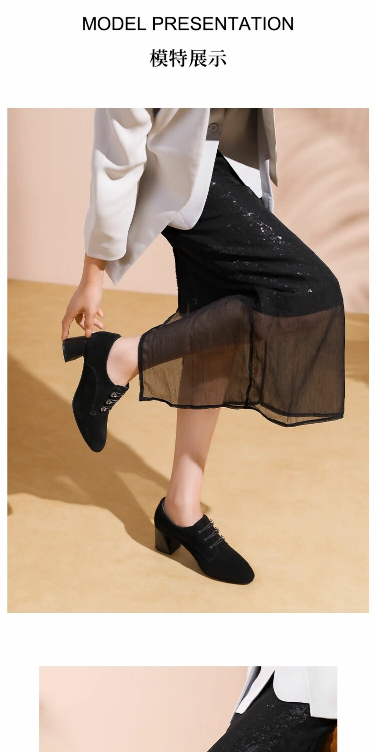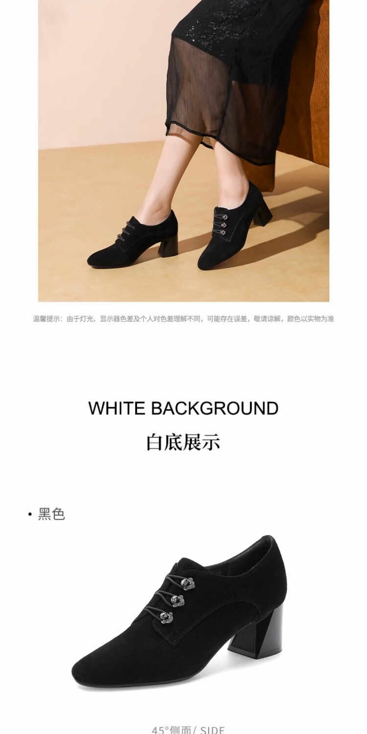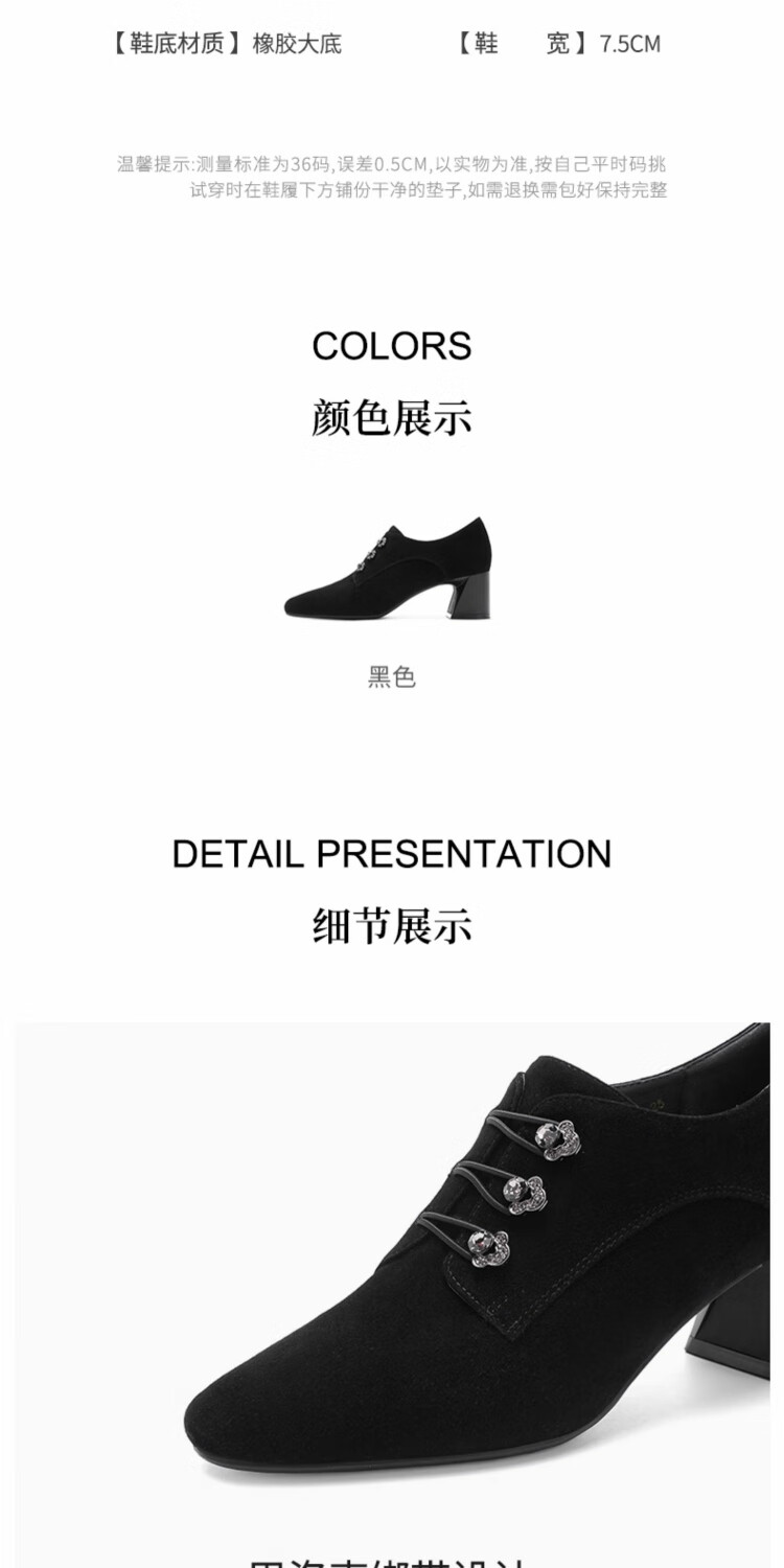 哈森黑色羊反绒面革粗高跟深口女鞋单鞋舒适妈妈鞋2025秋HL257140 黑色 羊反绒面革 36