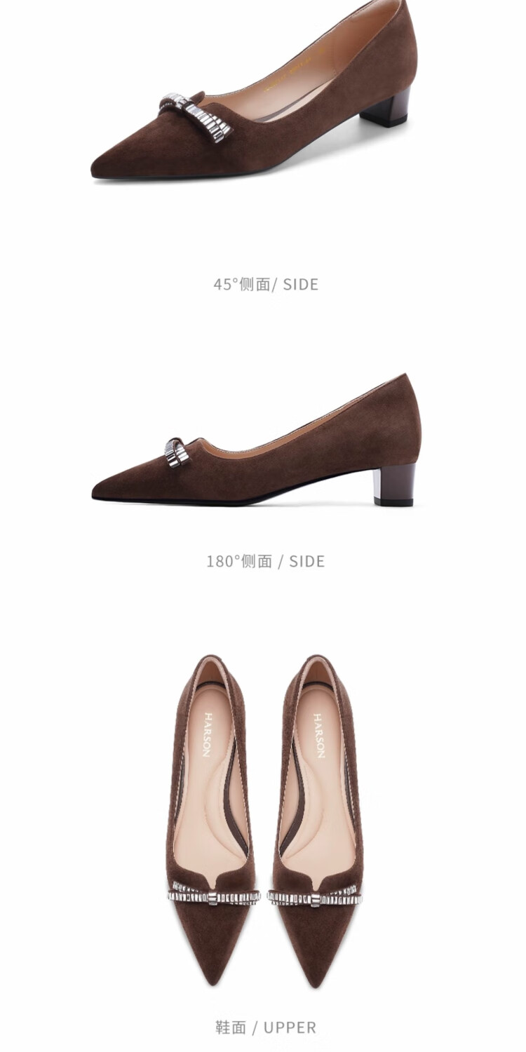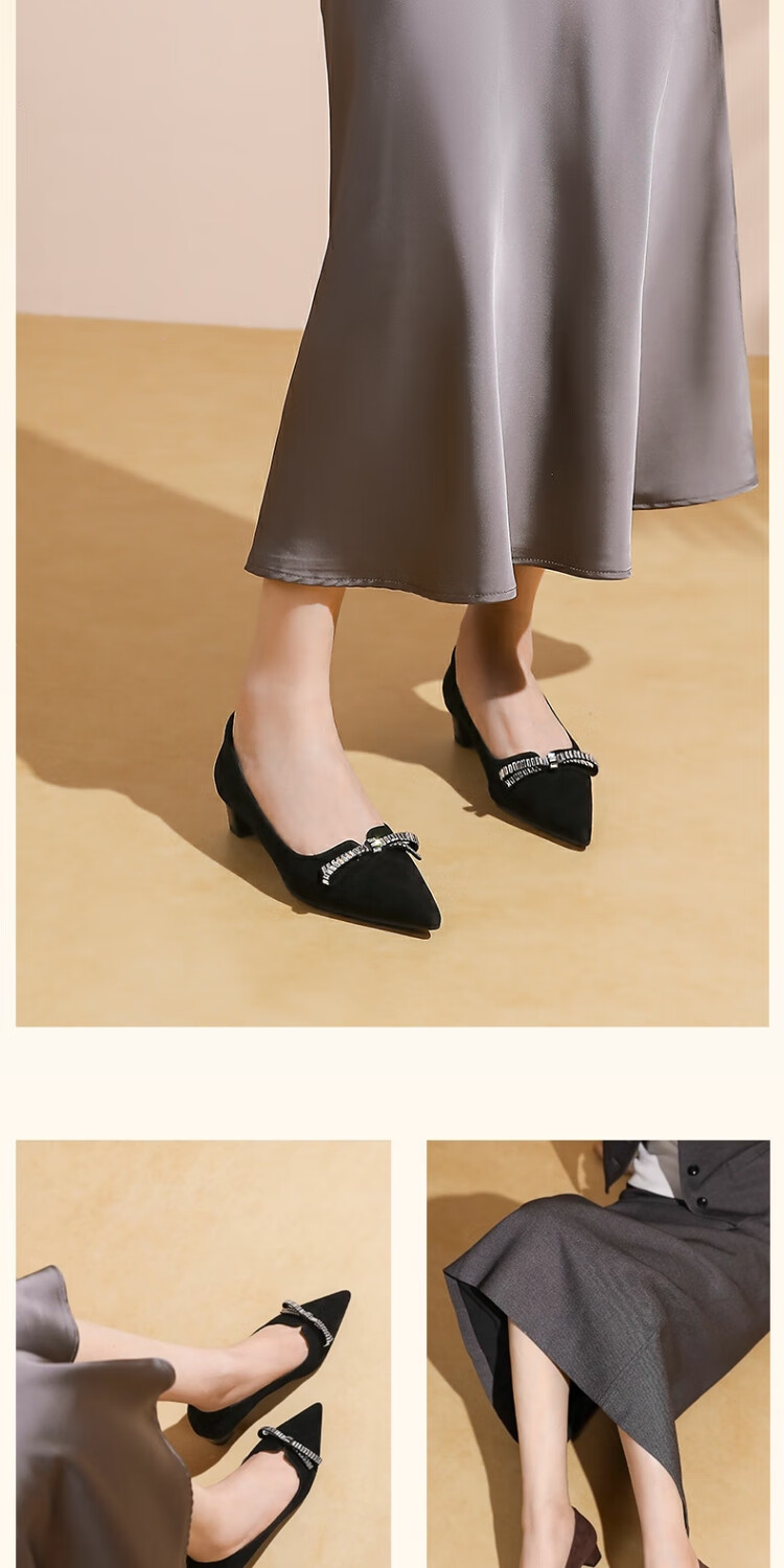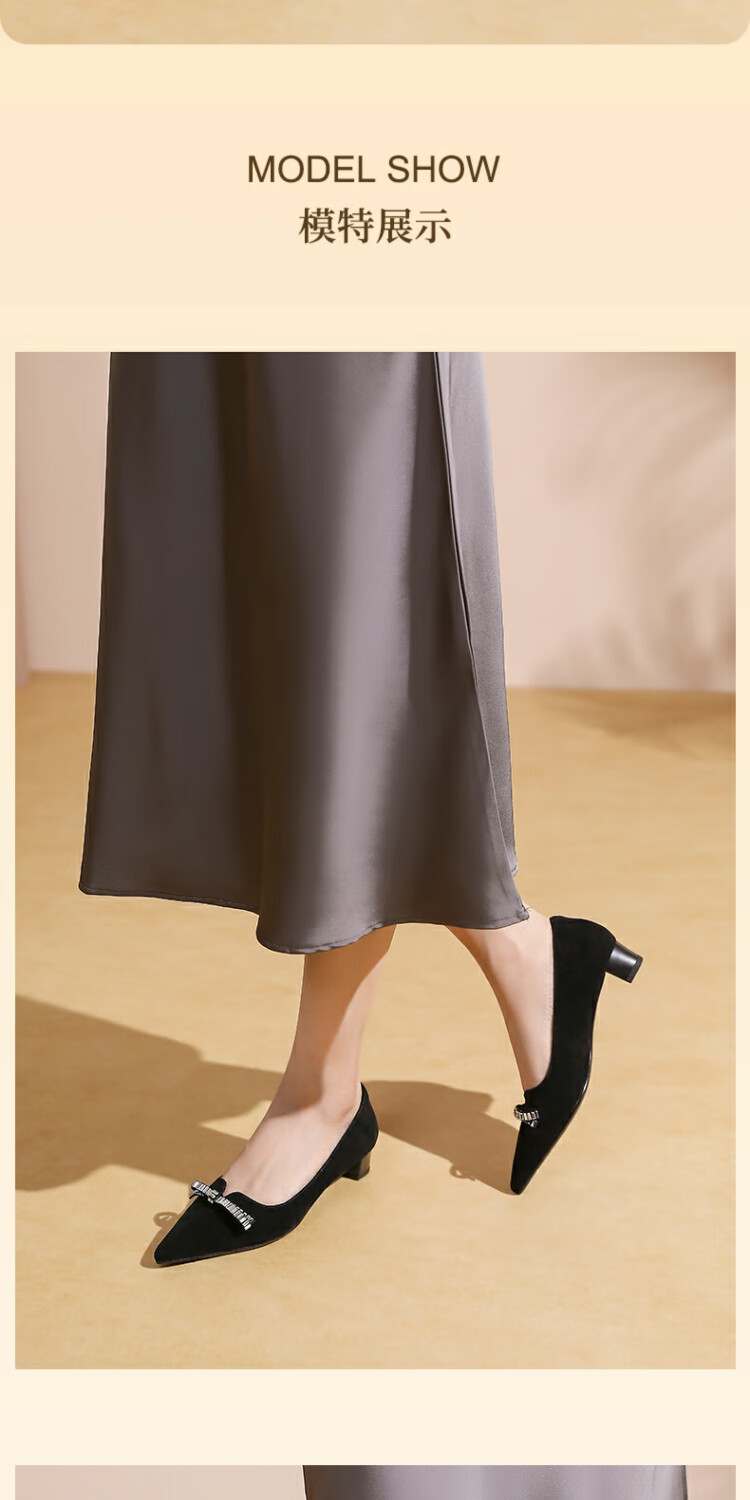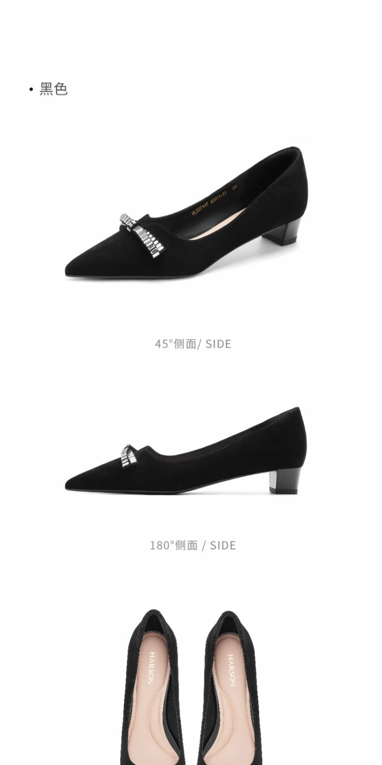 哈森通勤浅口单鞋2025秋季新款水钻蝴蝶结气质粗跟女鞋HL257147 黑色 羊反绒面革 35