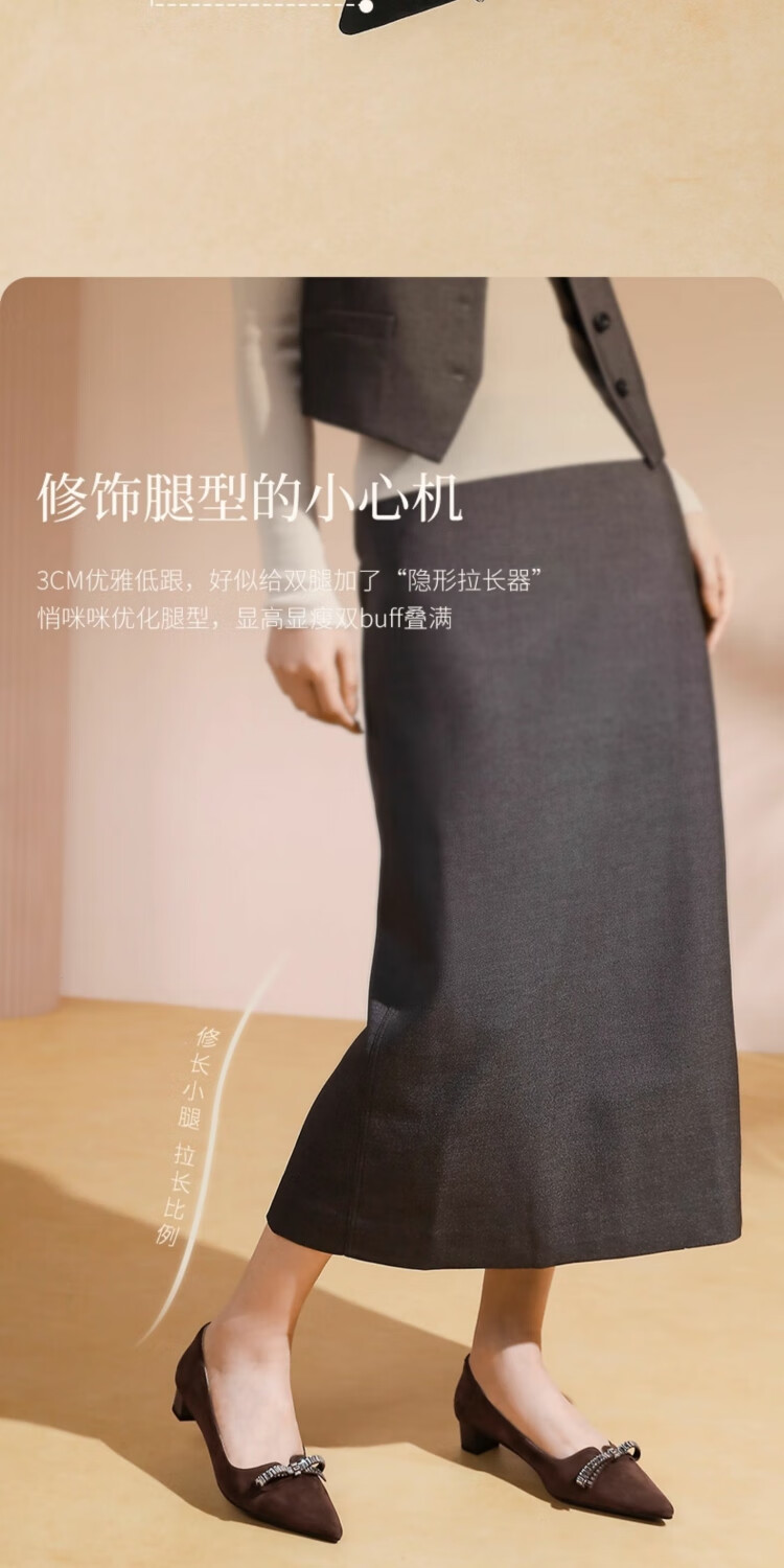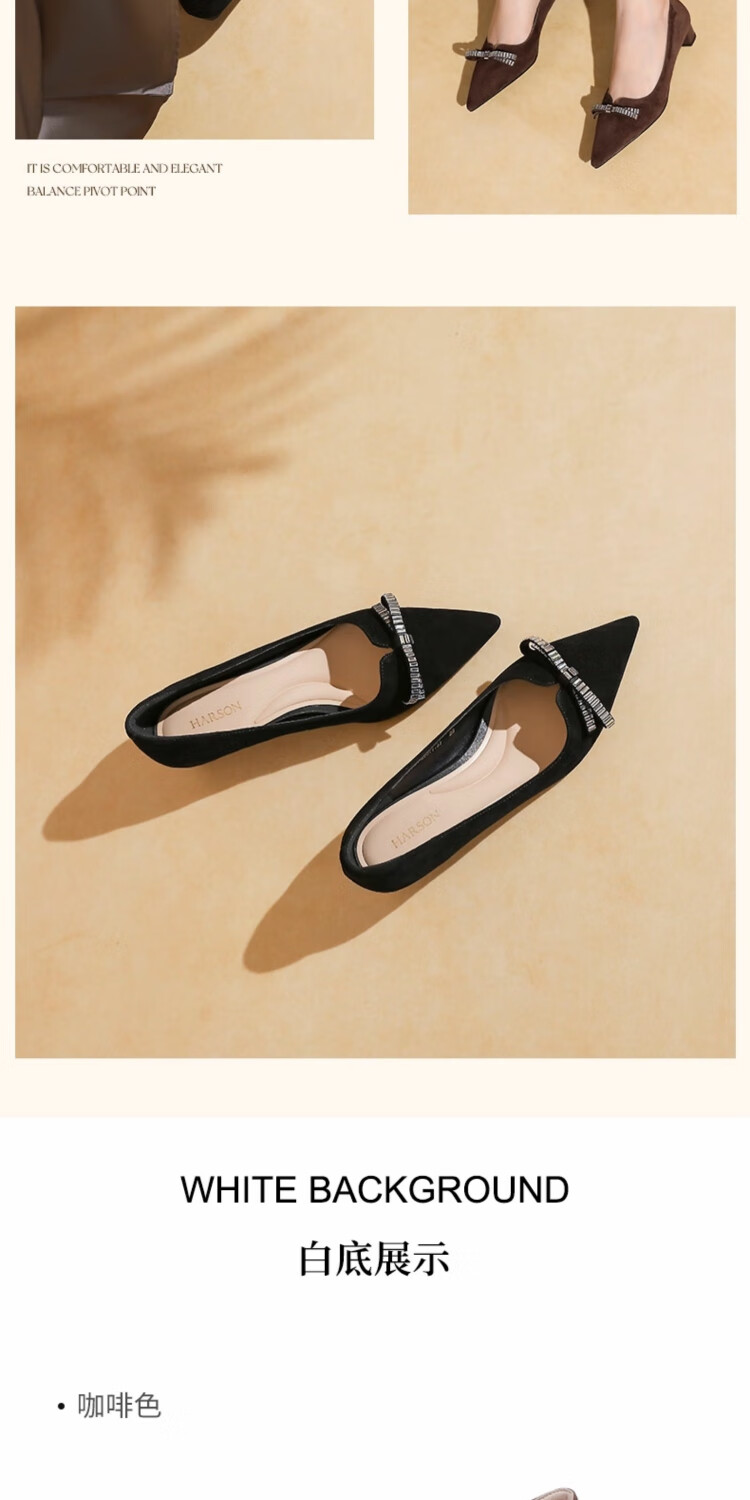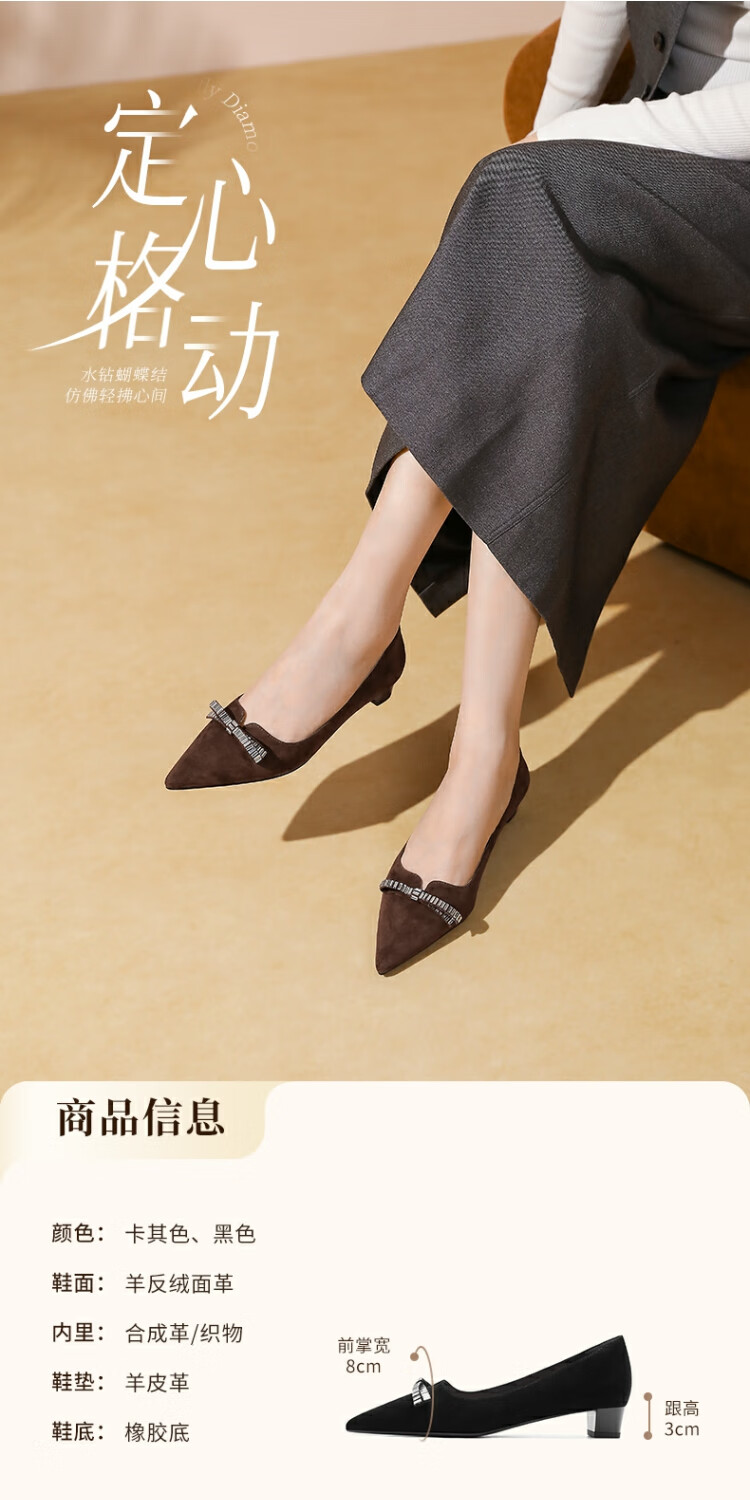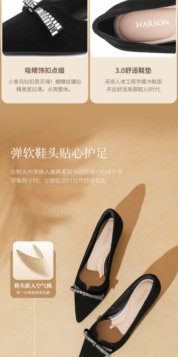 哈森通勤浅口单鞋2025秋季新款水钻蝴蝶结气质粗跟女鞋HL257147 黑色 羊反绒面革 35