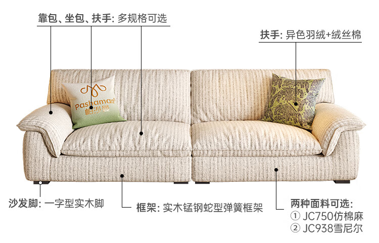 帕沙曼可拆洗布艺沙发小户型客厅简约棉麻双人沙发复古风舒芙蕾 2872ZF 2.6米多人位【全拆洗设计】 棉麻JC750【豪华版】 记忆棉颗粒+绒丝棉+竹炭
