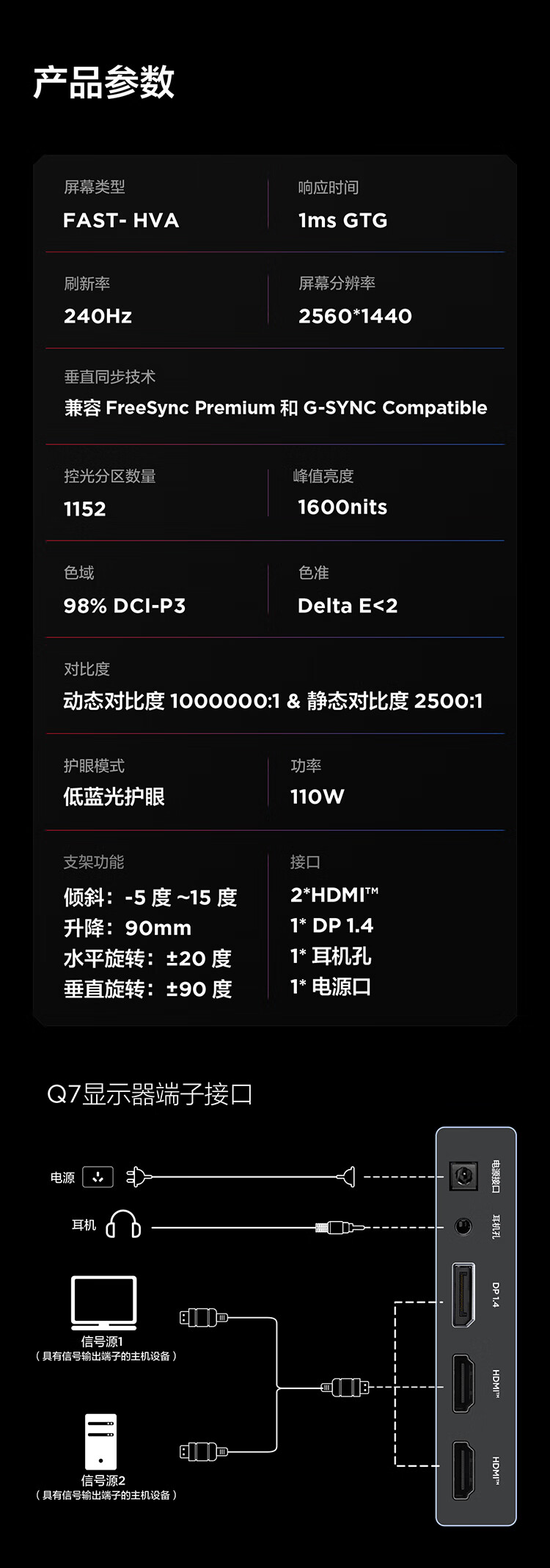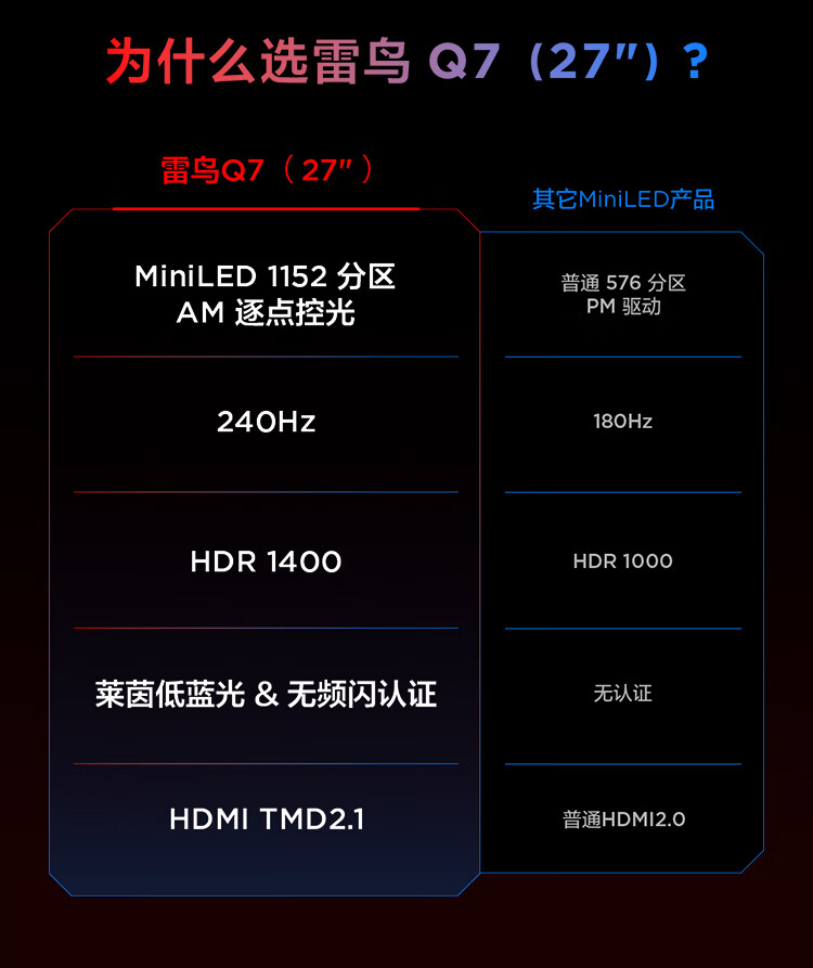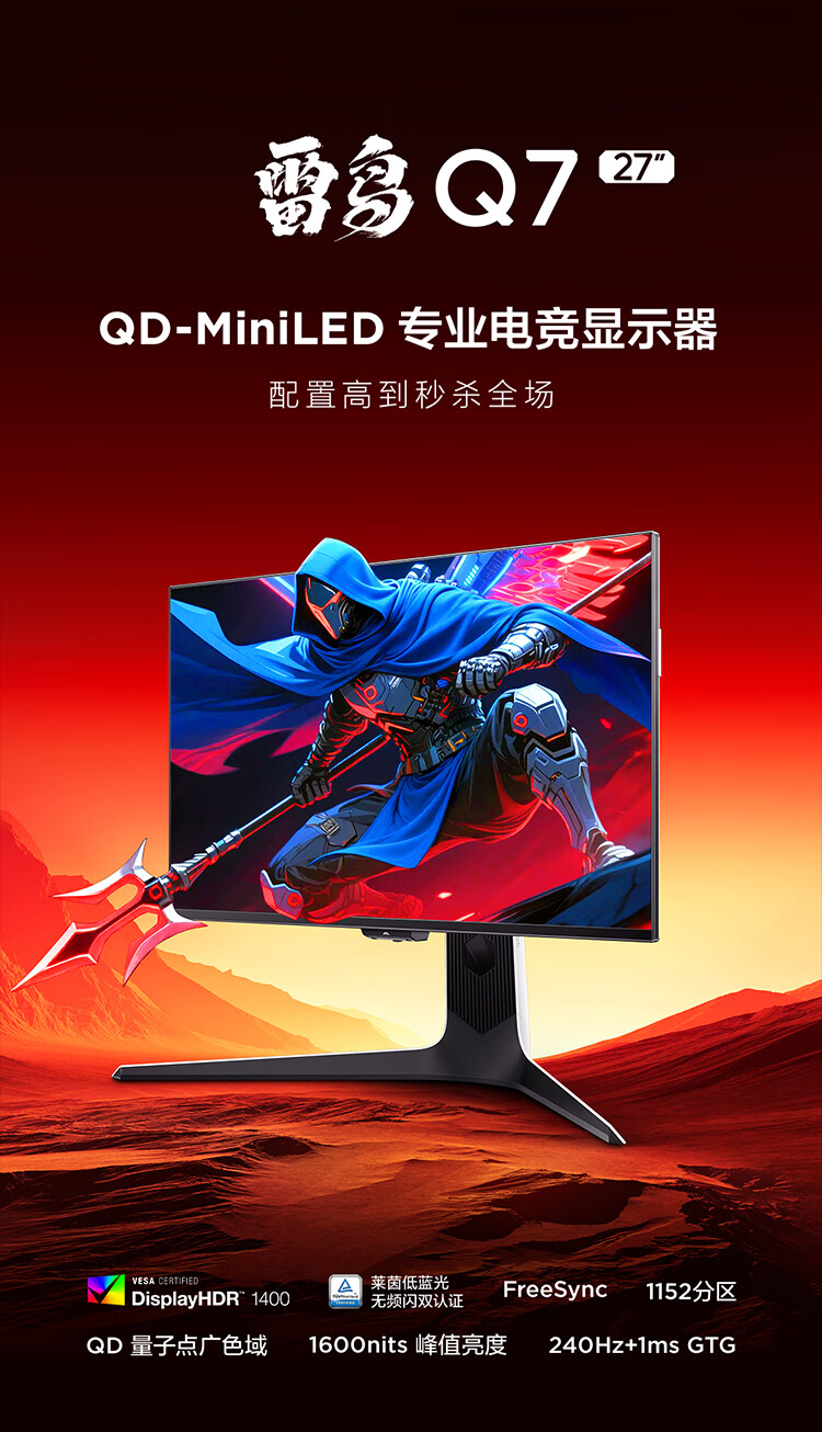 雷鸟Q7 27英寸2K240Hz 1152分区QD-MiniLED高刷电竞显示器 HDR1400 1ms响应 莱茵护眼 PS5游戏显示屏 雷鸟Q7/27英寸直屏/2K240Hz