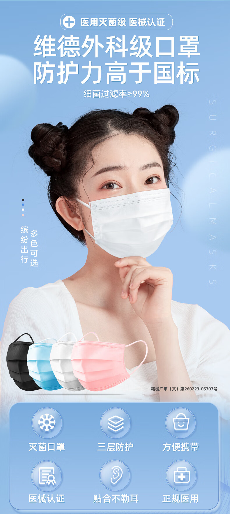 维德(WELLDAY)一次性医用外科口罩防护三层无菌级防细菌防飞沫轻薄透气挂耳式 医用外科灭菌级-粉色【50只】