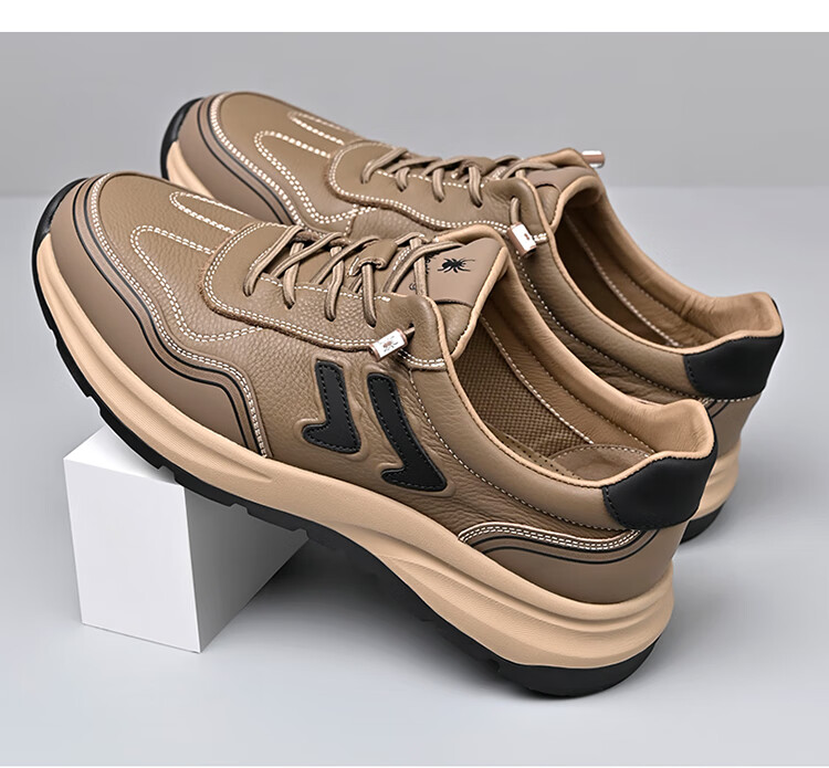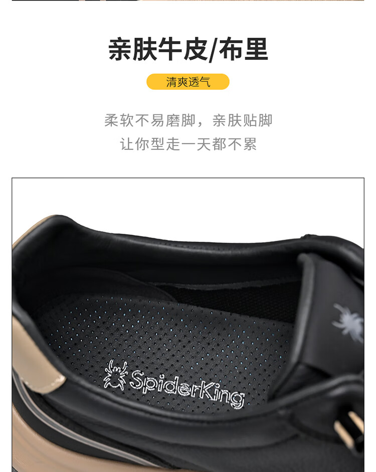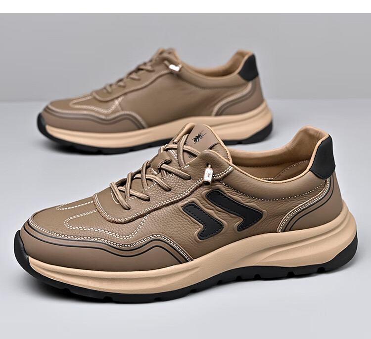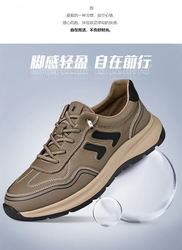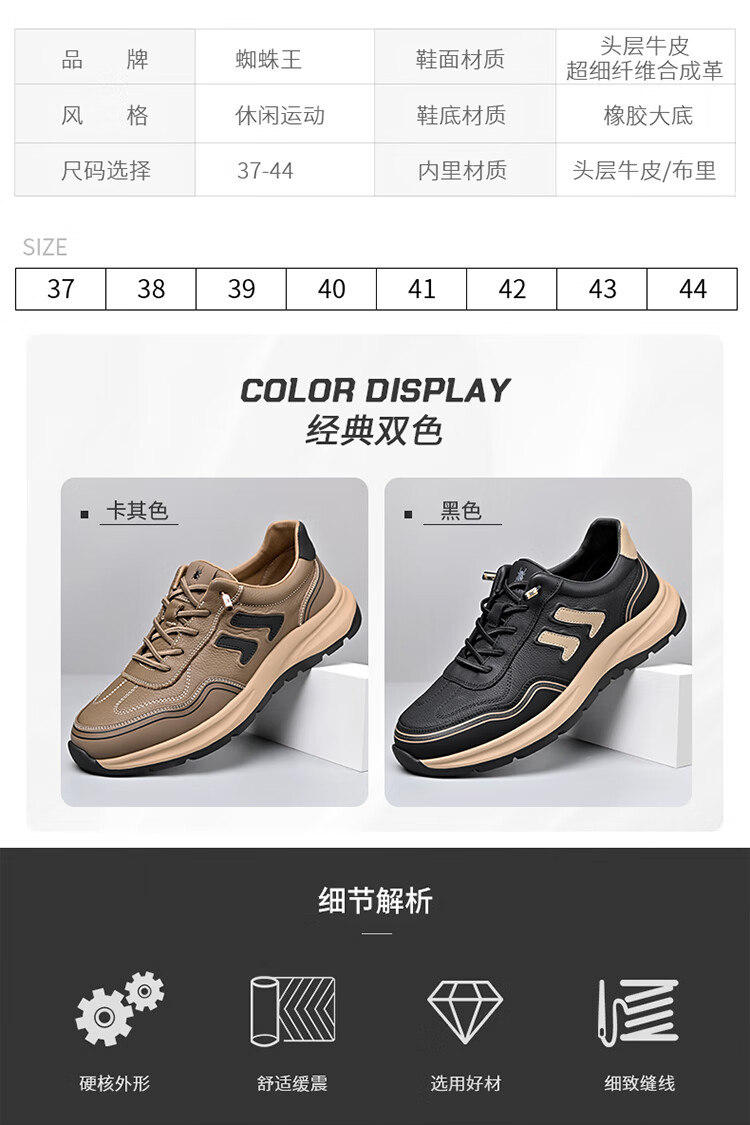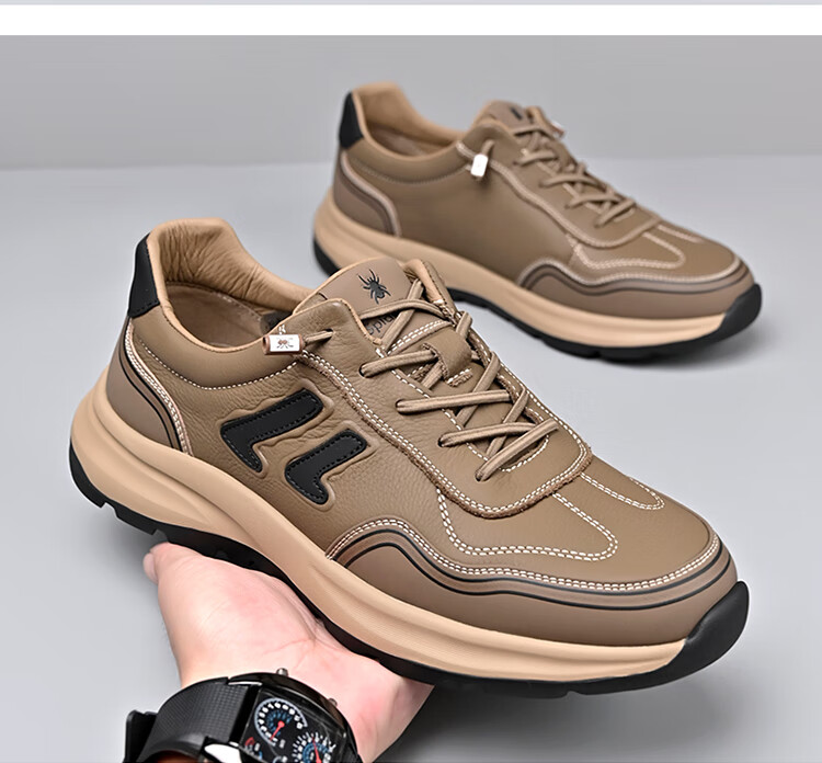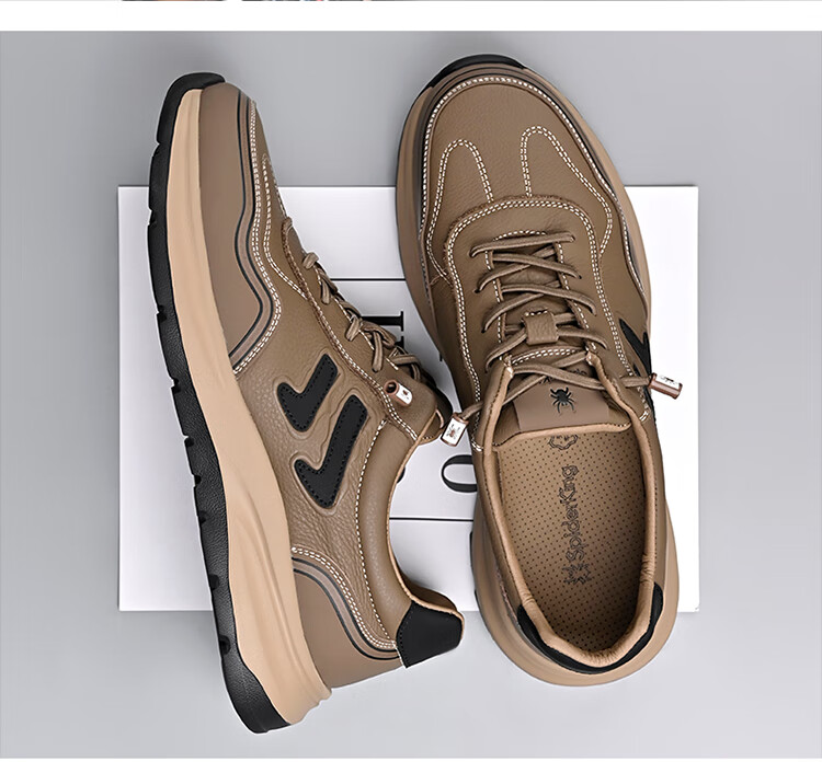 蜘蛛王男鞋春秋季牛皮透气户外运动皮鞋男软底商务休闲鞋 卡其色 40