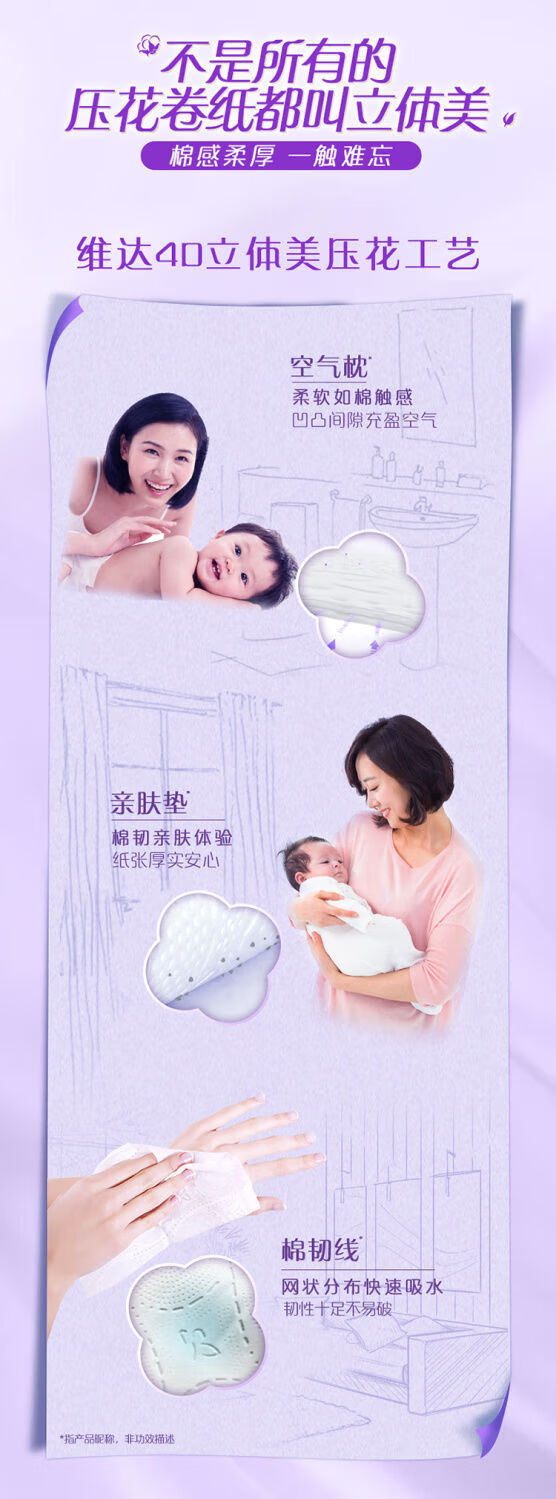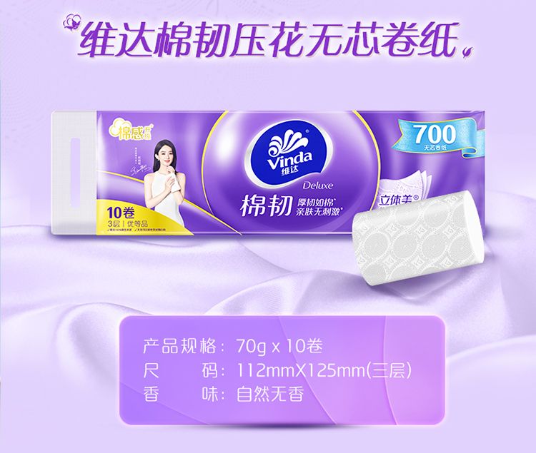维达(Vinda)棉韧立体美卷纸 4层700克厚韧卫生纸厕纸 卷筒纸纸巾hd 3层 70g/卷*10卷 【到手1.4斤】