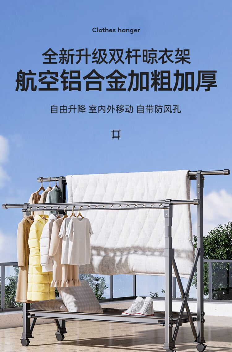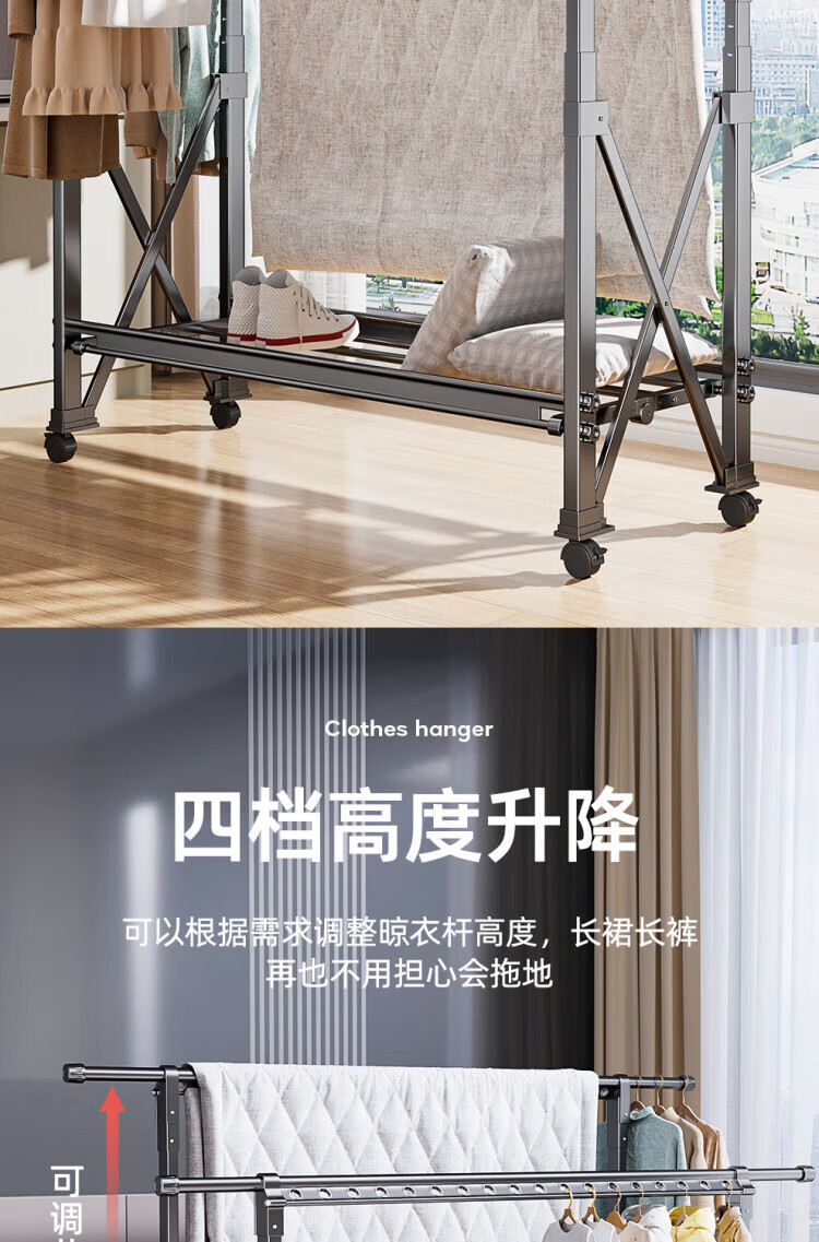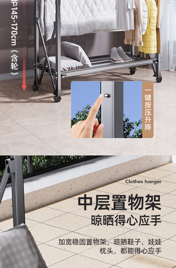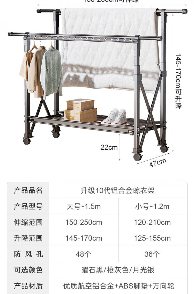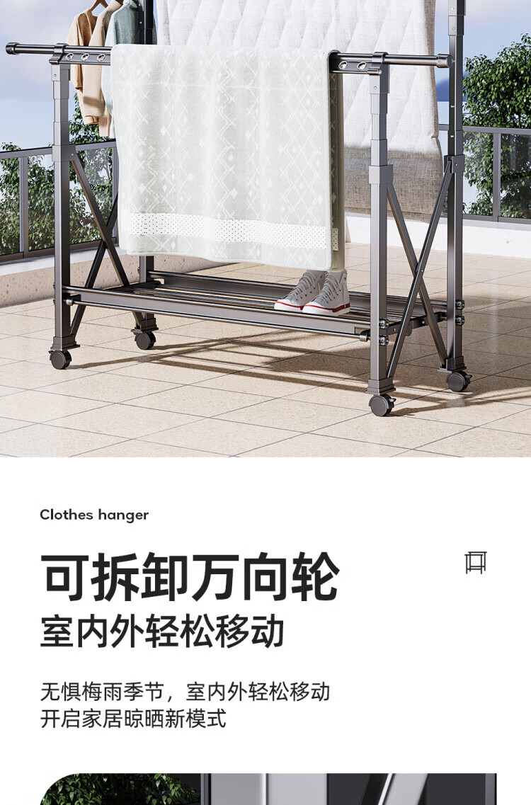 WCZ德国升降晾衣架阳台落地折叠家用室外伸缩凉衣杆户外挂衣服晒被子 枪灰色小号1.2-2.1米+升降4档调节+万向轮