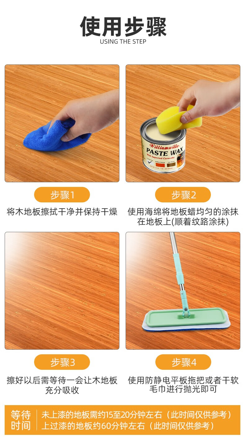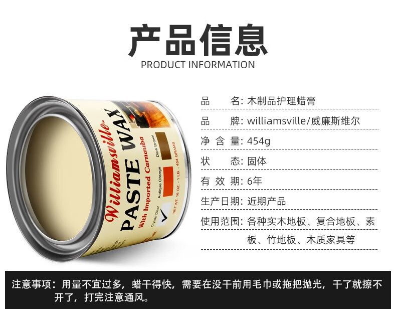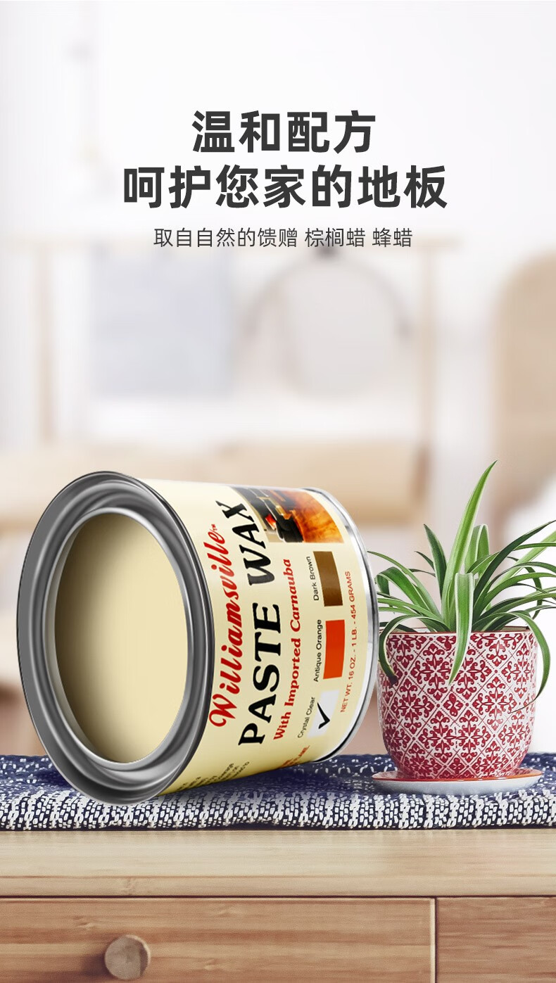 威廉斯维尔(Williamsville)美国原装进口木地板蜡实木复合地板修复打蜡抛光固体棕榈蜡蜂腊 通用透明色454g