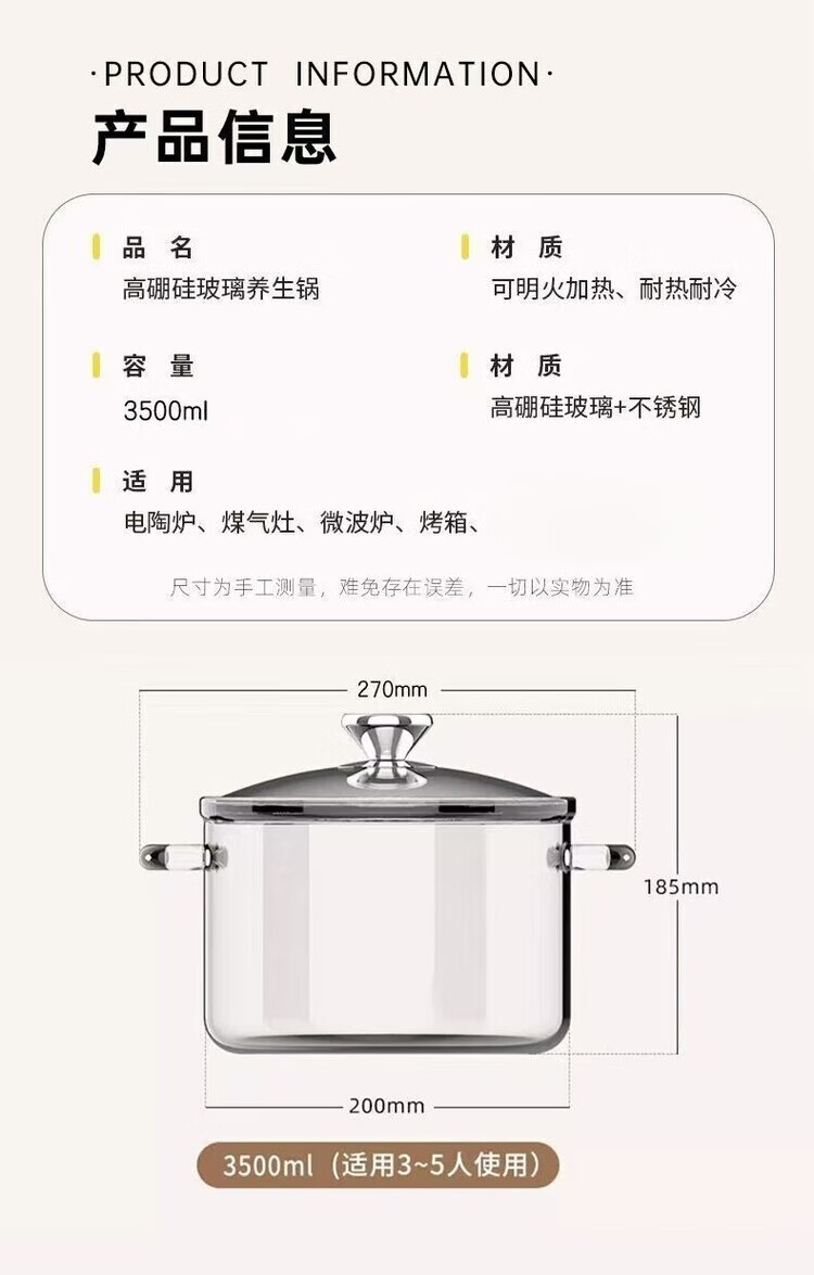 汉泊科高硼硅玻璃锅明火耐高温燃气家用透明双耳炖锅电陶炉加热汤锅 高硼硅玻璃锅【3.5L】 1cm