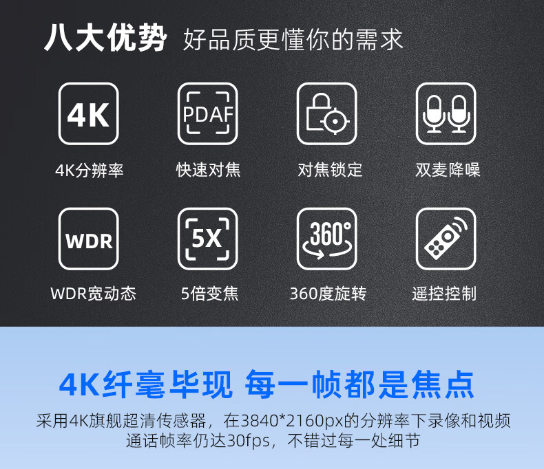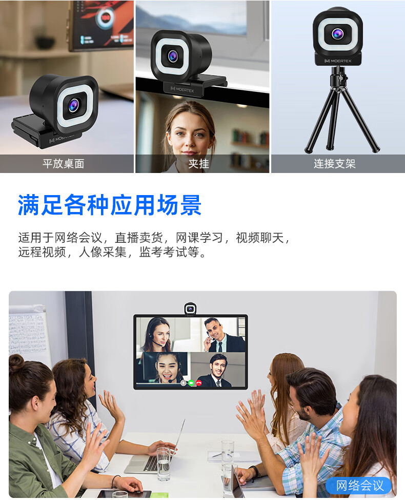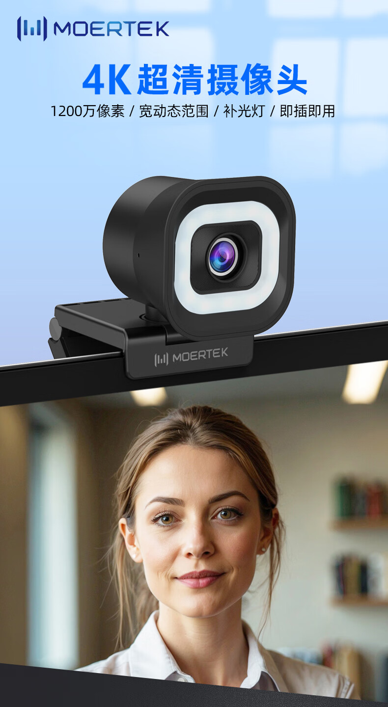Moertek4K超清电脑直播摄像头五档补光美颜摄像头网课家用视频会议带麦克风5倍变焦笔记本台式电脑摄像头 4K 超清1200万像素*免驱动*五档调光+支架